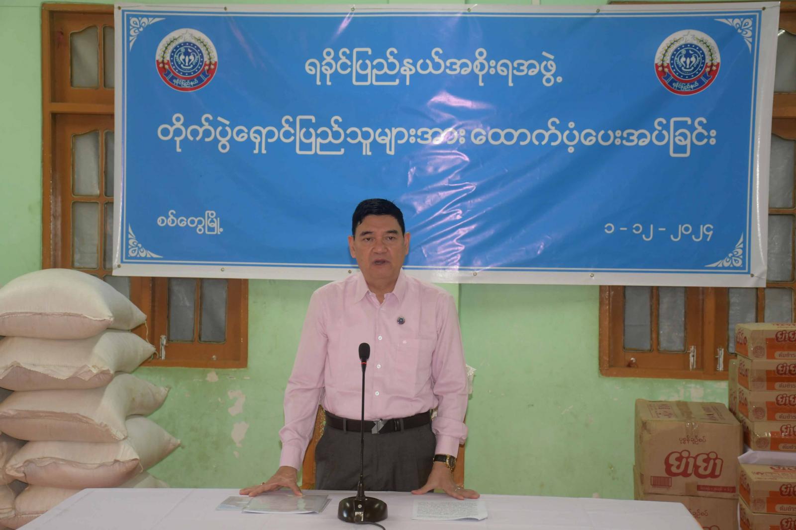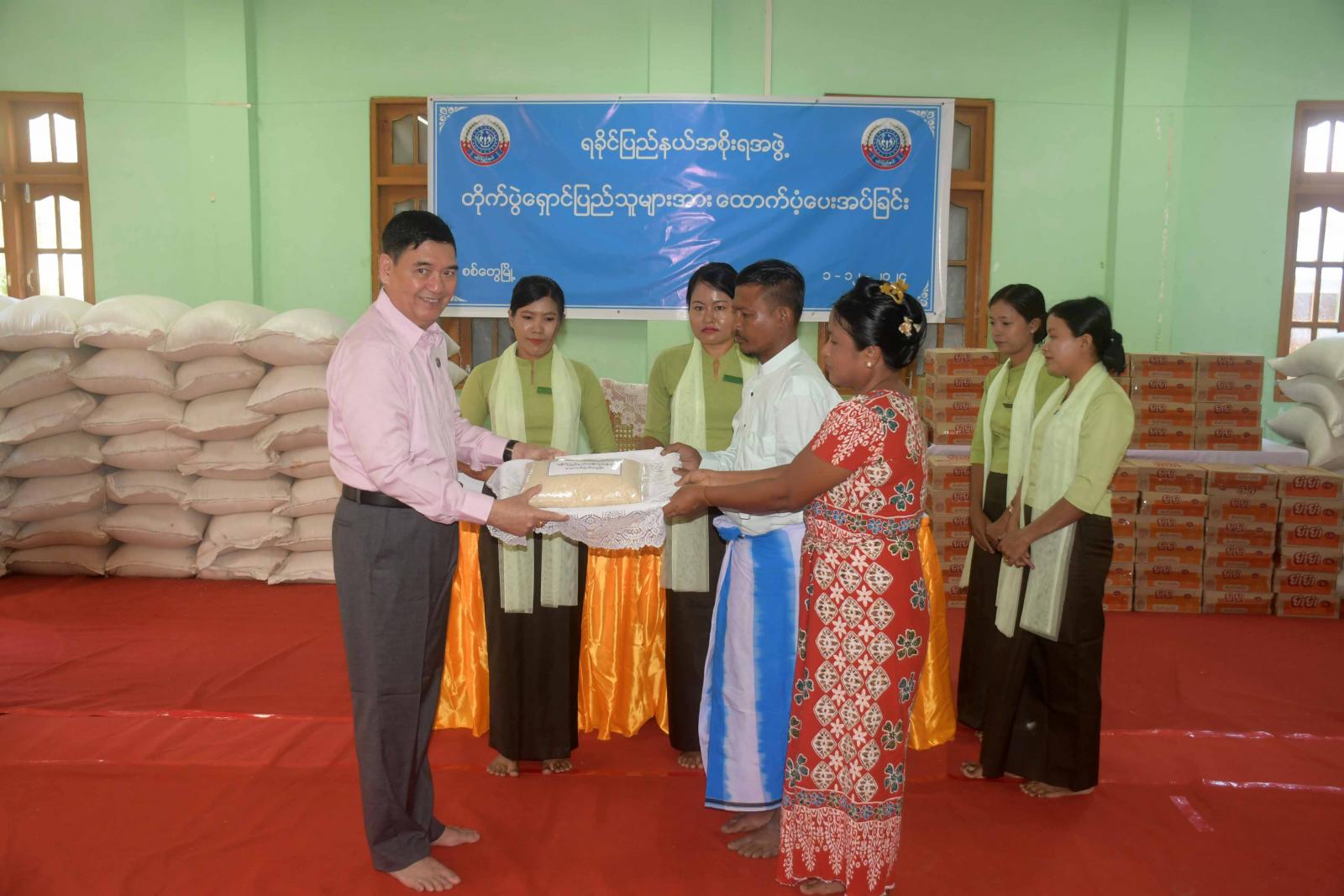 ဆက်လက်၍ ပြည်နယ်ဝန်ကြီးချုပ်နှင့် တာဝန်ရှိသူများက ယာယီနေရပ်စွန့်ခွာတိုက်ပွဲရှောင် ပြည်သူများအတွက် ဆန်ရိက္ခာနှင့် ထောက်ပံ့ပစ္စည်းများကို ပေးအပ်ကြပြီး တိုက်ပွဲရှောင်ပြည်သူတစ်ဦးက ကျေးဇူးတင်စကားပြန်လည်ပြောကြားသည်။ ယင်းနောက် ပြည်နယ်ဝန်ကြီးချုပ်သည် အခမ်းအနားသို့ တက်ရောက်လာကြသူများအား ရင်းရင်းနှီးနှီးလိုက်လံနှုတ်ဆက်ခဲ့သည်။