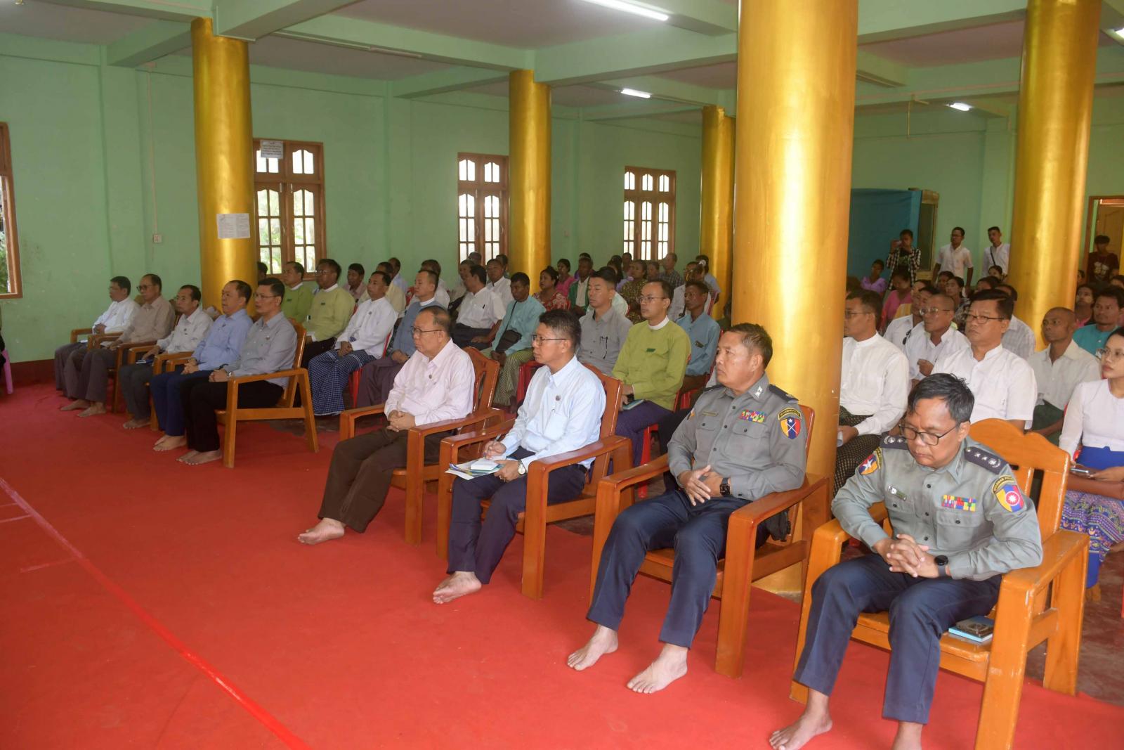 အခမ်းအနားတွင် ရခိုင်ပြည်နယ်ဝန်ကြီးချုပ် ဦးထိန်လင်းက ရခိုင်ပြည်နယ်အတွင်း ၂၀၂၃ ခုနှစ် နိုဝင်ဘာလ ၁၃ ရက်နေ့မှစ၍လုံခြုံရေးအရ တိုက်ပွဲဖြစ်စဉ်များဖြစ်ပွားခဲ့ရကြောင်း၊ ထို့ကြောင့် ဒေသခံပြည်သူများသည် မိမိတို့၏ဒေသများကို ယာယီစွန့်ခွာပြီး စခန်းများတွင်နေထိုင်ခဲ့ကြရကြောင်း၊ ထိုသို့ဖြစ်ပေါ်ရခြင်းသည် ဒေသတည်ငြိမ်အေးချမ်းမှုအားနည်း၍၊ တည်ငြိမ်အေးချမ်းမှုမရှိခြင်းတို့ကြောင့်ဖြစ်ကြောင်း၊ ဒေသတစ်ခုဖွံ့ဖြိုးတိုးတက်ရန်အတွက် တည်ငြိမ်ရေးနှင့်တရားဥပဒေစိုးမိုးရေးသည် အရေးကြီးကြောင်း၊ တည်ငြိမ်အေးချမ်းမှ တရားဥပဒေစိုးမိုးမှုရှိမှ ထိုဒေသသည် ဖွံ့ဖြိုးတိုးတက်မှုကို ဆောင် ရွက်နိုင်မည်ဖြစ်ကြောင်း၊ ရခိုင်ပြည်နယ်ဖွံ့ဖြိုးတိုးတက်ရေးအတွက် ပြည်ထောင်စုမှ နှစ်စဉ်ဘဏ္ဍာရန်ပုံ ငွေများကို ဘီလီယံရာဖြင့်ချီပြီး ခွဲဝေချထားပေးလျက်ရှိကြောင်း၊ ထိုသို့ခွဲဝေချထားခြင်းသည် ဒေသခံ ပြည်သူများအတွက် အခြေခံအဆောက်အဦများဖြစ်သည့် လမ်း၊ တံတား၊ လျှပ်စစ်မီးစသည့် ပြည်သူလူ ထုအကျိုးရှိမည့် ဖွံ့ဖြိုးရေးလုပ်ငန်းများကို လုပ်ဆောင်နိုင်ရန် ချထားပေးခြင်းဖြစ်ကြောင်း၊ ရခိုင် ပြည်နယ်အနေဖြင့် ဆိုင်ကလုန်းမုန်တိုင်းတိုက်ခတ်မှုကြောင့် ပျက်စီးဆုံးရှုံးမှုများ များစွာရှိခဲ့ပြီး ပြန်လည်ထူထောင်ရေးနှင့် ဒေသဖွံ့ဖြိုးရေးလုပ်ငန်းများ လုပ်ဆောင်နေစဉ်အတွင်း လုံခြုံရေးအရ တိုက်ပွဲများ ဖြစ်ပွားခြင်းကြောင့် ဖွံ့ဖြိုးတိုးတက်ရေးလုပ်ငန်းများ လုပ်ဆောင်ခြင်းမှာ နှောင့်နှေးခဲ့ရကြောင်း၊ ထို့ကြောင့် ဒေသတစ်ခုသည် တည်ငြိမ်အေးချမ်းရန်၊ တရားဥပဒေစိုးမိုးရန် အလွန်အရေးကြီးကြောင်း၊ သို့မှသာ မိမိတို့နှင့် ဒေသခံပြည်သူများ၏ လိုအပ်ချက်ဖြစ်သော ဖွံ့ဖြိုးတိုးတက်မှုကို ရရှိမည်ဖြစ်ကြောင်း၊ ယခုအခါ လုံခြုံရေးအရာ ကန့်သတ်ချက်များကြောင့် မိမိတို့ရပ်ရွာများကို စွန့်ခွာပြီး တိုက်ပွဲရှောင်စခန်းများတွင် နေထိုင်ကြရကြောင်း၊ သို့သော်လည်း နိုင်ငံတော်အစိုးရအနေဖြင့် ယာယီ နေရပ်စွန့်ခွာတိုက်ပွဲရှောင်ပြည်သူများအတွက် ဆန်ရိက္ခာနှင့် လိုအပ်သော ထောက်ပံ့ပစ္စည်းများကို ထောက်ပံ့ပေးလျက်ရှိကြောင်း၊ ပြည်နယ်အစိုးရအဖွဲ့ အနေဖြင့်လည်း အလျင်းသင့်လျင်သင့်သကဲ့သို့ ထောက်ပံ့ပေးလျက်ရှိကြောင်း၊ ထို့ကြောင့် ဒေသတည်ငြိမ်အေးချမ်းရန်အတွက် မိမိတို့အစိုးရအဖွဲ့၊ လုံခြုံရေးတပ်ဖွဲ့များအပြင် ဒေသခံပြည်သူများတွင်းလည်း တာဝန်ရှိကြောင်း၊ အားလုံးကလည်း ပူးပေါင်းဆောင်ရွက်ကြရမည်ဖြစ်ကြောင်း၊ မိမိဒေသတည်ငြိမ်အေးချမ်းရေး၊ ဖွံ့ဖြိုးတိုးတက်ရေးအတွက် ပူးပေါင်းဆောင်ရွက်ပေးကြရမည်ဖြစ်ကြောင်း၊ ယာယီစခန်းများတွင် နေထိုင်ကြစဉ်က