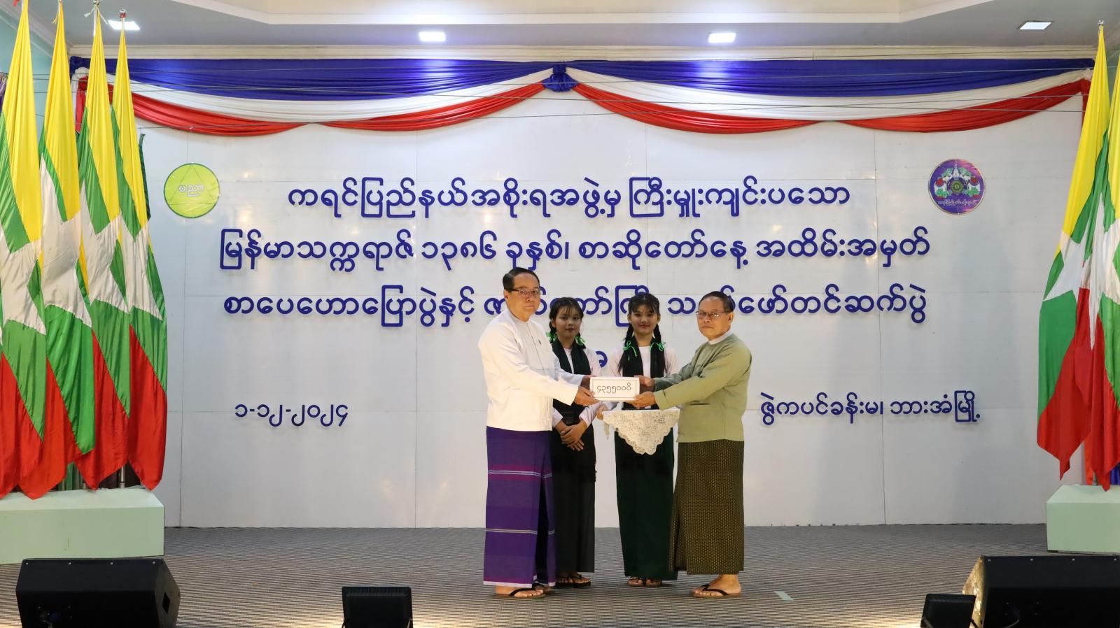 ထို့အပြင် ပြည်နယ်ဝန်ကြီးချုပ်က ကရင်ပြည်နယ်အစိုးရအဖွဲ့မှ စာဆိုတော်နေ့ အထိမ်းအမှတ် စာပေဟောပြောပွဲနှင့် ဇာတ်တော်ကြီးသရုပ်ဖော်တင်ဆက်ခြင်း အကပညာရှင်အနုပညာရှင်များအား ထောက်ပံ့ငွေကျပ်(၄၃၅၅၀၀၀/-) ချီးမြှင့်ပေးခဲ့ရာ ပြည်နယ်ပညာရေးမှူးမှ လက်ခံရယူပြီး ကရင်ပြည်နယ် စာကြည့်တိုက်များဖောင်ဒေးရှင်းဥက္ကဋ္ဌ၊ ဦးသောင်းထွန်းက အချစ်ဦးနှင့်ပြန်ဆုံခြင်းကို နောက်ခံတေးဂီတ သရုပ်ဖော်ဖြင့် ဟောပြောသည်။