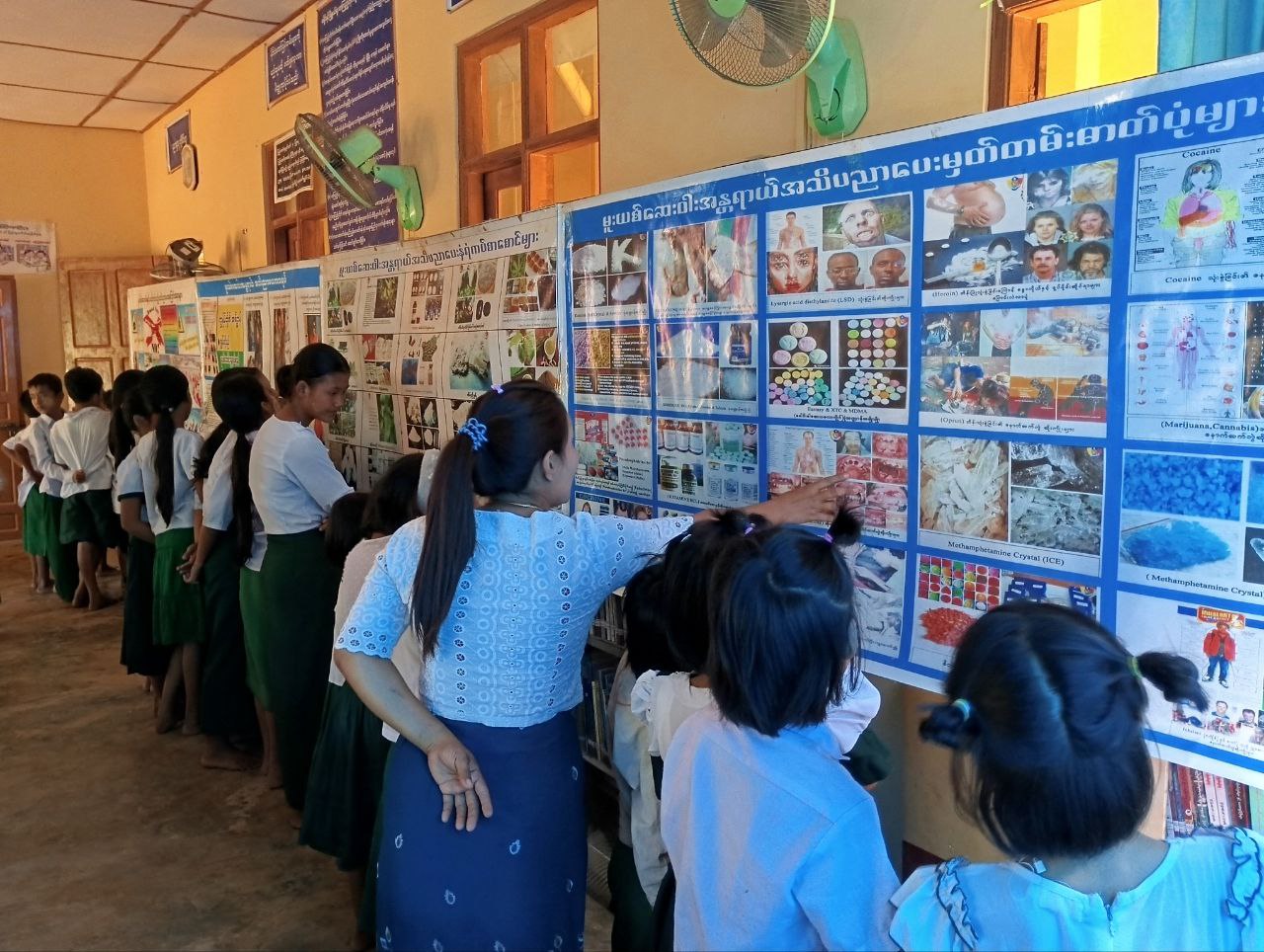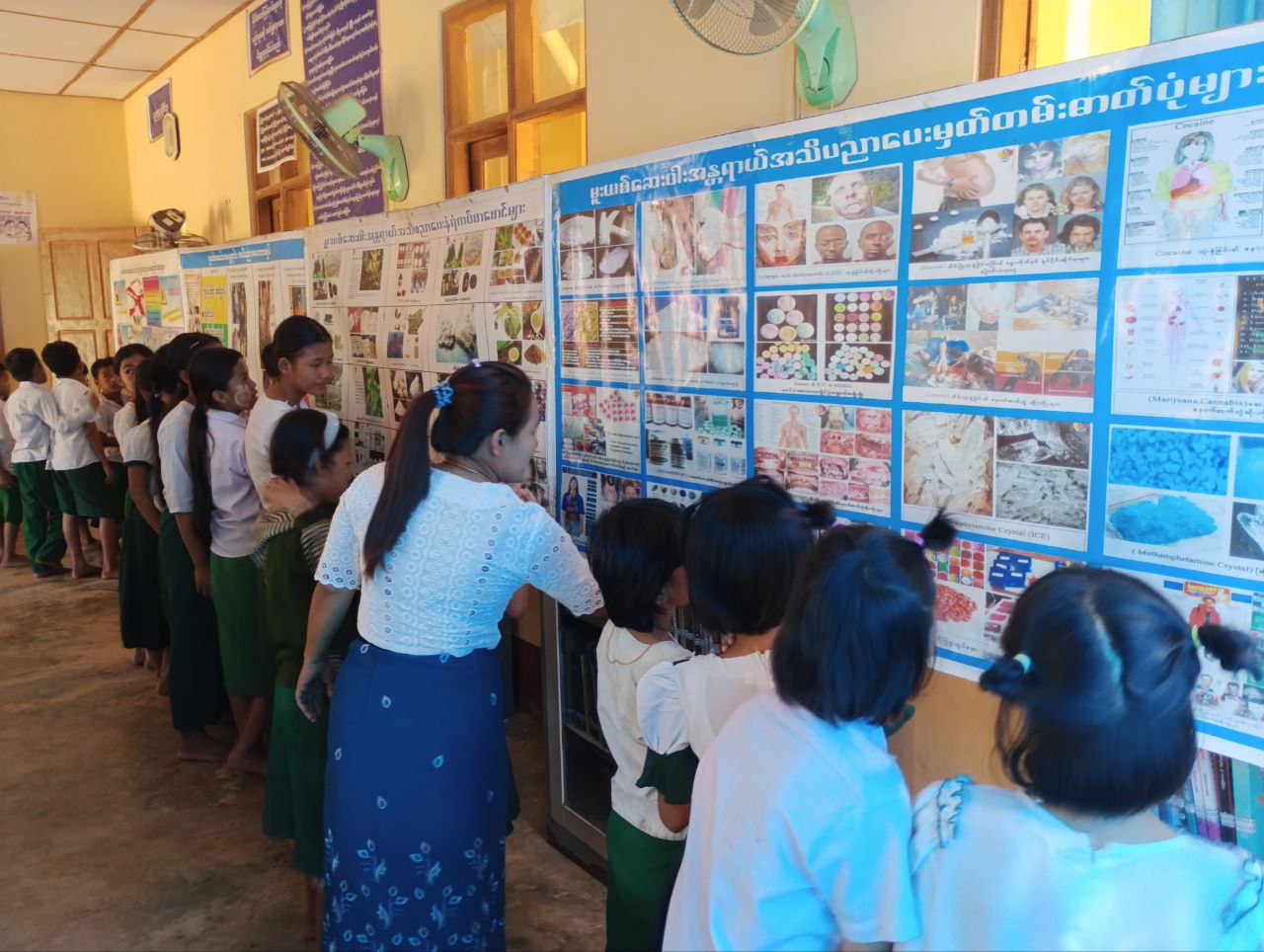 ထို့နောက် မူးယစ်ဆေးဝါးအန္တရာယ်နှင့်ပတ်သက်၍ အသိပညာပေးအကြောင်း အရာများကို အကျယ် တဝင့်သိရှိစေရေးအတွက် နံရံကပ်စာစောင်များ ပြသဆောင်ရွက်ထားမှုကို ကျောင်းသား၊ ကျောင်းသူကလေးငယ်များက စိတ်ဝင်စားစွာကြည့်ရှုလေ့လာမှတ်သားခဲ့ကြောင်း သိရသည်။