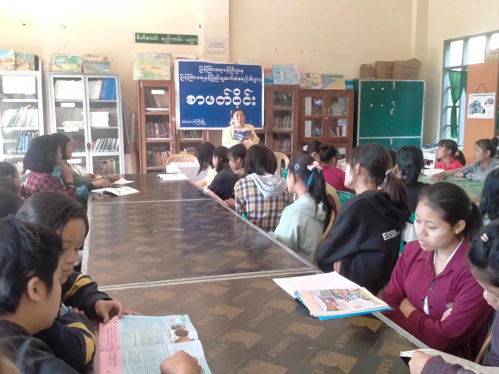 ထိုနောက် ပြန်ကြားရေးနှင့်ပြည်သူ့ဆက်ဆံရေးဦးစီးဌာနမှ ဦးစီးအရာရှိ ဒေါ်နော်လော်မူမှ ဦးဆောင်၍ စာရေးဆရာ သုတေသီဘုန်းမြင့်သွေး၏ လူဘဝမှာအရေးကြီးလှတဲ့ အကျင့်စာရိတ္တစာအုပ်အား စာဖတ်ဝိုင်းဆောင်ရွက်ရာ နော်အေးပုလဲ Grade–9 ကျောင်းသူက ဆင်းရဲလို့ အကျင့်စာရိတ္တ အပျက်မခံနဲ၊ ချမ်းသာတဲအခါ စာရိတ္တမပျက်အောင်ကြိုးစားပါ ခေါင်းစဉ်ငယ်ဖြင့်လည်းကောင်း၊ နော်ကလိုထူး Grade -9 ကျောင်းသူမှ လူရာဝင်တယ်ဆိုတာဘာလဲ၊ သီလနှင့်အသက်ရှင်ပါ၊ အကျင့်စာရိတ္တဆိုတာဘာလဲ ခေါင်းစဉ်ငယ်ဖြင့်လည်းကောင်း၊ စောကပေါ်ဒိုမှ ရိုးရိုးကျင့်မြင့်မြင့်ကြံ၊ စည်းကမ်းဟာအကျင့်စာရိတ္တ၊ လောဘတက်အကျင့်ပျက် ခေါင်းစဉ်ငယ်ဖြင့် ဆွေးနွေးပြီး တက်ရောက်လာသည့် ကျောင်းသူ၊ ကျောင်းသားများက သိရှိလိုသည်များအား အပြန်အလှန်ဆွေးနွေးခဲ့ကြကြောင်း သိရသည်။