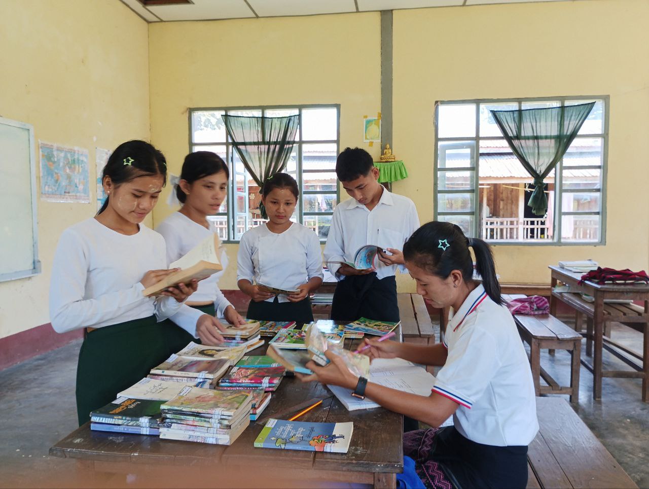 ကရင်ပြည်နယ်၊ ဘားအံခရိုင်၊ ရှမ်းရွာသစ်မြို့တွင် စာကြည့်တိုက်သို့မလာရောက်နိုင်သည့် ဒေသနေပြည်သူများနှင့် ကျောင်းသား၊ ကျောင်းသူများ စာဖတ်ရှိန်မြင့်မားပြီး အသိပညာဗဟုသုတတိုးပွားစေရေးအတွက် နယ်လှည့်စာကြည့်တိုက်စနစ်ဖြင့် စာအုပ်စာစောင်များကို အခမဲ့ငှားရမ်းဆောင်ရွက်ပေးလျက်ရှိရာ ယနေ့နံနက်ပိုင်းက အခြေခံပညာအထက်တန်းကျောင်းတွင် နယ်လှည့်စာကြည့်တိုက်စနစ်ဖြင့် စာအုပ်များကို ငှားရမ်းပေးခဲ့ကြောင်း သိရသည်။
