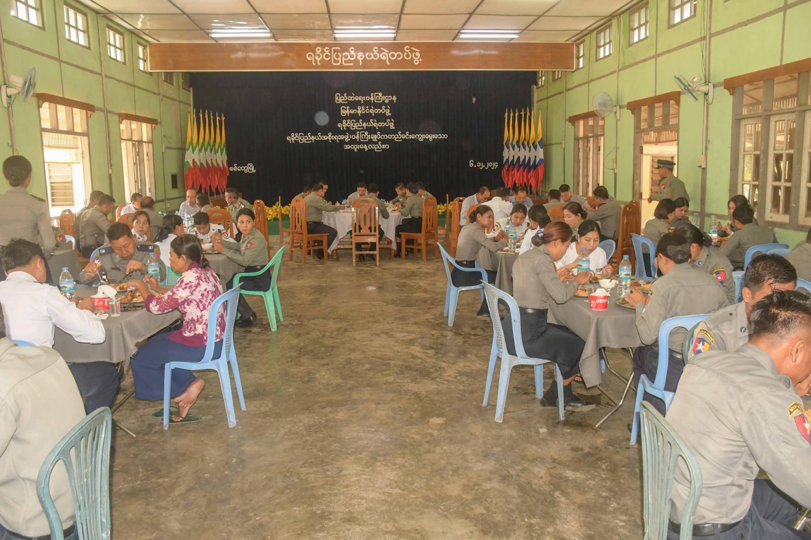 ထို့နောက် ပြည်နယ်ဝန်ကြီးချုပ်နှင့်အဖွဲ့သည် ရခိုင်ပြည်နယ်ရဲတပ်ဖွဲ့၊ ရဲအကူတပ်ဖွဲ့ခွဲ ဂစ္ဆပခန်းမ၌ပြုလုပ်သော အထူးနေ့လယ်စာ စားပွဲသို့တက်ရောက်ကြပြီး ရဲတပ်ဖွဲ့ဝင်များနှင့်အတူ နေ့လယ်စာကို အတူတကွသုံးဆောင်ကြသည်။ ဆက်လက်၍ ပြည်နယ်ဝန်ကြီးချုပ်က အထူးနေ့လယ်စာကျွေးမွေးမှုအတွက် ချီးမြှင့်ငွေကျပ် (၂၃) သိန်းအား ပေးအပ်ချီးမြှင့်ပြီး တပ်ဖွဲ့ဝင်များအား ရင်းရင်းနှီးနှီး တွေ့ဆုံနှုတ်ဆက်ခဲ့ကြောင်း သတင်းရရှိသည်။
