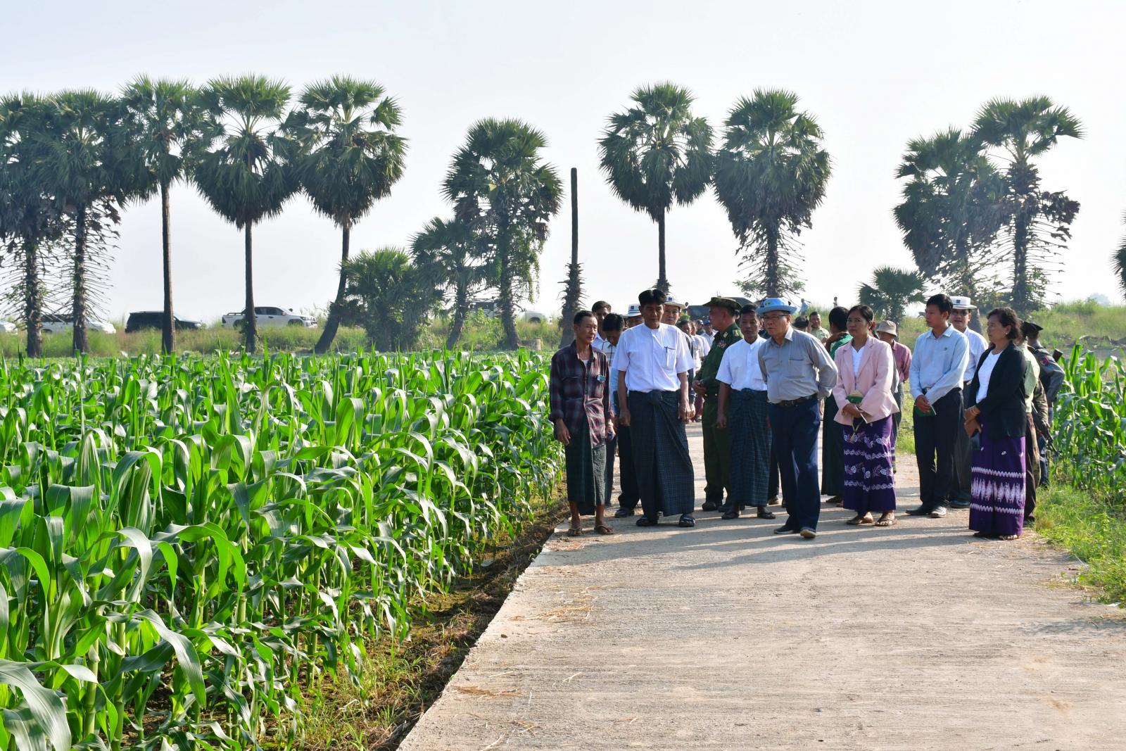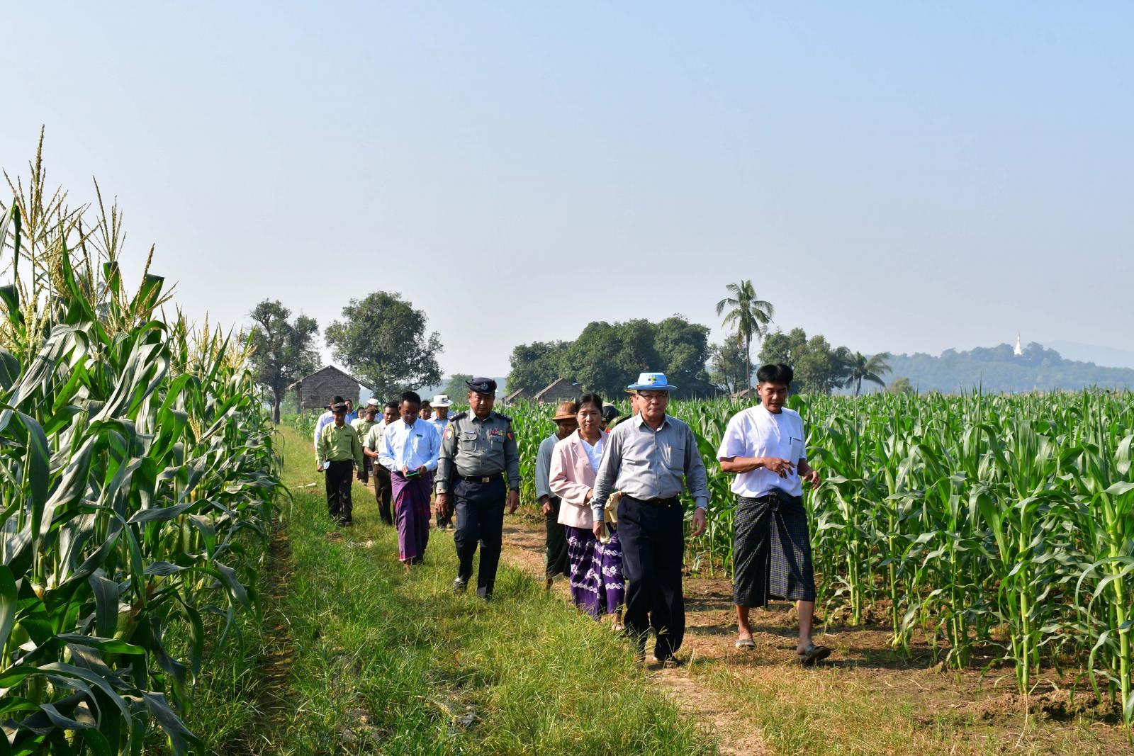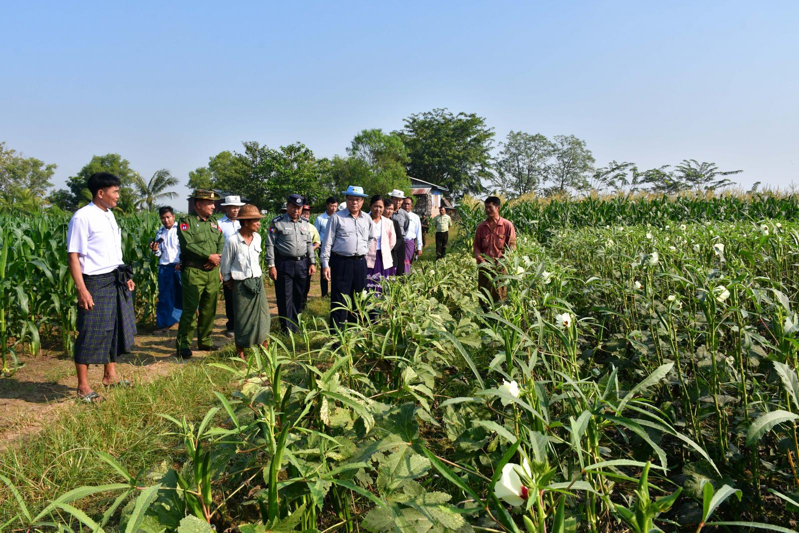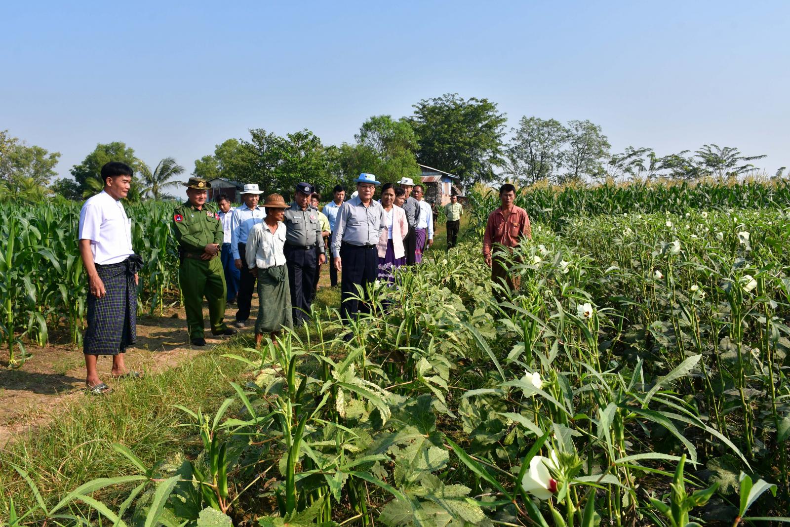 ယင်းနောက် ပြည်နယ်ဝန်ကြီးချုပ်သည် ထုံးအိုင်-မိန်းမလှကျွန်း-ဖအွံ-တောင်သူကုန်း-ခြံကလေး ကျေးရွာချင်းဆက်လမ်း လမ်းဘေးဝဲယာတစ်လျှောက်ရှိ အောင်မြင်ဖြစ်ထွန်းနေသော ပဲအမျိုးမျိုးနှင့် စားဖိုဆောင်သီးနှံဟင်းသီး ဟင်းရွက်စိုက်ခင်းများအား မော်တော်ယာဉ်ဖြင့် ဖြတ်သန်းကြည့်ရှုအားပေးသည်။