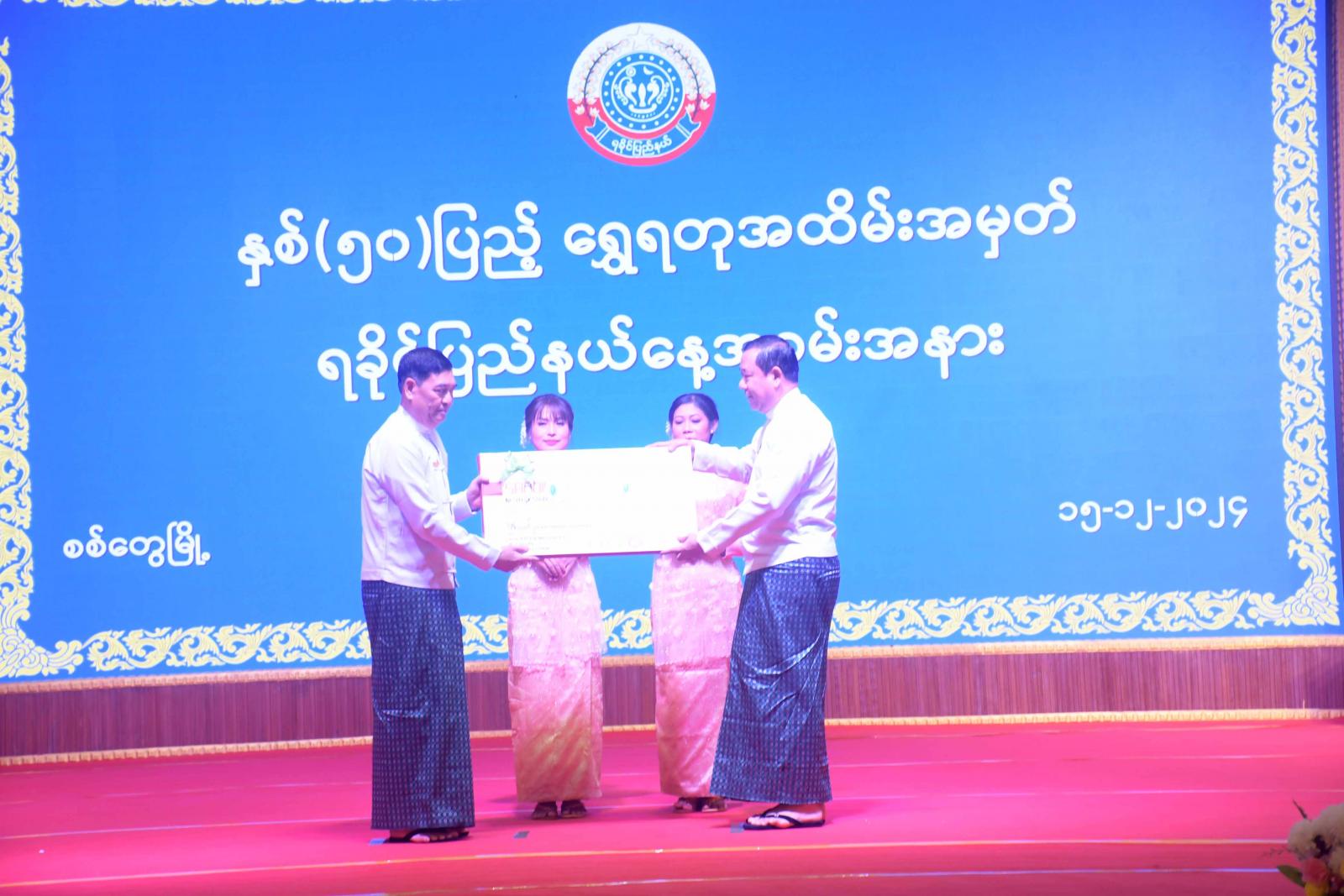 ဆက်လက်၍ နှစ်(၅၀)ပြည့်ရွှေရတုရခိုင်ပြည်နယ်နေ့ကို ဂုဏ်ပြုသောအားဖြင့် ရခိုင်ပြည်နယ် အစိုးရအဖွဲ့၏ ဒေသဖွံ့ဖြိုးတိုးတက်ရေးဆောင်ရွက်မှုများ မှတ်တမ်းဗီဒီယိုကိုပြသပြီး နယ်စပ်ရေးရာဝန်ကြီးဌာနမှ ရခိုင်ပြည်နယ်အတွက် ပေးအပ်သည့် 50 W ဆိုလာနှင့်ဆက်စပ်ပစ္စည်းများအား ပြည်ထောင်စုဝန်ကြီး ဒုတိယဗိုလ်ချုပ်ကြီး ထွန်းထွန်းနောင်ကပေးအပ်ရာ ရခိုင်ပြည်နယ်ဝန်ကြီးချုပ် ဦးထိန်လင်းက လက်ခံရယူသည်။