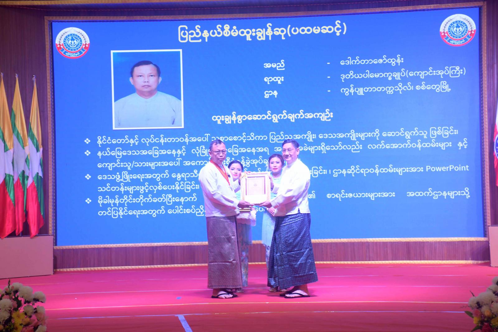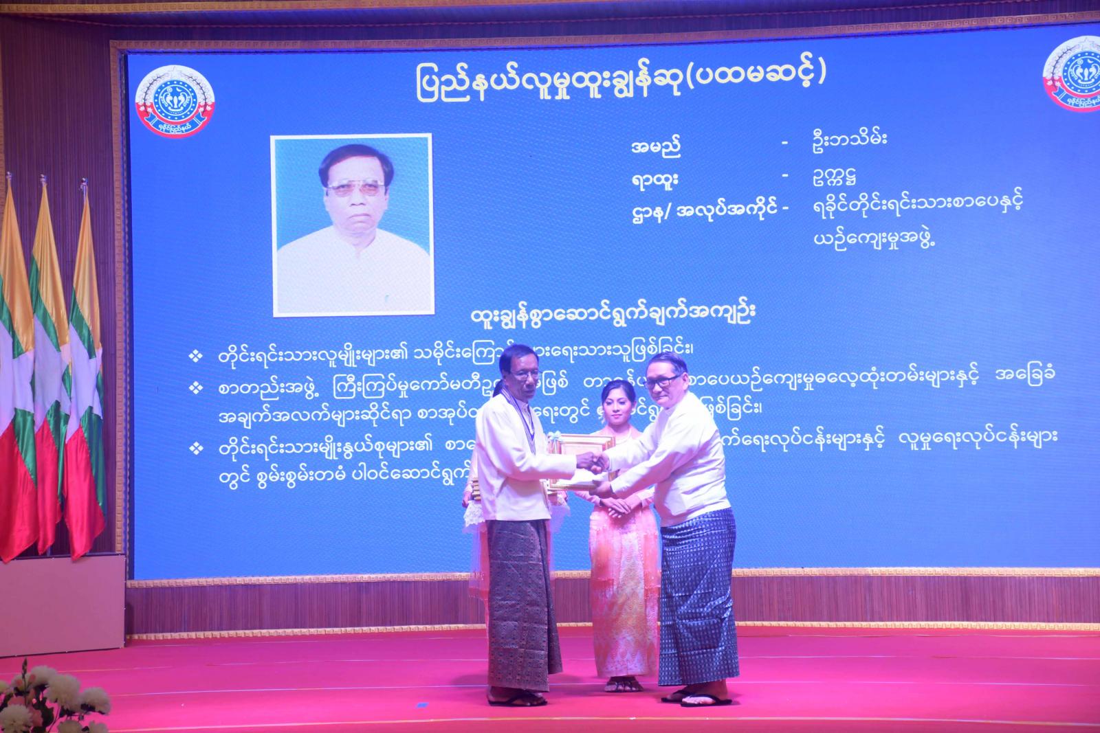 ဆက်လက်၍ ဒုတိယဝန်ကြီးများနှင့် တာဝန်ရှိသူများက ပြည်နယ်စီမံထူးချွန်ဆု (တတိယဆင့်) ရရှိသူများ၊ ပြည်နယ်လူမှုထူးချွန်ဆု (တတိယဆင့်) ရရှိသူများအား ဂုဏ်ထူးဆောင်ဆုလက်မှတ်နှင့် ဂုဏ်ထူးဆောင်ဆုပစ္စည်းများကို ပေးအပ်ချီးမြှင့်ကြသည်။