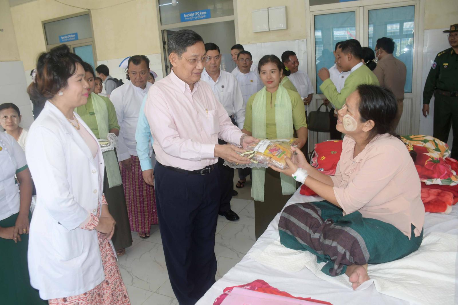 နေ့လယ်ပိုင်းတွင် နိုင်ငံတော်စီမံအုပ်ချုပ်ရေးကောင်စီအဖွဲ့ဝင်များ ဦးဆောင်သောအဖွဲ့သည် စစ်တွေမြို့၊ ခုတင်(၅၀၀)ဆံ့ အထွေထွေရောဂါကုဆေးရုံကြီးသို့ သွားရောက်၍ ဆေးရုံတက်ရောက်ကုသမှုခံယူနေကြသည့် လူနာများအားရင်းရင်းနှီးနှီးတွေ့ဆုံနှုတ်ဆက် အားပေးစကားပြောကြားကာ အာဟာရဖြည့်စွက်စာများ ပေးအပ်ကြသည်။ ဆက်လက်၍ နိုင်ငံတော်စီမံအုပ်ချုပ်ရေးကောင်စီ အဖွဲ့ဝင်များ ဦးဆောင်သောအဖွဲ့သည် အထွေထွေရောဂါကုဆေးရုံကြီးမှ သမားတော်ကြီးများ၊ အထူးကုဆရာဝန်ကြီးများ၊ ဆရာဝန်၊ သူနာပြုများ၊ ဝန်ထမ်းများနှင့်တွေ့ဆုံကြပြီး စားသောက်ဖွယ်ရာများ ပေးအပ်ချီးမြှင့်ကြသည်။