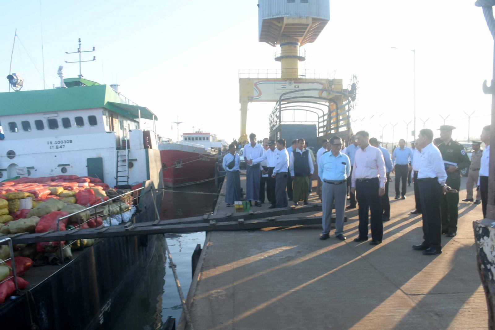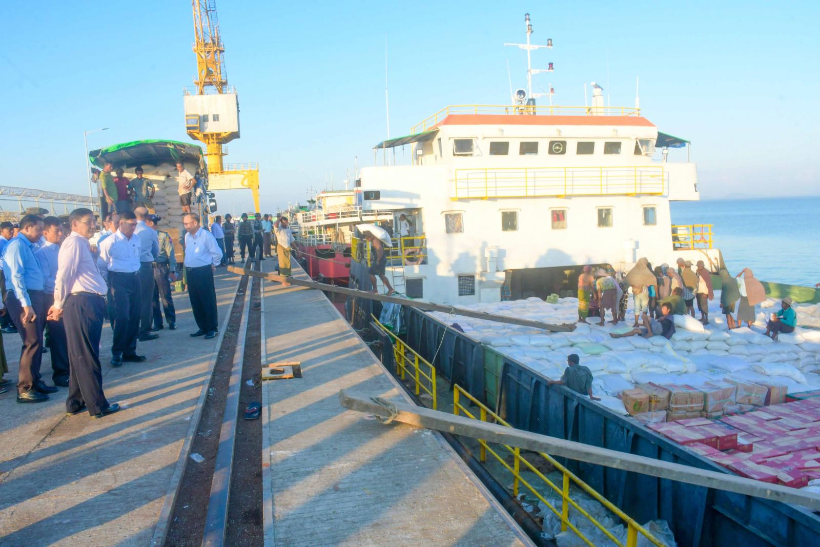 ထို့နောက် နိုင်ငံတော်စီမံအုပ်ချုပ်ရေးကောင်စီအဖွဲ့ဝင်များ ဦးဆောင်သောအဖွဲ့သည် စစ်တွေမြို့၊ ဘက်စုံသုံးဆိပ်ကမ်းတွင် အမျိုးသားသဘာဝဘေးအန္တရာယ်ဆိုင်ရာ စီမံခန့်ခွဲမှုကော်မတီ၏ လမ်းညွှန်မှုအရ ရခိုင်ပြည်နယ်အစိုးရအဖွဲ့နှင့် ရန်ကုန်တိုင်းဒေသကြီးအစိုးရအဖွဲ့၏ စီစဉ်ကြီးကြပ်မှုဖြင့် ရခိုင်ပြည်နယ်သို့ သင်္ဘောများ၊ ရေယာဉ်များဖြင့် လူသုံးကုန်ပစ္စည်းများရောက်ရှိလာမှုကို သွားရောက်ကြည့်ရှုစစ်ဆေးကြသည်။
