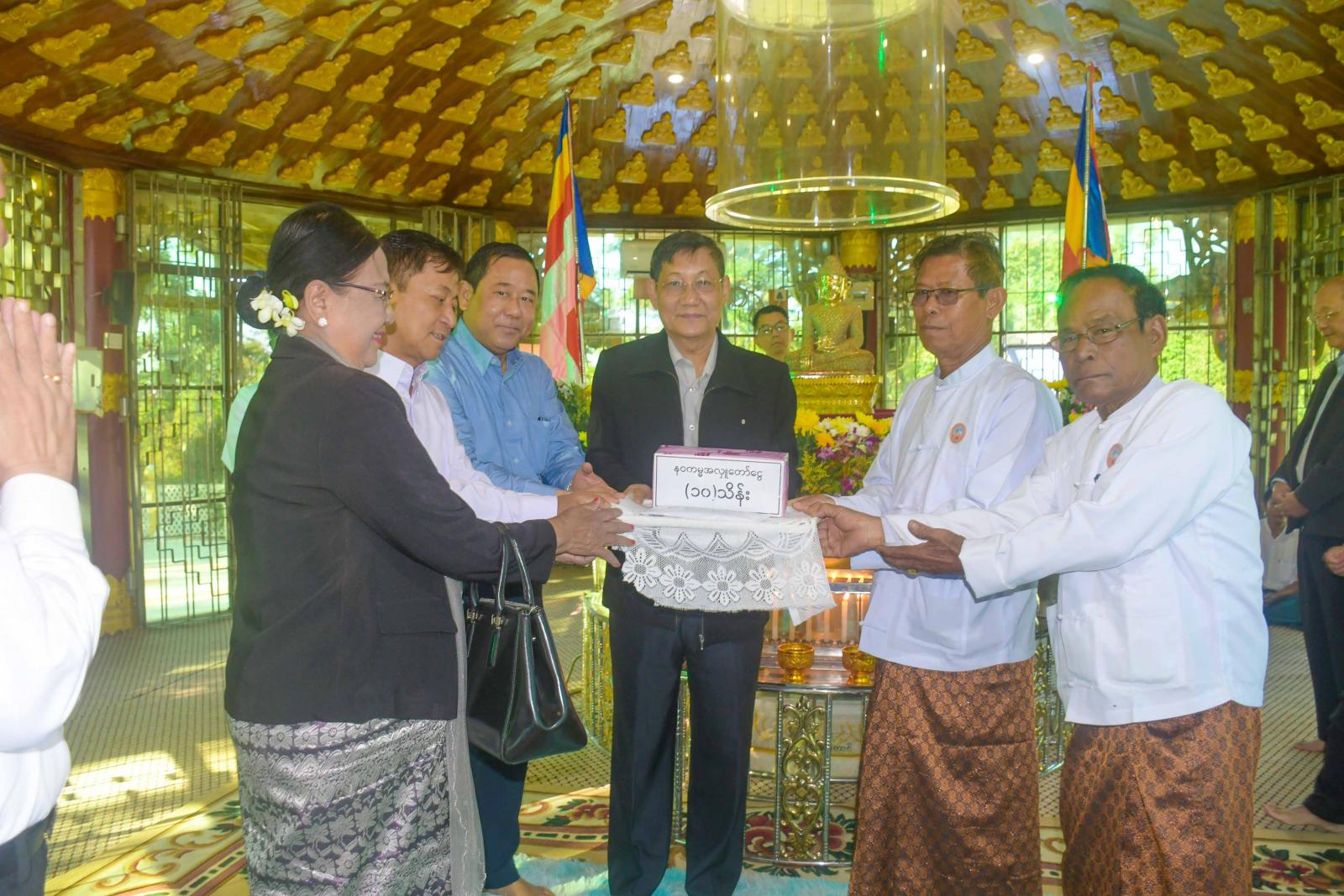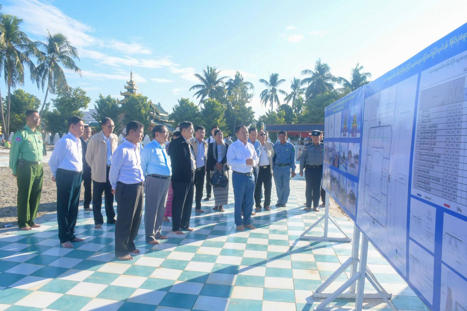 တင်ပြချက်များအပေါ် ပြည်နယ်ဝန်ကြီးချုပ် ဦးထိန်လင်းက ဖြည့်စွက်ရှင်းလင်းတင်ပြရာ နိုင်ငံတော်စီမံအုပ်ချုပ်ရေးကောင်စီအဖွဲ့ဝင်များနှင့် ပြည်ထောင်စုဝန်ကြီးများက လိုအပ်သည်များကို လမ်းညွှန်မှာကြားကြသည်။ ဆက်လက်၍ နိုင်ငံတော်စီမံအုပ်ချုပ်ရေးကောင်စီအဖွဲ့ဝင်များ ဦးဆောင်သောအဖွဲ့သည် မာရဝိဇယဆင်းတုတော်နှင့် အဘယရာဇမုနိဆင်းတုတော် ဖူးမြော်ကြည်ညိုကာ ပန်း၊ ဆီမီး၊ ရေချမ်းများကပ်လှူပူဇော်ကြပြီး လောကာနန္ဒာစေတီတော်မြတ်ကြီးရင်ပြင်တော်၌ နေပူခံကျောက်ပြားခင်းခြင်း လုပ်ငန်းဆောင်ရွက်နေမှုကို လှည့်လည်ကြည့်ရှုစစ်ဆေးကြရာ တာဝန်ရှိသူများက လိုက်လံရှင်းလင်းတင်ပြကြသည်။ ယင်းနောက် လောကာနန္ဒာစေတီတော် ပရိဝုဏ်အတွင်းရှိ ရှေးဟောင်းသမိုင်း ဝင်စကြာမုနိဗုဒ္ဓရုပ်ပွားတော်အား ဖူးမြော်ကြည်ညိုပြီး ပန်း၊ ရေချမ်း၊ ဆီမီးများ ကပ်လှူပူဇော်ကြကာ အလှူငွေများ ထည့်ဝင်လှူဒါန်းခဲ့ကြသည်။