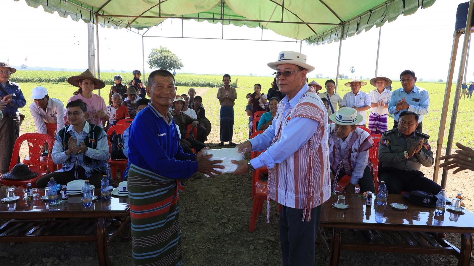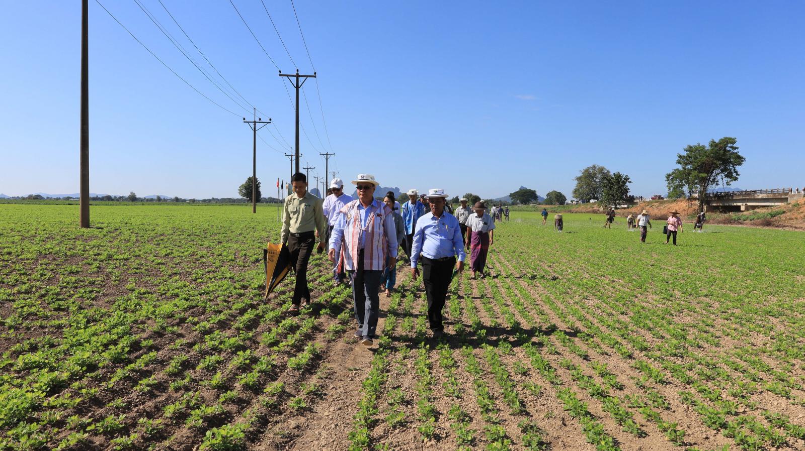 ထို့နောက် ပြည်နယ်ဝန်ကြီးချုပ်နှင့်အဖွဲ့သည် လှိုင်းဘွဲမြို့နယ်၊ ရွှေဂွန်းကျေးရွာရှိ ဆောင်းမြေပဲ အထွက်နှုန်းတိုးတက်ရေး နည်းပညာပေးစံပြစိုက်ခင်းဧက(၁၀၀)၌ တောင်သူများနှင့် တွေ့ဆုံရာ တောင်သူများက ဆီထွက်သီးနှံ ပဲပုတ်၊ မြေပဲနှင့် နေကြာများစိုက်ပျိုး၍ ဒေသစက်ဖြင့် ဆီကြိတ်ခွဲထုတ်လုပ်နေမှု အခြေအနေ၊ ကွင်းအမှတ်-၁၄၅၉ (ဃ)ရွှေဂွန်းကွင်းနှင့် ကွင်းအမှတ်-၁၄၆၀ ကမ်းနီကွင်းတို့တွင် တစ်ကွင်းတစ်ဆက်တည်း ဆီထွက်သီးနှံ ပဲပုတ်နှင့်မြေပဲ (၉၉၀)ဧက စိုက်ပျိုး၍ တစ်ဧကအထွက်နှုန်း ပန်းတိုင်ရည်မှန်းချက် ပြည့်မီကျော်လွန်ထွက်ရှိမှုများကို ဆွေးနွေးတင်ပြကြပြီး ပြည်နယ်ဝန်ကြီးချုပ်က မိမိတို့ပြည်နယ်သည် ဆီဖူလုံမှု ၇၃ ရာခိုင်နှုန်းသာရှိသည့်အတွက် ယခုထက်ပိုမို တိုးချဲ့စိုက်ပျိုးထုတ်လုပ်ရန်နှင့် နှစ်သီးမှသုံးသီးတိုးတက်စိုက်ပျိုးနိုင်ရေး တောင်သူများ၏ လိုအပ်ချက်များကို စဉ်ဆက်မပြတ် ကွင်းဆင်းဖြည့်ဆည်းဆောင်ရွက်ပေးကြရန် တာဝန်ရှိသူများအား မှာကြားကာ မြေပဲစိုက်ခင်းအတွင်း တောင်သူများမှ (ဂျစ်ပ်ဆမ်) ကျောက်မုန့်မြေဩဇာထည့်သွင်းနေမှုနှင့် အောင်မြင်ဖြစ်ထွန်းနေသော မြေပဲနှင့်ပဲပုတ်စိုက်ခင်းများအား လှည့်လည်ကြည့်ရှုအားပေး၍ တောင်သူများအား ဂျစ်ပ်ဆမ်ကျောက်မှုန့်မြေဩဇာများ ပေးအပ်ခဲ့ကြသည်။