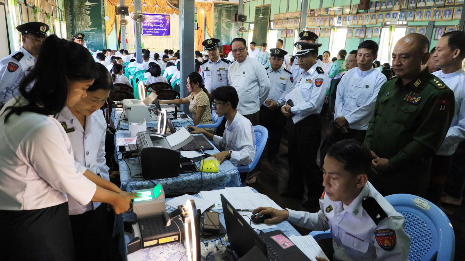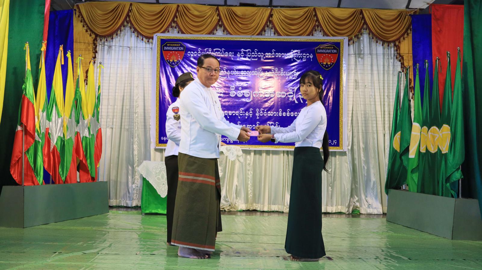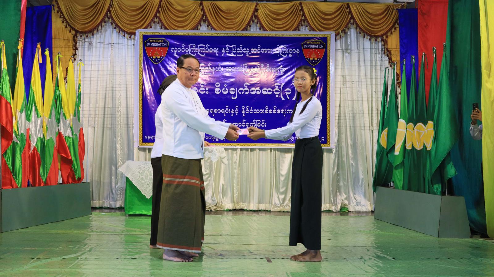အရွယ်ရောက်ပြီးသည့်နိုင်ငံသားအားလုံး ဥပဒေနှင့်အညီ နိုင်ငံသားစိစစ်ရေးကတ်ပြား တစ်မျိုးမျိုးကို ကိုင်ဆောင်နိုင်စေရန် လူဝင်မှုကြီးကြပ်ရေးနှင့်ပြည်သူ့အင်အားဝန်ကြီးဌာန ကရင်ပြည်နယ်၊ ဘားအံမြို့နယ်ဦးစီးမှူးရုံးအနေဖြင့် ပန်းခင်းစီမံချက်အဆင့်(၃)ဖြင့် အိမ်ထောင်စုလူဦးရေစာရင်းနှင့် နိုင်ငံသားစိစစ်ရေးကတ်ပြားများကို ကွင်းဆင်း ဆောင်ရွက်ပေးလျက်ရှိရာ ယနေ့နံနက်ပိုင်းက ဘားအံမြို့၊ အမှတ်(၁)အခြေခံပညာအထက်တန်းကျောင်း မြသံလွင်ခန်းမ၌ နိုင်ငံသားစိစစ်ရေးကတ်ပြားများပေးအပ်ပွဲကို ကျင်းပခဲ့သည်။