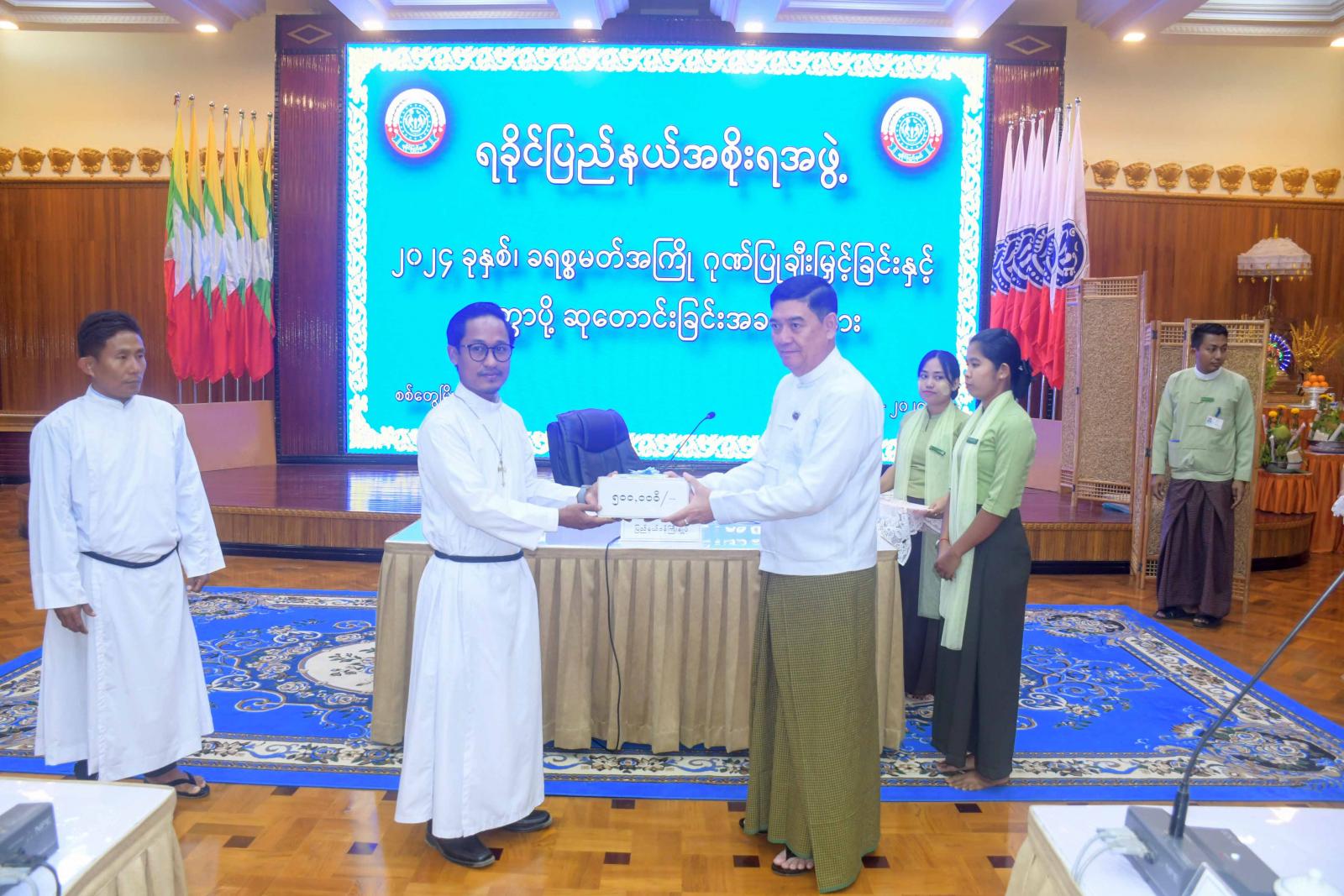 ဆက်လက်၍ နှစ်ခြင်းခရစ်ယာန်အသင်းတော် သိက္ခာတော်ရ ဆရာဦးအောင်လင်းက ခရစ္စမတ် ဆုတောင်းမေတ္တာပို့သပြီး ပြည်နယ်ဝန်ကြီးချုပ် ဦးထိန်လင်းက ခရစ်ယာန်အသင်းတော်များအား ဂုဏ်ပြုချီးမြှင့်ငွေနှင့်ဆန်များကို ပေးအပ်သည်။