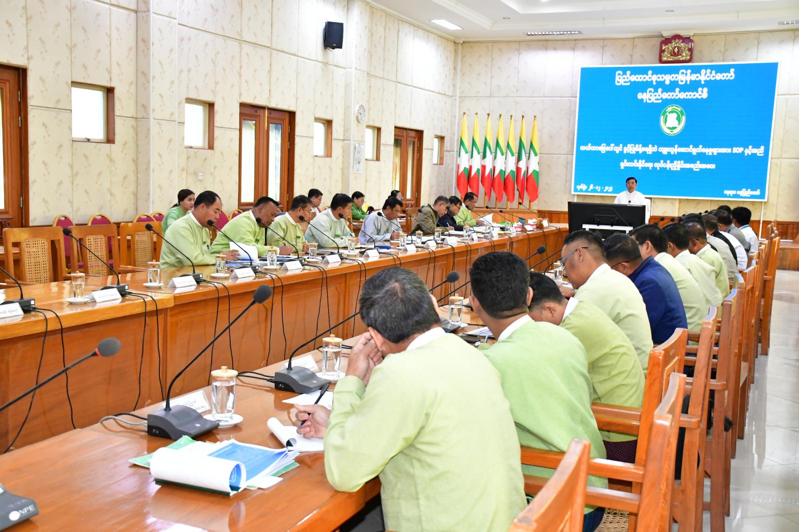 ပြည်ထောင်စုနယ်မြေ၊ နေပြည်တော်အတွင်းရှိ လယ်ယာမြေများပေါ်တွင် ခွင့်ပြုမိန်မရှိဘဲ ကျူးလွန်ဆောင်ရွက်နေမှုများအား SOPနှင့်အညီရှင်းလင်းနိုင်ရေး လုပ်ငန်းညှိနှိုင်းအစည်းအဝေးကို ယမန်နေနံနက်ပိုင်းက နေပြည်တော်ကောင်စီရုံး အစည်းအဝေးခန်းမ (၁) ၌ ကျင်းပရာ နေပြည်တော်ကောင်စီဥက္ကဋ္ဌ ဦးသန်းထွန်းဦး၊ နေပြည်တော်ကောင်စီဝင် ဗိုလ်မှူးကြီးရဲမိုး၊ နေပြည်တော်အဆင့် ဌာနဆိုင်ရာများ၊ ခရိုင်/မြို့နယ်စီမံအုပ်ချုပ်ရေးအဖွဲ့ဥက္ကဋ္ဌများ တက်ရောက်ကြသည်။