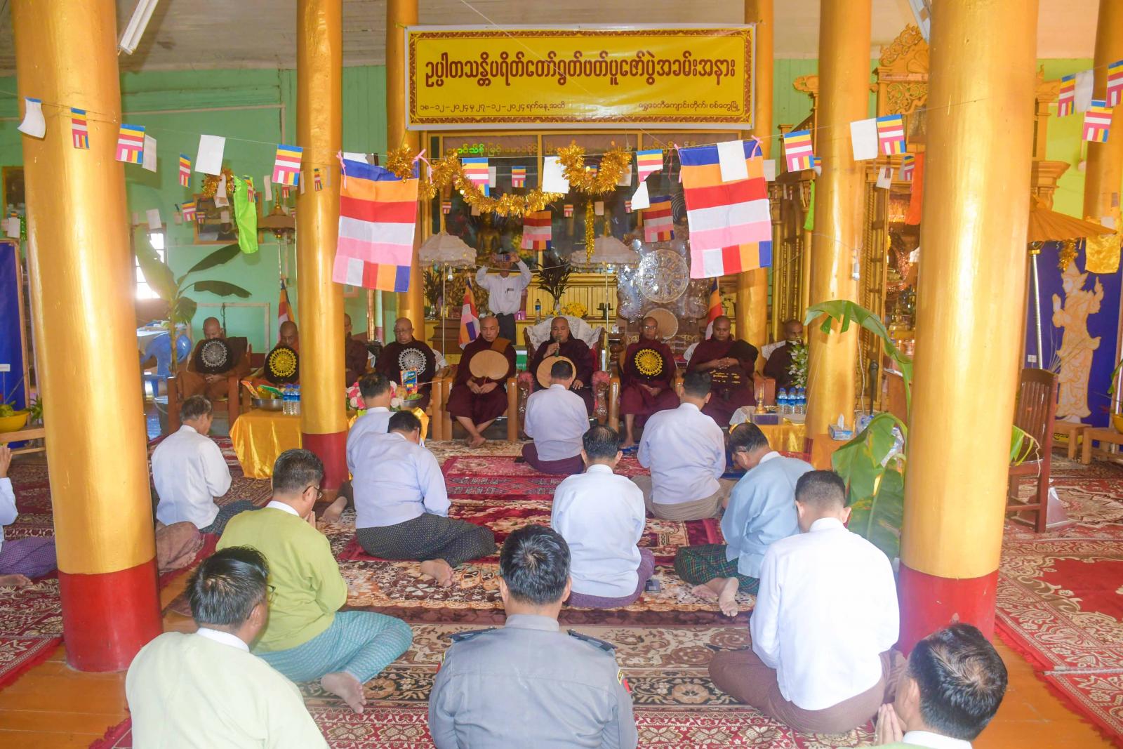 ဦးစွာအခမ်းအနားကို ကြွရောက်တော်မူကြသော ဆရာတော်သံဃာတော်များနှင့် ပြည်နယ်ဝန်ကြီးချုပ်အမှူးပြုသော ဧည့်ပရိသတ်များက နမောတဿသုံးကြိမ်ရွတ်ဆို ဘုရားကန်တော့၍ အခမ်းအနားကိုဖွင့်လှစ်ကြပြီး ရွှေစေတီပရိယတ္တိစာသင်တိုက်ပဓာနနာယက ပြည်နယ်ဘုန်းတော်ကြီး ကျောင်းပညာသင်ကြားမှုကြီးကြပ်မှု အဖွဲ့အတွင်းရေးမှူး၊ အဂ္ဂမဟာသဒ္ဓမ္မဇောတိကဓဇ ဒေါက်တာဘဒ္ဒန္တအရိယဝံသထံမှ ပြည်နယ်ဝန်ကြီးချုပ် အမှူးပြုသော ဧည့်ပရိသတ်များက ငါးပါးသီလခံယူ ဆောက်တည်ကြသည်။ ဆက်လက်၍ သံဃာတော်အရှင်သူမြတ်များက မေတ္တသုတ်ပရိတ်တရားတော်များ ချီးမြှင့်တော်မူကြပြီး ပြည်နယ်ဝန်ကြီးချုပ်နှင့် ပြည်နယ်အစိုးရအဖွဲ့ဝင်များက သံဃာတော်အရှင်သူမြတ်များအား လှူဖွယ်ဝတ္ထုများဆက်ကပ်လှူဒါန်းကြ သည်။ ထို့နောက် ဒေါက်တာ ဘဒ္ဒန္တ အရိယဝံသထံမှ ပြည်နယ်ဝန်ကြီးချုပ်အမှူးပြုသော ဧည့်ပရိသတ်များက အနုမောဒနာတရား နာယူကြကာ လှူဒါန်းမှုအစုစုအတွက် ရေစက်သွန်းချအမျှပေးဝေခဲ့ကြပြီး ပြည်နယ် သာသနာရေး မှူးရုံးမှတာဝန်ရှိသူများက နတ်ဗြဟ္မာများအား ပြန်လည်ပို့ဆောင်ပေးကြသည်။