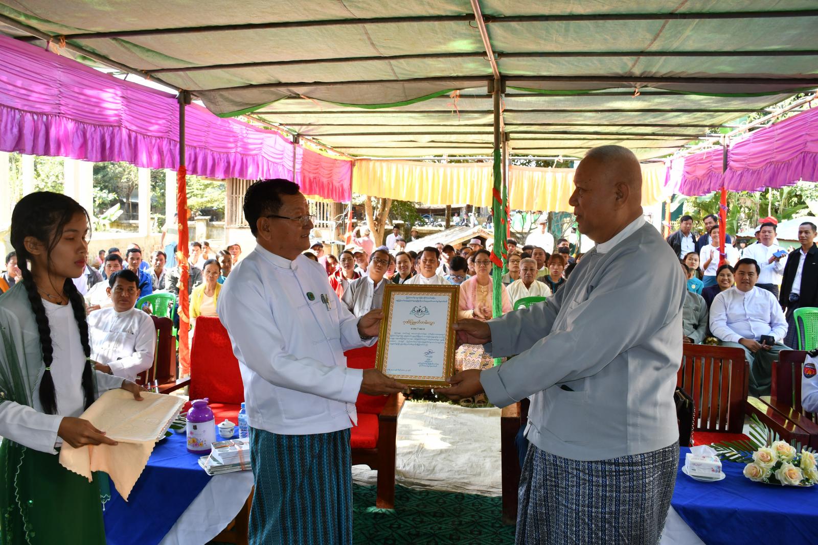 ယင်းနောက် နေပြည်တော်ကောင်စီဝင် ဦးမြင့်စိုးက အလှူရှင်များအား ဂုဏ်ပြုမှတ်တမ်းလွှာများ ပေးအပ်ရာ တောင်ညိုကျေးရွာအုပ်စု အုပ်ချုပ်ရေးမှူး ဦးဇော်မင်းထိုက်က ကျေးဇူးတင်စကား ပြန်လည်ပြောကြားသည်။
