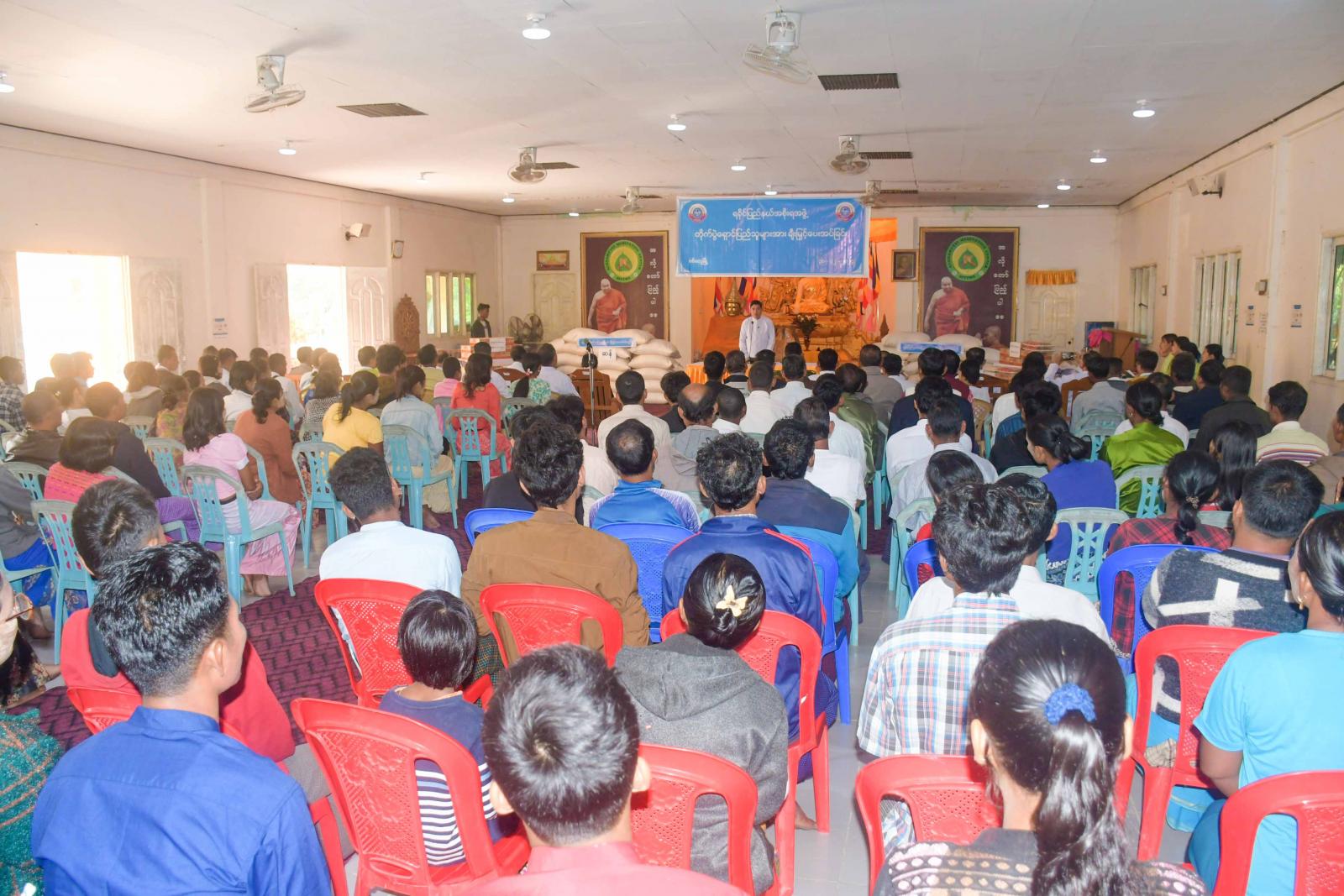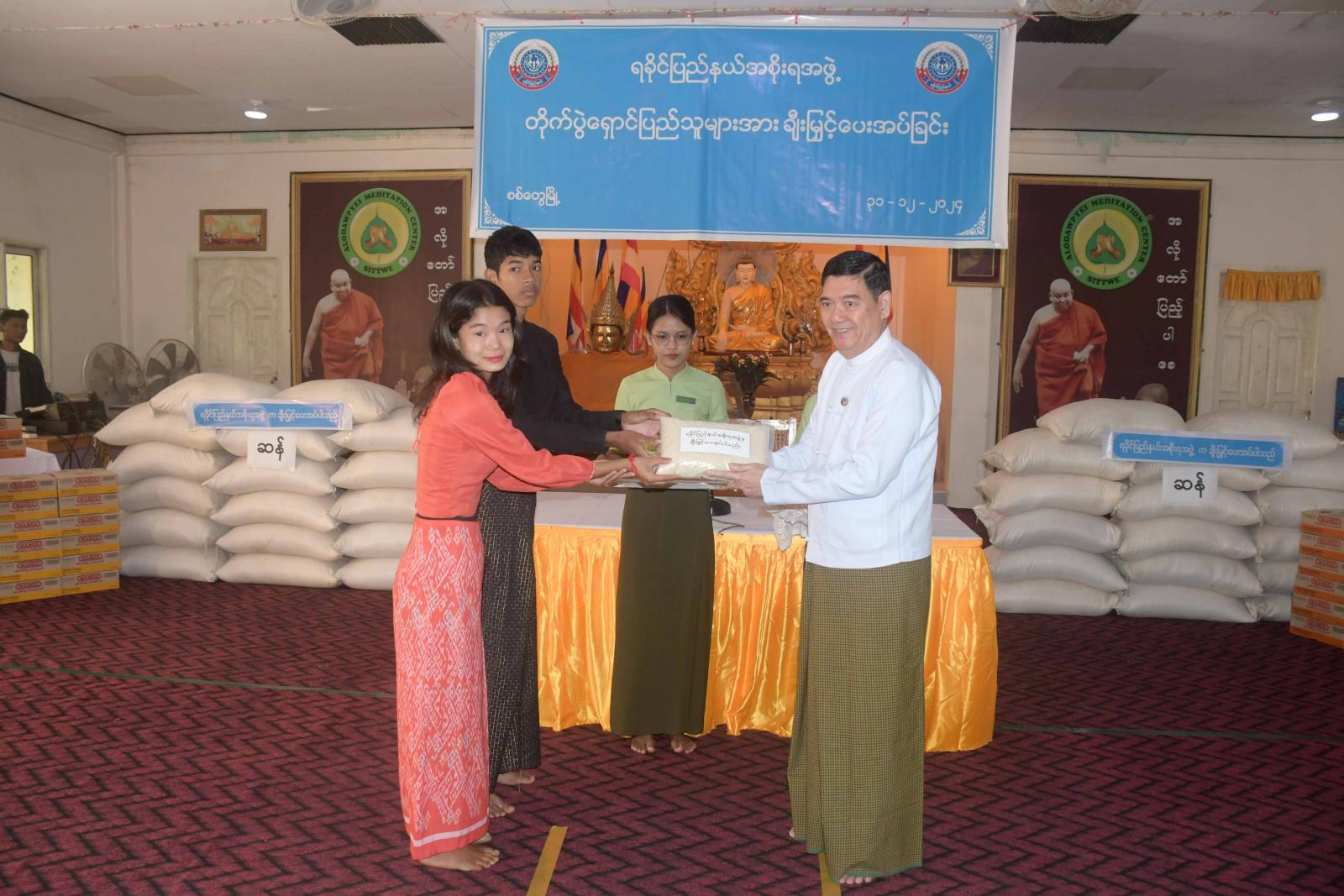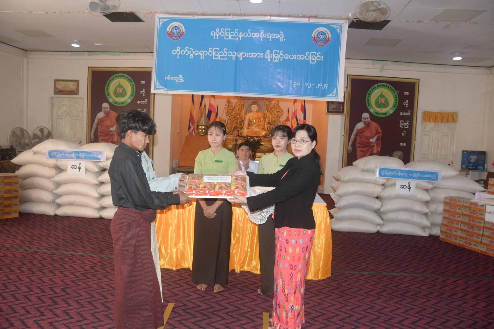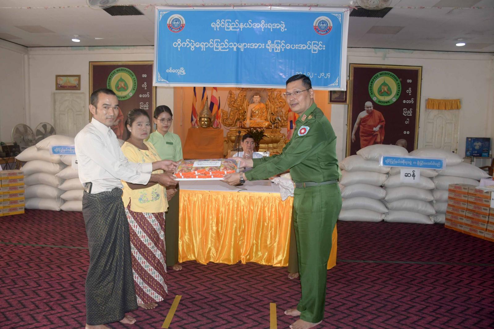 ရခိုင်ပြည်နယ်ဝန်ကြီးချုပ် ဦးထိန်လင်းသည် ပြည်နယ်တရားလွှတ်တော် တရားသူကြီးချုပ်၊ ပြည်နယ်အစိုးရအဖွဲ့ဝင်များ၊ ဌာနဆိုင်ရာတာဝန်ရှိသူများနှင့်အတူ ယနေ့နံနက်ပိုင်းက စစ်တွေမြို့၊ အလိုတော်ပြည့် ဘုန်းတော်ကြီးကျောင်းတိုက်ရှိ ယာယီနေရပ်စွန့်ခွာပြည်သူများအား ဆန်ရိက္ခာနှင့် စားသောက်ဖွယ်ရာများ ပေးအပ်ခြင်းအခမ်းအနားသို့ တက်ရောက်ကြရာ အခမ်းအနားတွင် ရခိုင်ပြည်နယ်ဝန်ကြီးချုပ် ဦးထိန်လင်းက အမှာစကားပြောကြားပြီး ပြည်နယ်ဝန်ကြီးချုပ်နှင့် တာဝန်ရှိသူများက ယာယီနေရပ်စွန့်ခွာပြည်သူများအတွက် ဆန်ရိက္ခာနှင့် စားသောက်ဖွယ်ရာများကိုပေး အပ်ကြရာ ယာယီနေရပ်စွန့်ခွာပြည်သူများကိုယ်စား ပြည်သူတစ်ဦးက ကျေးဇူးတင်စကား ပြန်လည်ပြောကြားသည်။
