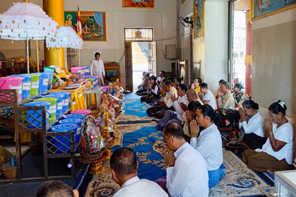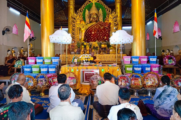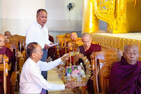 ဆက်လက်၍ ပြည်နယ်သံဃာ့နာယကအဖွဲ့ဝင်တောင်တန်း ကျောင်းတိုက်ဆရာတော် ဘဒ္ဒန္တဇောတိကထံမှ ခရိုင်စီမံအုပ်ချုပ်ရေးအဖွဲ့ အဖွဲ့ဝင်(၂) ဦးစိန်သောင်း၊ ခရိုင်နှင့်မြို့နယ်အဆင့် ဌာနဆိုင်ရာတာဝန်ရှိသူများနှင့် ဧည့်ပရိသတ်အပေါင်းတို့က ငါးပါးသီလ ခံယူဆောက်တည်ကြပြီး ဆရာတော်၊ သံဃာတော်အရှင်သူမြတ်တို့အား လှူဖွယ်ဝတ္ထုပစ္စည်းများ ဆက်ကပ်လှူဒါန်းပေးကာ လှူဒါန်းမှုအစုစုတို့အတွက် ရေစက်သွန်းချ အမျှပေးဝေသည်။