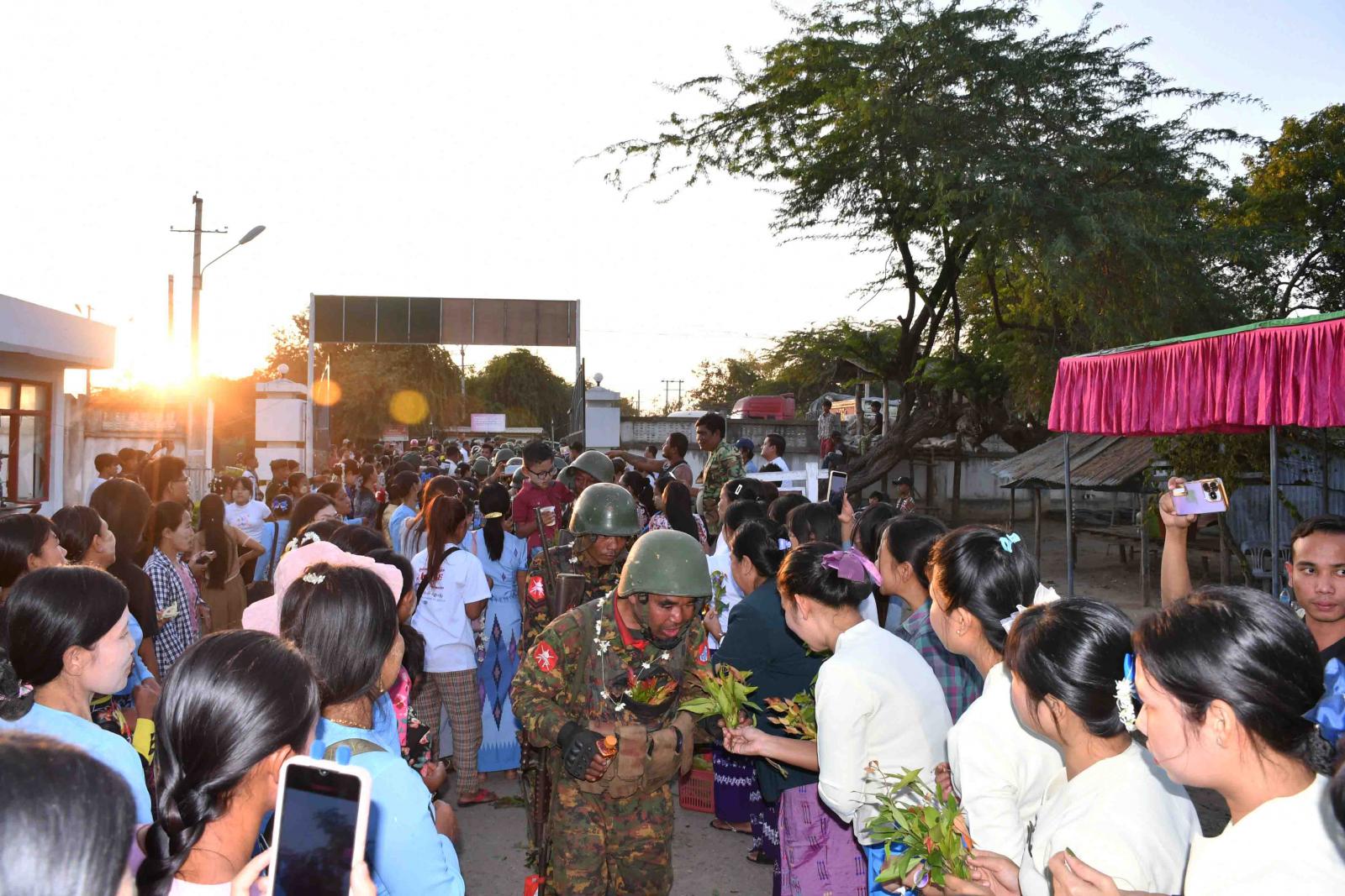 ထိုသို့ကြိုဆိုရာတွင် ဧည့်သည်များ၊ မြို့နယ်စီမံအုပ်ချုပ်ရေးအဖွဲ့ဥက္ကဋ္ဌနှင့် အဖွဲ့ဝင်များ၊ မြို့နယ်အဆင့်ဌာနဆိုင်ရာ အကြီးအကဲများနှင့် ဝန်ထမ်းများ၊ အခြေခံပညာကျောင်းများမှ ဆရာ၊ ဆရာမများ၊ ကျောင်းသား၊ ကျောင်းသူများ၊ မြို့နယ်စစ်မှုထမ်းဟောင်းအဖွဲ့ဥက္ကဋ္ဌနှင့် အဖွဲ့ဝင်များ၊ ရပ်ကွက်၊ ကျေးရွာအုပ်ချုပ်ရေးမှူးများနှင့် ပြည်သူများ၊ နယ်မြေခံတပ်ရင်းမှ အရာရှိနှင့် စစ်သည်များ၊ မိသားစုဝင်များ၊ စုစုပေါင်းအင်အား ၇၀၀ ကျော်တို့က အိုးစည်၊ ဒိုးပတ်နှင့် စံပယ်ပန်းကုံး၊ အောင်သပြေပန်းများဖြင့် ကြိုဆိုခဲ့ကြောင်း သိရသည်။