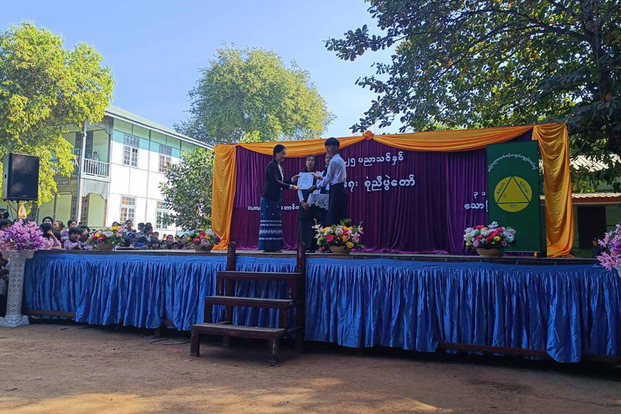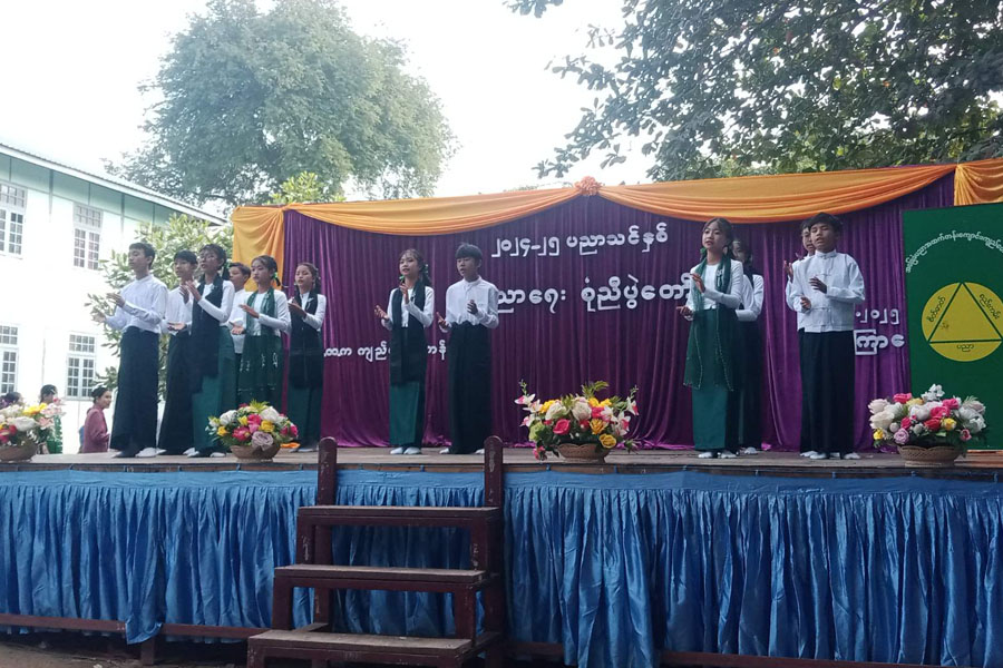 ဆက်လက်၍ ကျည်တောင်ကန်ကျေးရွာ အခြေခံပညာအထက်တန်းကျောင်းမှ ကျောင်းအုပ်ဆရာကြီး၊ ဆရာမကြီးများနှင့် တာဝန်ရှိသူများက တိုင်းဒေသကြီး၊ ခရိုင်၊ မြို့နယ်အဆင့်များတွင် အားကစားထူးချွန်ဆုရရှိသူများ၊ အထိမ်းအမှတ်နေ့ ပြိုင်ပွဲများ၊ ကျောင်းသားအားကစားပြိုင်ပွဲများနှင့် အတန်းအလိုက် ဘာသာရပ်ထူးချွန်ဆုရရှိသူ ဆရာ၊ ဆရာမများနှင့် ကျောင်းသား၊ ကျောင်းသူများအား ဂုဏ်ပြုမှတ်တမ်းနှင့် ဂုဏ်ပြုဆုငွေများ အသီးသီးပေးအပ်ချီးမြှင့်ခဲ့ပြီးနောက် ကျည်တောင်ကန်ကျေးရွာ အခြေခံပညာအထက်တန်းကျောင်းမှ ကျောင်းသား၊ ကျောင်းသူများက “ပြည်ထောင်စုရဲ့ ထာဝရအလှ” သီချင်း၊ “ချင်းတို့ဌာနေ” သီချင်း၊ “မြန်မာ့ကျောင်း” သီချင်းတို့ဖြင့် သီဆိုကပြဖျော်ဖြေခဲ့ကြပြီး အခမ်းအနားအပြီးတွင် မှတ်တမ်းတင်ဓာတ်ပုံများ ရိုက်ကူးခဲ့ကြကြောင်း သိရသည်။