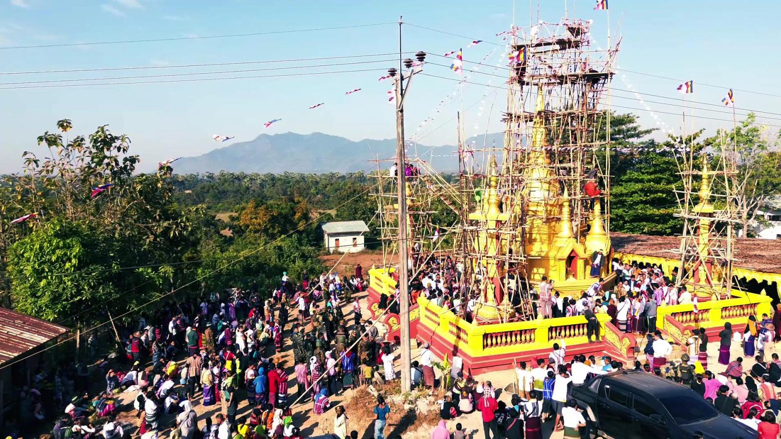 ထို့နောက် ဒုတိယမြိုင်ကြီးငူဆရာတော်၊ ပြည်နယ်ဝန်ကြီးချုပ်နှင့်တာဝန်ရှိသူများသည် ရွှေထီးတော် ဘုံအဆင့်ဆင့်ကို စေတီတော်အထွတ်သို့ မင်္ဂလာရထားပျံဖြင့် ပင့်ဆောင်တင်လှူပူဇော်ကြပြီး ရွှေထီးတော်၊ ငှက်မြတ်နားတော်နှင့် စိန်ဖူးတော်တို့ကို အမွှေးနံ့သာရည်များဖြင့် ပက်ဖြန်းပူဇော်ကြကာ ဆရာတော်၊ သံဃာတော်များက “ဇယန္တောဗောဓိယာမူလေ”အစချီ အောင်ဂါထာကို သုံးကြိမ်ရွတ်ဆိုပူဇော်ကြ၍ ရတနာရွှေမိုး ငွေမိုးများ ရွာသွန်းဖြိုးခဲ့ကြကြောင်း သိရသည်။