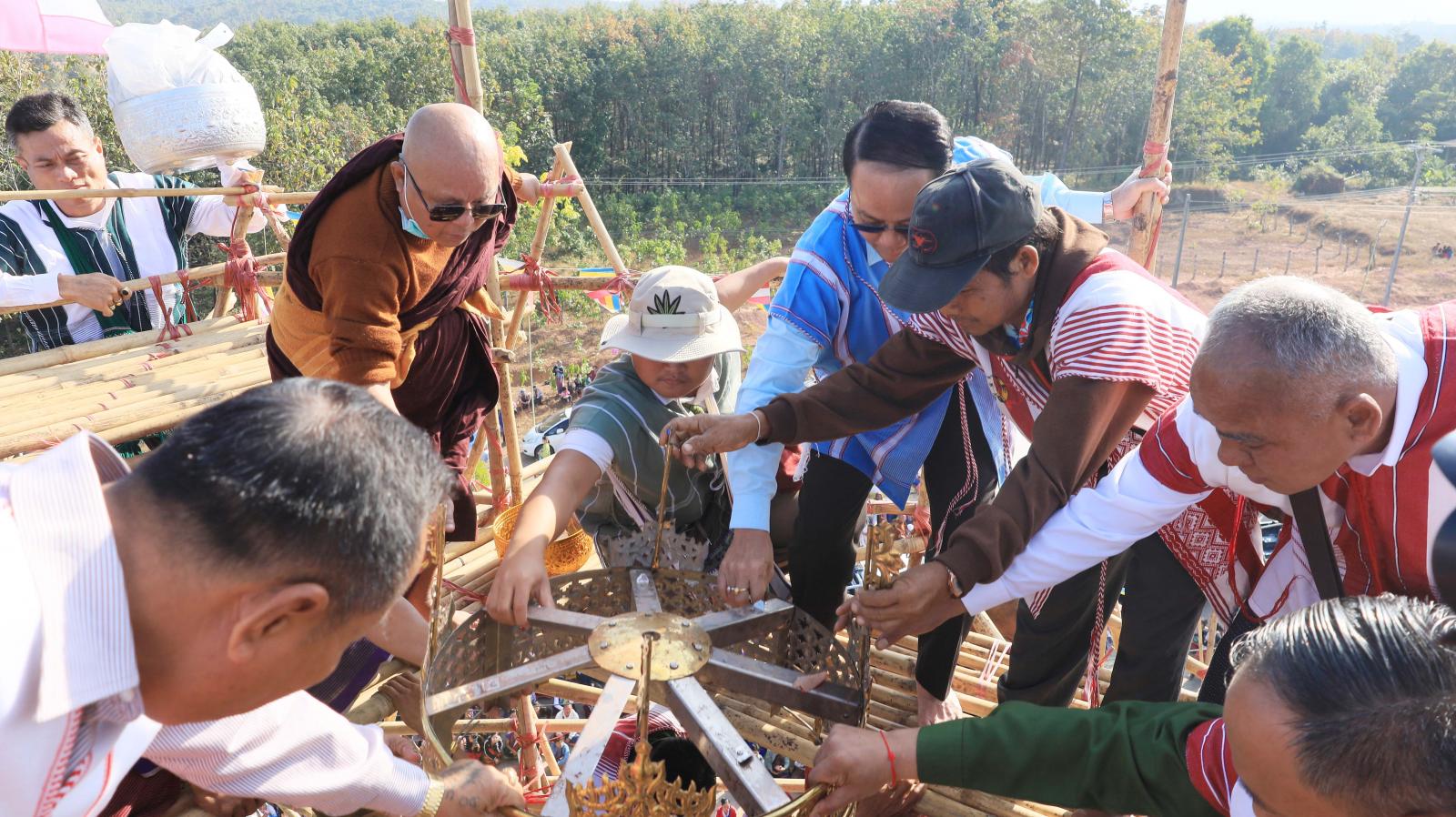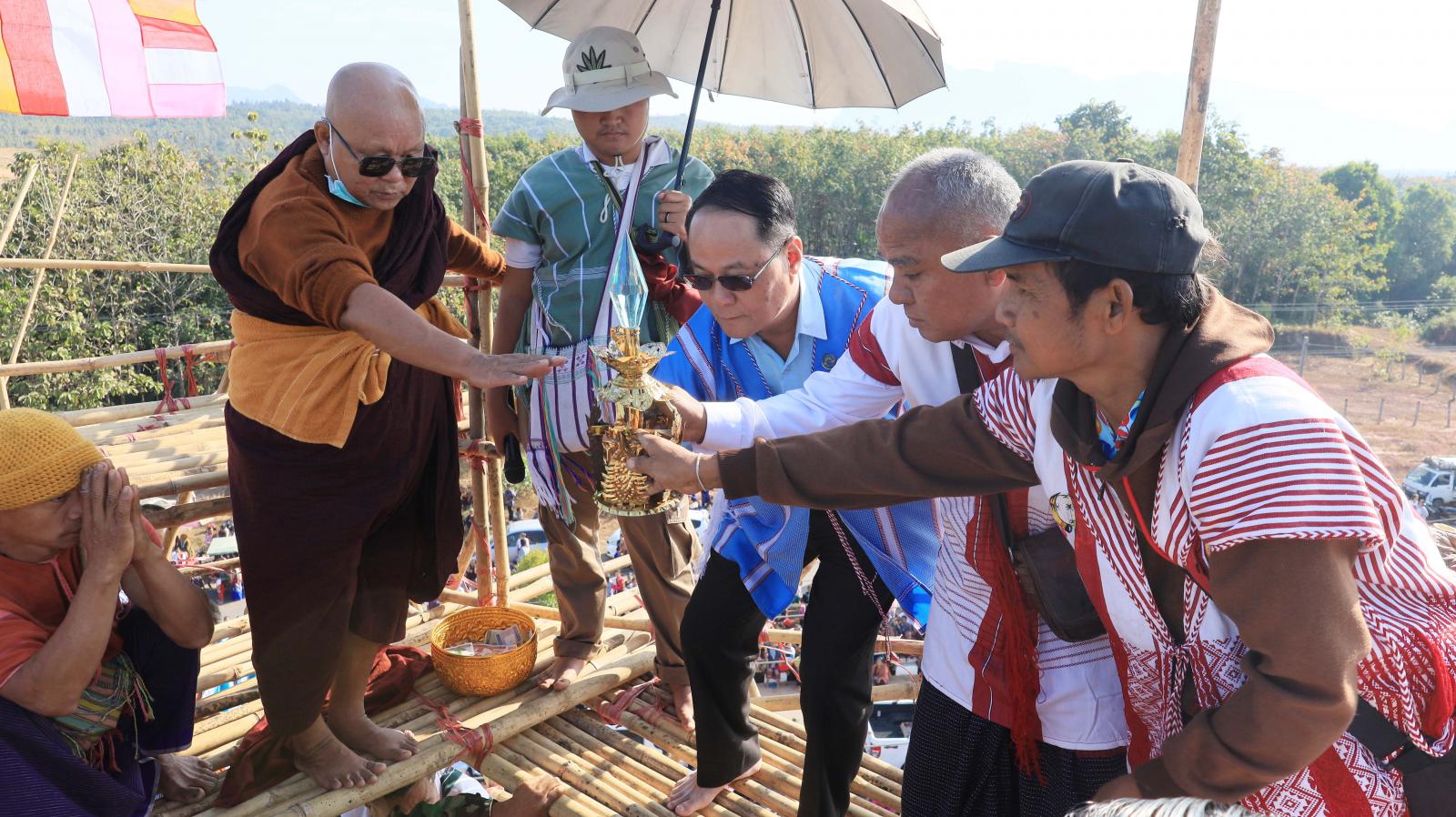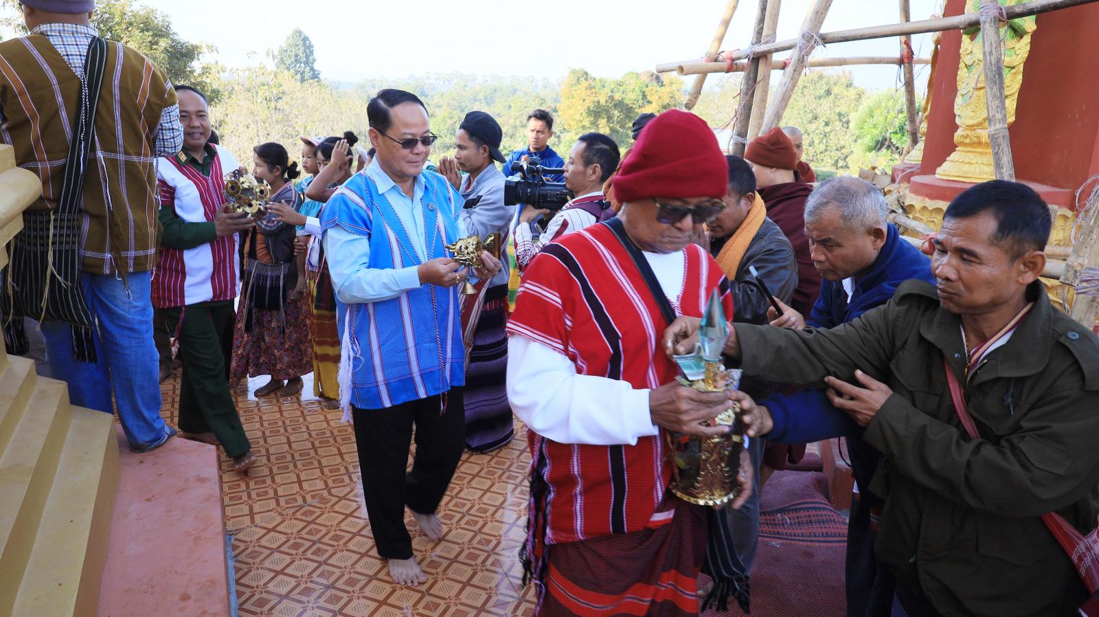 ဦးစွာ ပြည်နယ်ဝန်ကြီးချုပ်က မြိုင်ကြီးငူနန်းဦးဘေးမဲတောရတိုက်ကျောင်းဦးစီးပဓာနနာယက ဒုတိယ မြိုင်ကြီးငူဆရာတော် အဂ္ဂမဟာမင်္ဂလဓမ္မဇောတိကဓဇ သီရီပျံချီဘဒ္ဒန္တဉာဏိကအား ဖူးမြော်ကြည်ညို၍ လှူဖွယ်ဝတ္ထုပစ္စည်းများနှင့်နဝကမ္မအလှူငွေများ ဆက်ကပ်လှူဒါန်းကြပြီး ဆရာတော်ကြီးများ၊ ပြည်နယ်ဝန်ကြီးချုပ်နှင့်အစိုးရအဖွဲ့ဝင်များ၊ တာဝန်ရှိသူများနှင့် ဘုရားဒါယကာများက စေတီတော်အထွတ်တွင်တင်လှူပူဇော်မည့် ရတနာရွှေထီးတော်၊ ငှက်မြတ်နားတော်၊ စိန်ဖူးတော်နှင့်အရံစေတီထီးတော်များကို စေတီတော်အားလက်ယာရစ်သုံးပတ် လှည့်လည် ပူဇော်ကြသည်။