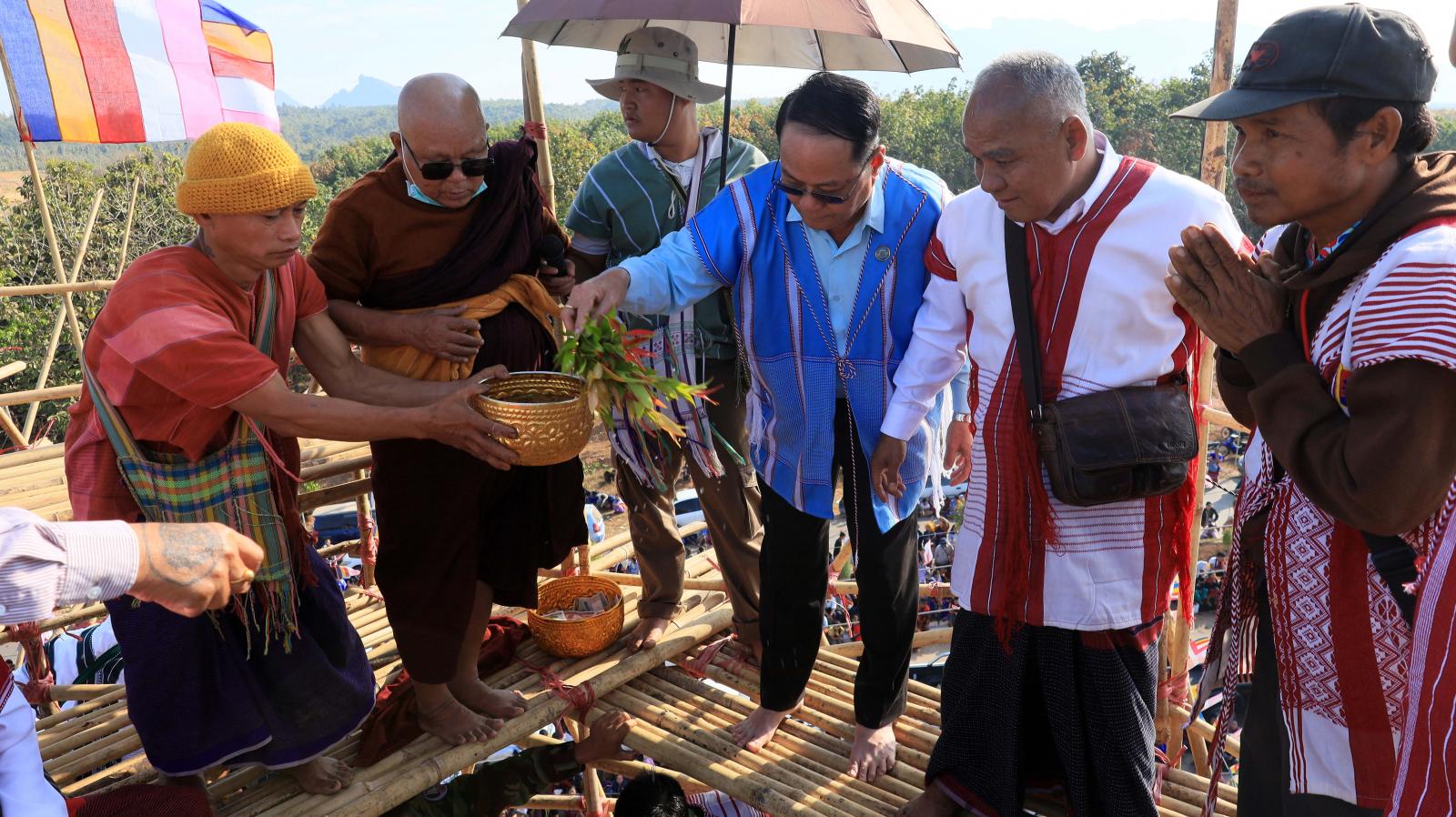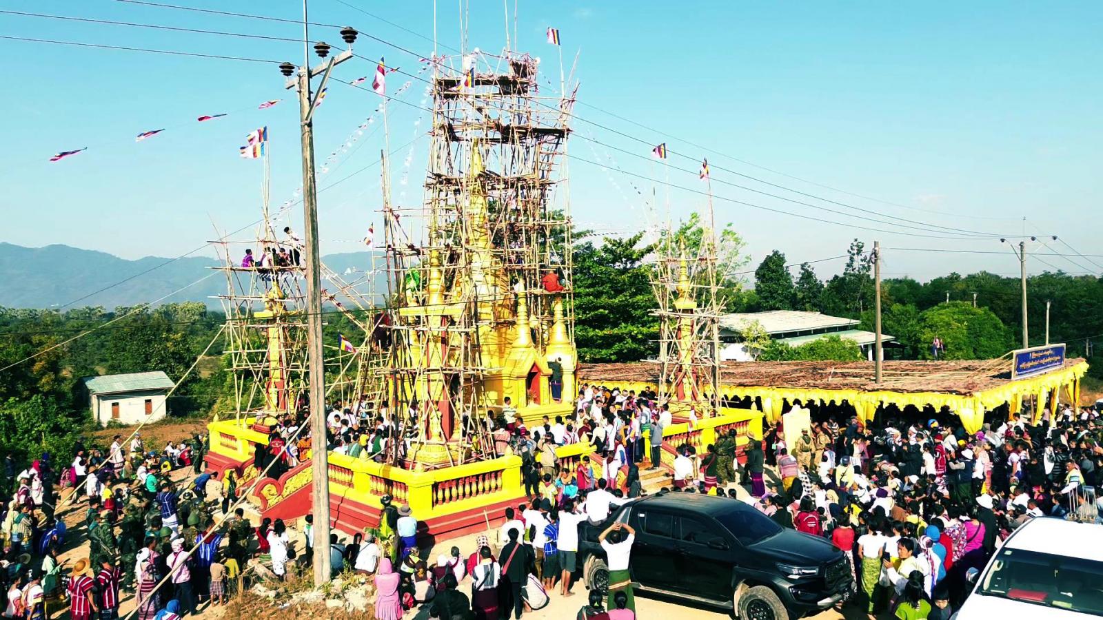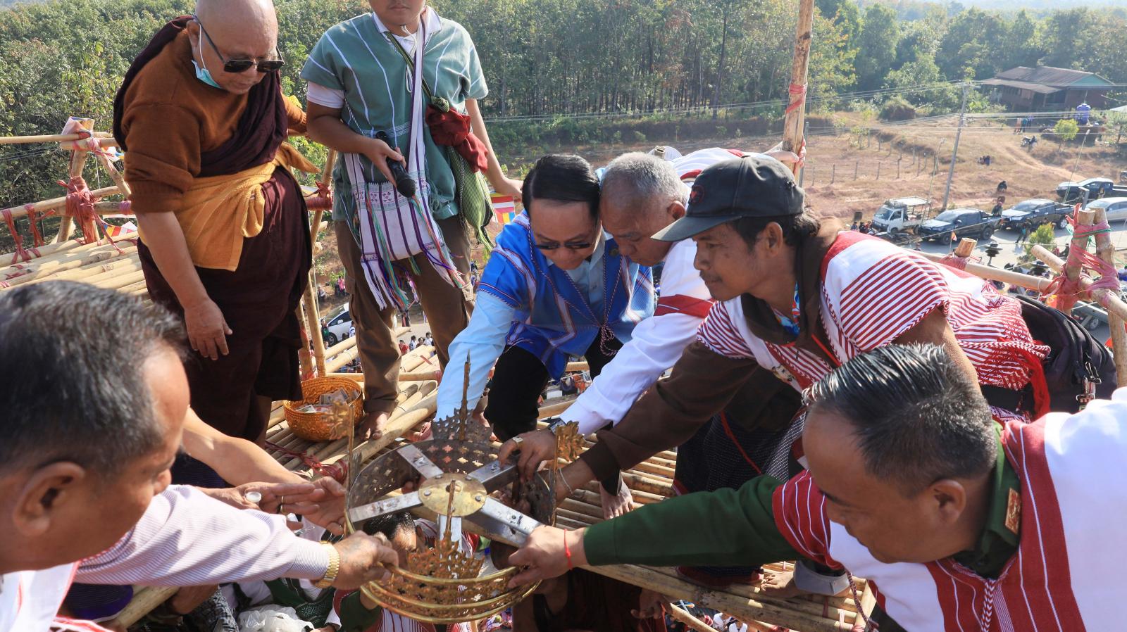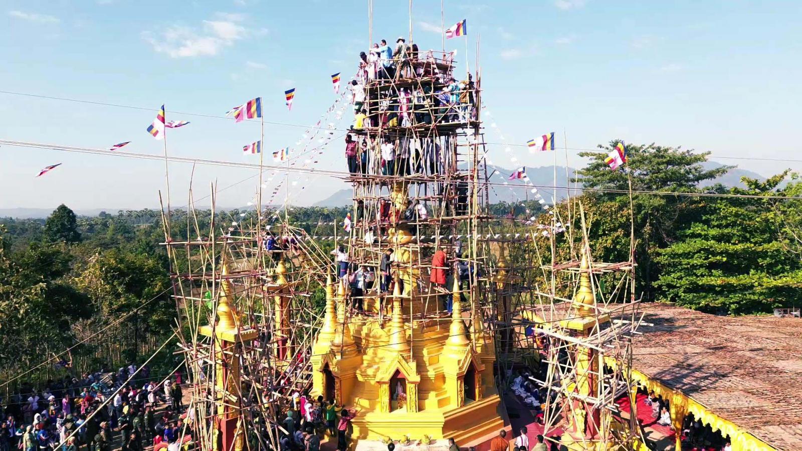 ဦးစွာ ပြည်နယ်ဝန်ကြီးချုပ်က မြိုင်ကြီးငူနန်းဦးဘေးမဲတောရတိုက်ကျောင်းဦးစီးပဓာနနာယက ဒုတိယ မြိုင်ကြီးငူဆရာတော် အဂ္ဂမဟာမင်္ဂလဓမ္မဇောတိကဓဇ သီရီပျံချီဘဒ္ဒန္တဉာဏိကအား ဖူးမြော်ကြည်ညို၍ လှူဖွယ်ဝတ္ထုပစ္စည်းများနှင့်နဝကမ္မအလှူငွေများ ဆက်ကပ်လှူဒါန်းကြပြီး ဆရာတော်ကြီးများ၊ ပြည်နယ်ဝန်ကြီးချုပ်နှင့်အစိုးရအဖွဲ့ဝင်များ၊ တာဝန်ရှိသူများနှင့် ဘုရားဒါယကာများက စေတီတော်အထွတ်တွင်တင်လှူပူဇော်မည့် ရတနာရွှေထီးတော်၊ ငှက်မြတ်နားတော်၊ စိန်ဖူးတော်နှင့်အရံစေတီထီးတော်များကို စေတီတော်အားလက်ယာရစ်သုံးပတ် လှည့်လည် ပူဇော်ကြသည်။