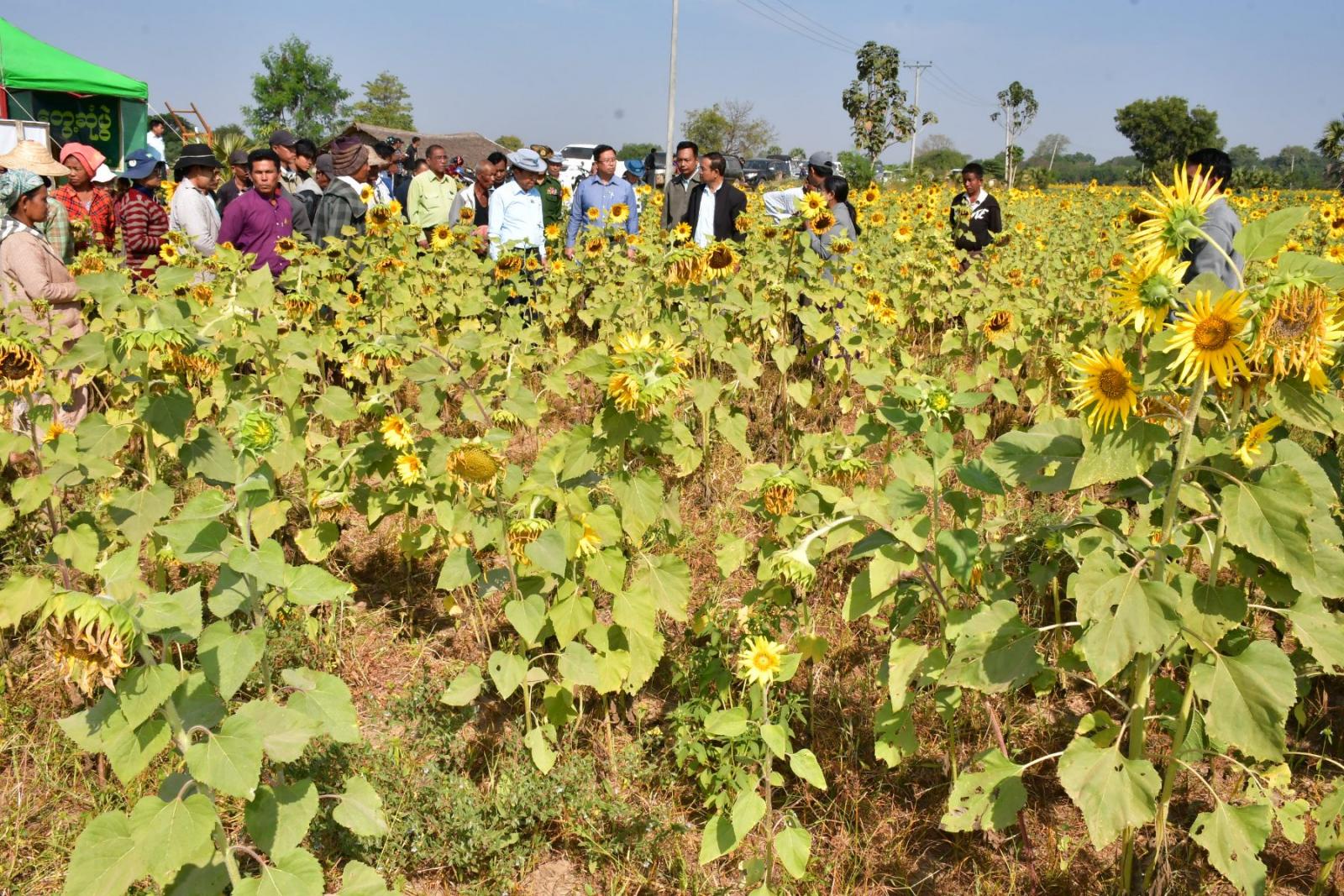 ဆက်လက်၍ နေပြည်တော်ကောင်စီဥက္ကဋ္ဌ ဦးသန်းထွန်းဦးနှင့်အဖွဲ့သည် တပ်ကုန်းမြို့နယ်၊ ကြက်သွန်ခင်းကျေးရွာအုပ်စု၊ ဥယျာဉ်ကျေးရွာ ကွင်းအမှတ် ၁၂၈၃ ရှိ ရေကြီးနစ်မြှုပ်လယ်ယာမြေ စိုက်ဧက ၁၀ ဧကတွင် ရေဆင်းစပ်မျိုးနေကြာ-၁ ဆောင်းနေကြာစိုက်ခင်း အောင်မြင်ဖြစ်ထွန်းနေမှု အခြေအနေများကို သွားရောက်ကြည့်ရှုအားပေးရာ တာဝန်ရှိသူများက လယ်ယာစိုက်ပျိုးရေး ကဏ္ဍ ဖွံ့ဖြိုးတိုးတက်ရေးဆောင်ရွက်မှုအခြေအနေများကို ရှင်းလင်းတင်ပြကြပြီး နေပြည်တော်ကောင်စီဥက္ကဋ္ဌ ဦးသန်းထွန်းဦးက စိုက်ပျိုးသီးနှံများ ပန်းတိုင်အထွက်နှုန်းရရှိရေး၊ သီးထပ်စွမ်းအား တိုးတက်ရေး၊ သီးထပ်သီးညှပ်စိုက်ပျိုးရေးတို့ကို အလေးထားဆောင်ရွက်ကြရမှာဖြစ်ကြောင်း မှာကြားပြီး ဆောင်းနေကြာစိုက်ခင်း အောင်မြင်ဖြစ်ထွန်းနေမှုကို ကြည့်ရှုအားပေးသည်။