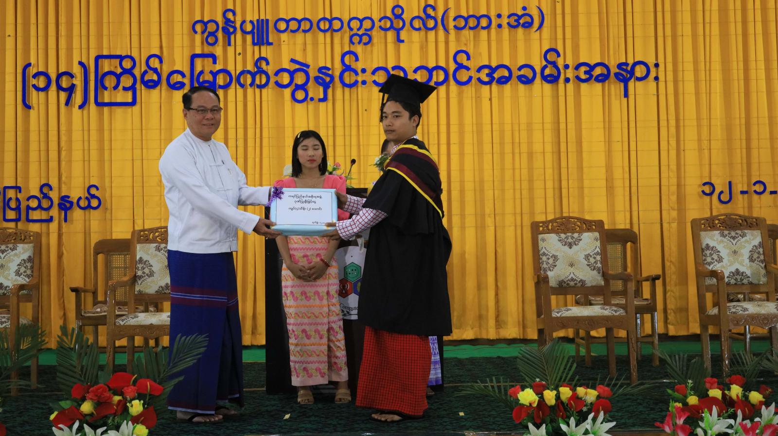 အဆိုပါဘွဲ့နှင်းသဘင်အခမ်းအနားသို့ ကရင်ပြည်နယ်ဝန်ကြီးချုပ်ဦးစောမြင့်ဦး၊ ပြည်နယ်တရားလွှတ်တော် တရားသူကြီးချုပ်ဦးညွန့်လင်း၊ ပြည်နယ်အစိုးရအဖွဲ့ဝင်များ တက်ရောက်ခဲ့ကြပြီး ပြည်နယ်ဝန်ကြီးချုပ်က ပြောင်းလဲတိုးတက်နေသည့်နည်းပညာရပ်များကို အမြဲမပြတ်လေ့လာဆည်းပူးရင်း ထူးချွန်ထက်မြတ်သည့်နိုင်ငံသားကောင်း၊ သမီးကောင်းများ IT ပညာရှင်များဖြစ်အောင်၊ နိုင်ငံတော်၏လိုအပ်ချက်ကိုဖြည့်ဆည်းပေးနိုင်သည့် အသိပညာ၊ အတတ်ပညာ၊ ကျွမ်းကျင်ပညာရှင်များဖြစ်အောင်၊ ထူးချွန်သည့်ပညာတတ်များဖြစ်အောင် ကြိုးစားကြစေလိုကြောင်း ပြောကြားပြီး ဘွဲ့ယူမောင်မယ်များအတွက် ငွေကျပ် လေးသိန်းနှစ်သောင်းကို ဂုဏ်ပြုချီးမြှင့်သည်။