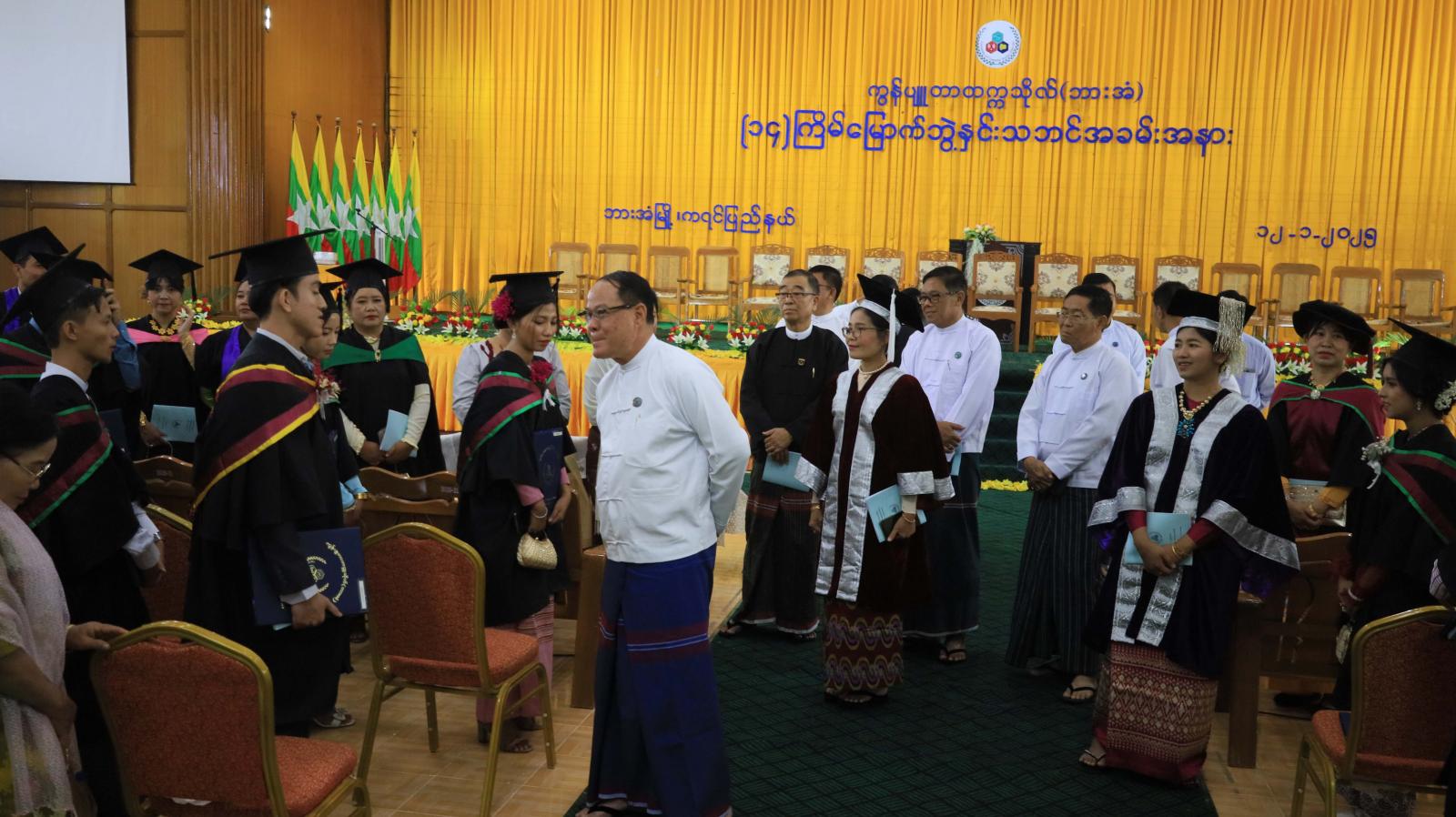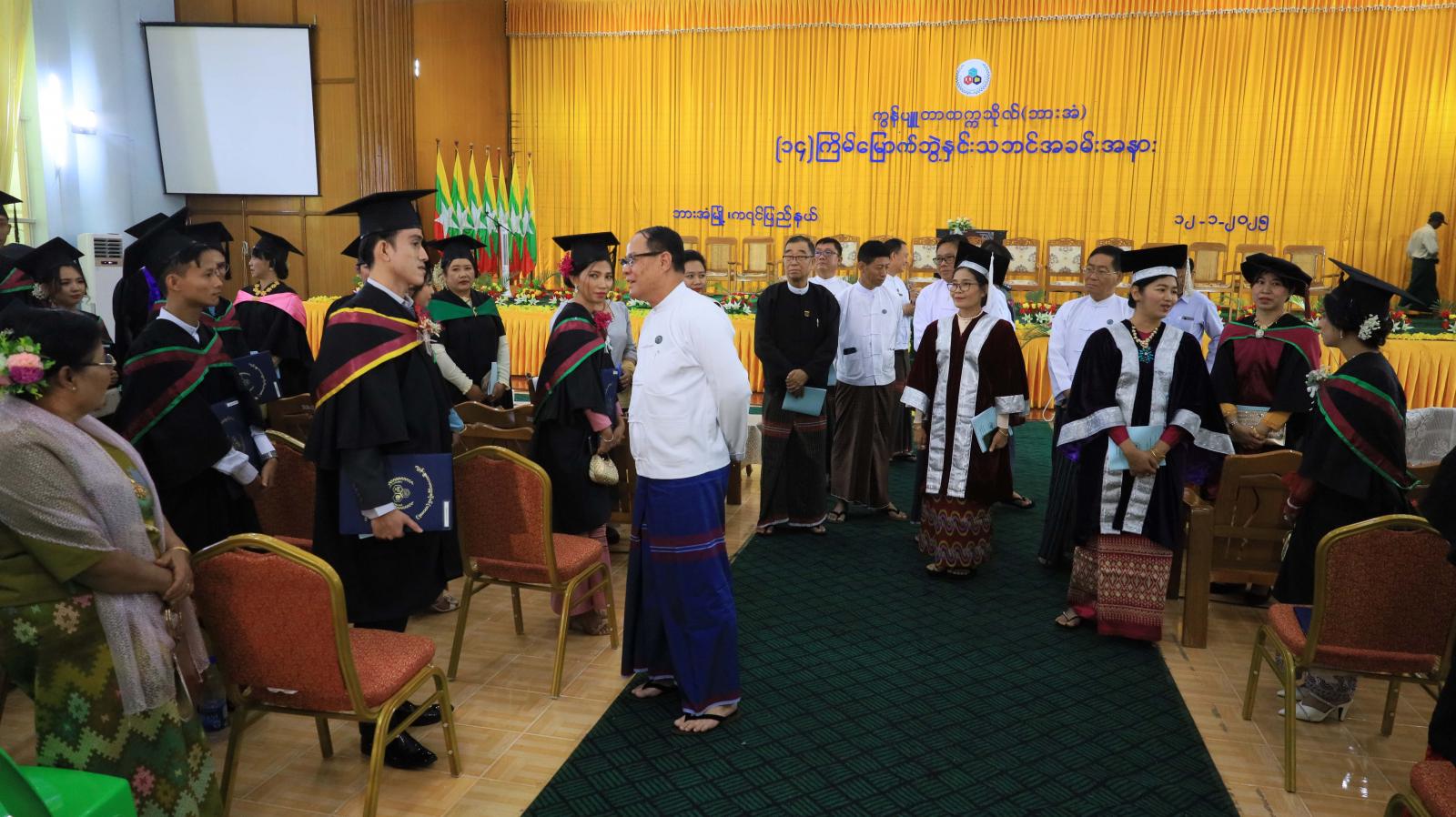 ယနေ့ဘွဲနှင်းသဘင်အခမ်းအနားတွင် အဝေးရောက်ဘွဲ့ယူသူ(၄)ဦးအပါအဝင် စုစုပေါင်း(၂၅)ဦးအား သက်ဆိုင်ရာဘွဲ့အသီးသီးကို အပ်နှင်းခဲ့ပြီး ကရင်ပြည်နယ်ဝန်ကြီးချုပ်၊ ပြည်နယ်တရားလွှတ်တော် တရားသူကြီးချုပ်၊ ပြည်နယ်အစိုးရအဖွဲ့ဝင်များက ဘွဲ့ယူပြီးသူမောင်မယ်များနှင့်၎င်းတို့၏ မိဘ၊ ဆွေမျိုး၊ ညီအစ်ကိုမောင်နှမများအား ရင်းရင်းနှီးနှီးတွေ့ဆုံ၍ အားပေးစကားများပြောကြားခဲ့ကြောင်း သိရသည်။