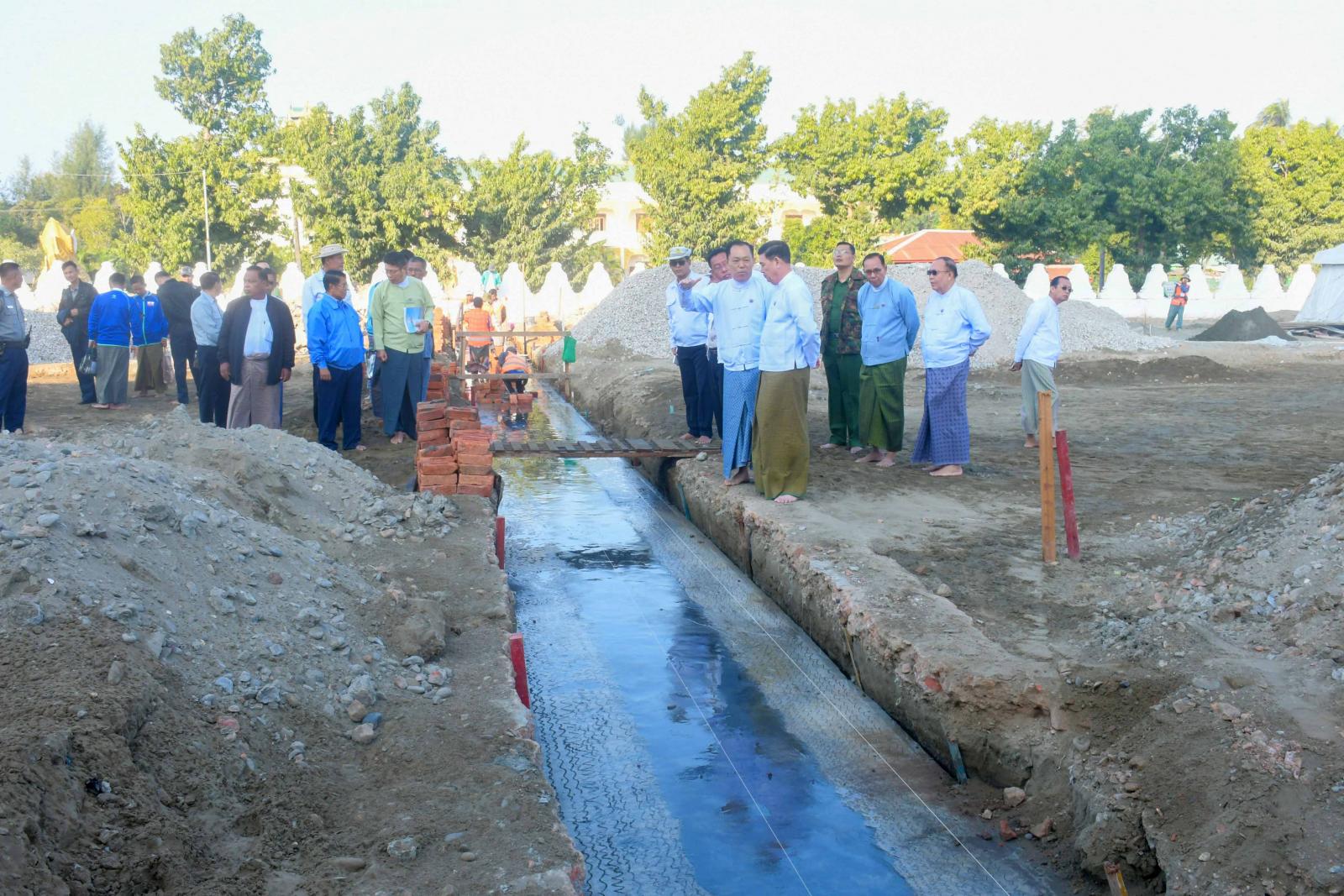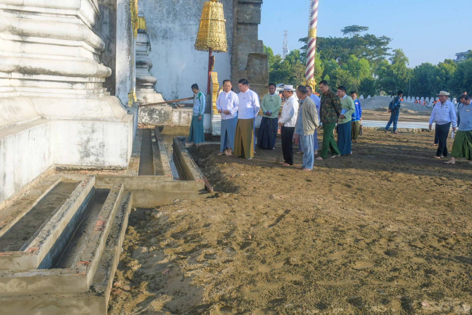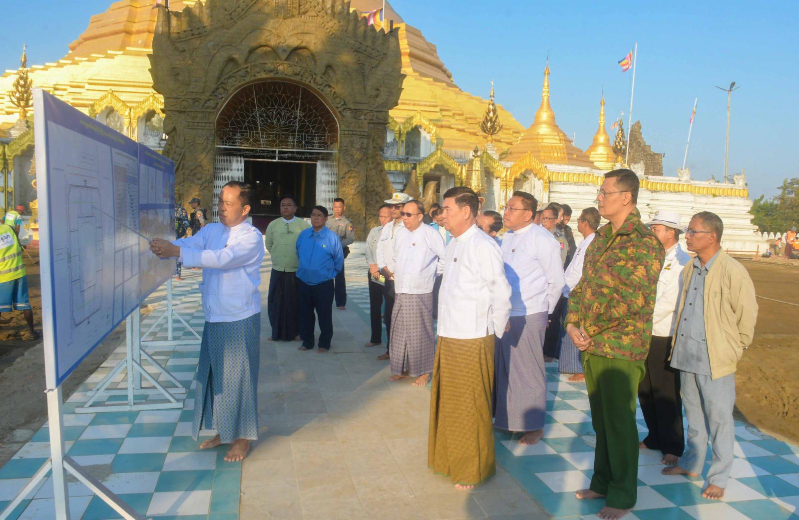 ဆက်လက်၍ ပြည်နယ်ဝန်ကြီးချုပ်နှင့်အဖွဲ့သည် စေတီတော်မြတ်ကြီးရင်ပြင်တော်၌ နေပူခံကျောက်ပြားခင်းခြင်းလုပ်ငန်း ဆောင်ရွက်နေမှုကို သွားရောက်ကြည့်ရှုစစ်ဆေးကြရာ ပြည်နယ်လမ်းပန်းဆက်သွယ်ရေးဝန်ကြီး ဦးအောင်ကျော်မိုးက နေပူခံကျောက်ပြားခင်းခြင်းလုပ်ငန်းဆောင်ရွက်နိုင်ရန်အတွက် မြေကြီးပြုပြင်ခြင်းလုပ်ငန်း ဆောင်ရွက်နေမှု၊ ရေနှုတ်မြောင်းများပြုလုပ်ခြင်းလုပ်ငန်း ဆောင်ရွက်ပြီးစီးနေမှုနှင့် ဆက်လက်ဆောင်ရွက်နေမှုများ၊ Compartment Wall ပြုလုပ်ခြင်းနှင့် သဲဖြည့်ရေလောင်း သိပ်သည်းအောင်ပြုလုပ်ခြင်းလုပ်ငန်းများဆောင်ရွက်နေမှုတို့နှင့် မာရဝိဇယဆင်းတုတော်နှင့် အဘယရာဇမုနိဆင်းတုတော် ကိန်းဝပ်အပူဇော်ခံတော်မူမည့် စံကျောင်းတော်နှစ်ဆောင် ဆောက်လုပ်ခြင်းပြီးစီးနေမှုနှင့် ဆက်လက်ဆောင်ရွက်ရမည့်အစီအမံများကို ရှင်းလင်းတင်ပြသည်။