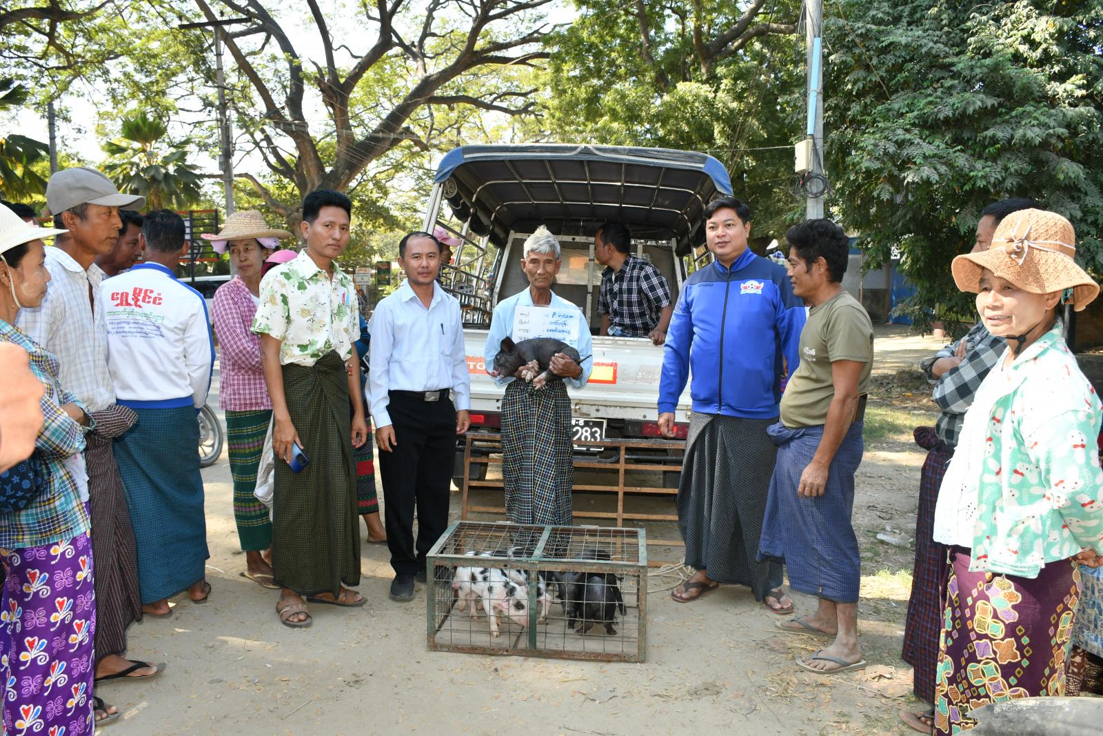 အဆိုပါ ပေးအပ်ရာတွင် မြို့နယ်အထွေထွေအုပ်ချုပ်ရေးဦးစီးဌာနမှ ဒုဦးစီးမှူး ဦးအောင်မြင့်မိုး၊ မြို့နယ်မွေးမြူရေးနှင့်ကုသရေးဦးစီးဌာနမှ လက်ထောက်ညွှန်ကြားရေးမှူး ဒေါက်တာဌေးထိုက်နှင့် တာဝန်ရှိသူများက အောင်ဇေယျရပ်ကွက်တွင် ဆုံးရှုံးခဲ့သည့် ဝက်ပိုင်ရှင် (၁၆) ဦးအတွက် ဝက်ကောင်ရေ (၆၇) ကောင်၊ မြဝတီရပ်ကွက်တွင် ဆုံးရှုံးခဲ့သည့် ဝက်ပိုင်ရှင် (၃၃) ဦးအတွက် ဝက်ကောင်ရေ (၄၀) ကောင်တို့ကို ဝက်ပိုင်ရှင်များထံ လွှဲပြောင်းပေးအပ်ခဲ့ကြောင်း သိရသည်။