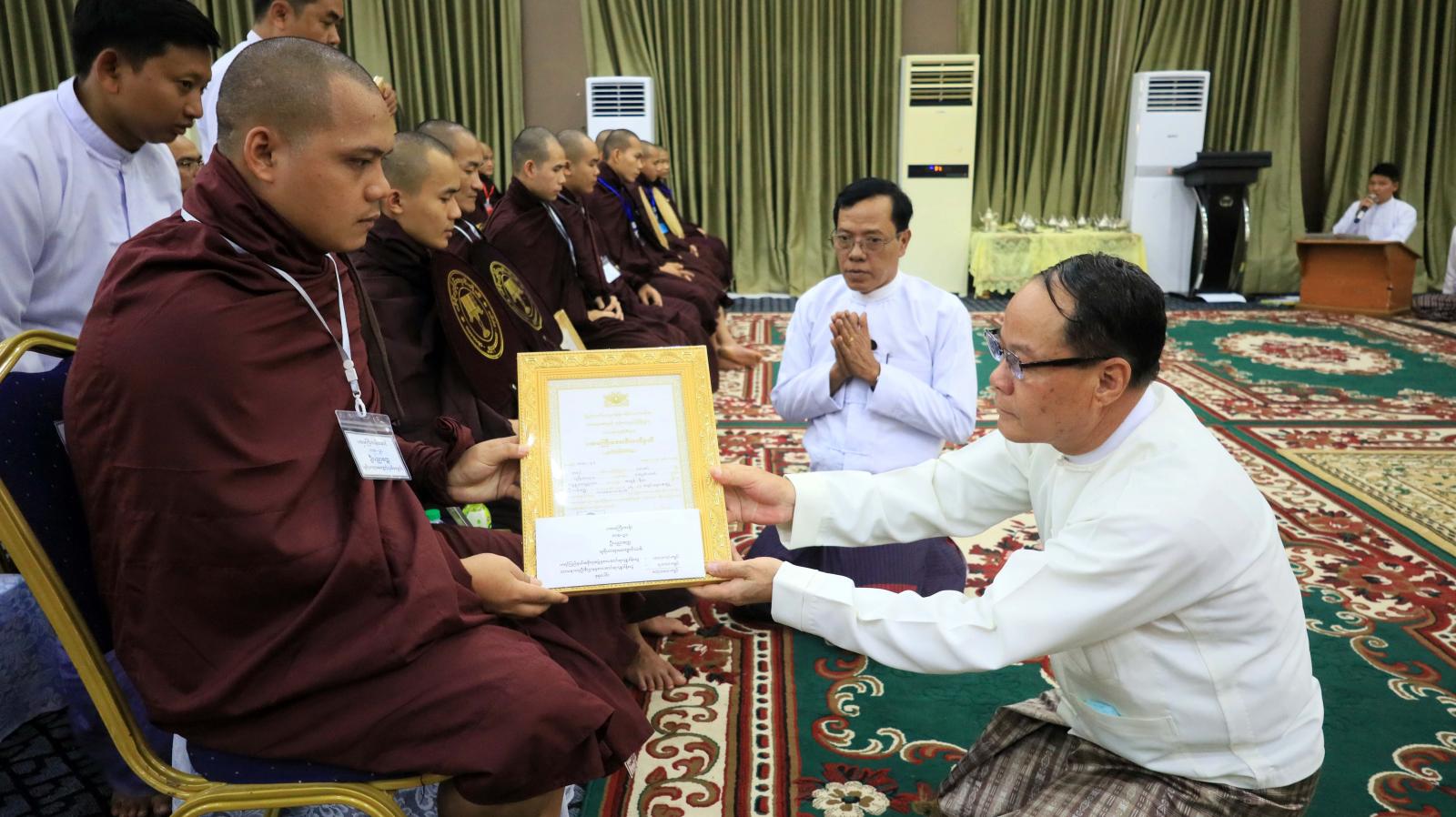 ထို့နောက်ပြည်နယ်ဝန်ကြီးချုပ်ဦးစောမြင့်ဦးက သာသနာရေးဆိုင်ရာများ လျှောက်ထားတင်ပြပြီး ပြည်နယ်ဝန်ကြီးချုပ်နှင့် အစိုးရအဖွဲ့ဝင်များ၊ ရပ်မိရပ်ဖများက အထူးပင့်သံဃာတော် အရှင်သူမြတ်များအား လှူဖွယ်ဝတ္ထုပစ္စည်းများနှင့် နဝကမ္မအလှူတော်ငွေများ ဆက်ကပ် လှူဒါန်းခဲ့ကြပြီး ပြည်နယ်ဝန်ကြီးချုပ်၊ ပြည်နယ်တရား လွှတ်တော်တရားသူကြီးချုပ်၊ ပြည်နယ် အစိုးရအဖွဲ့ဝင်များနှင့် ပြည်နယ်အဆင့်ဌာနဆိုင်ရာ အကြီးအကဲများက စာအောင်သံဃာတော်များ၊ ပြည်နယ်အမျိုးသမီးရေးရာအဖွဲ့နာယကနှင့်အဖွဲ့ဝင်များက သီလရှင်များနှင့်လူပုဂ္ဂိုလ်များအား အောင်လက်မှတ်နှင့် စာအောင်ဆု အလှူတော်ငွေများကို ဆက်ကပ်လှူဒါန်းခဲ့ကြသည်။