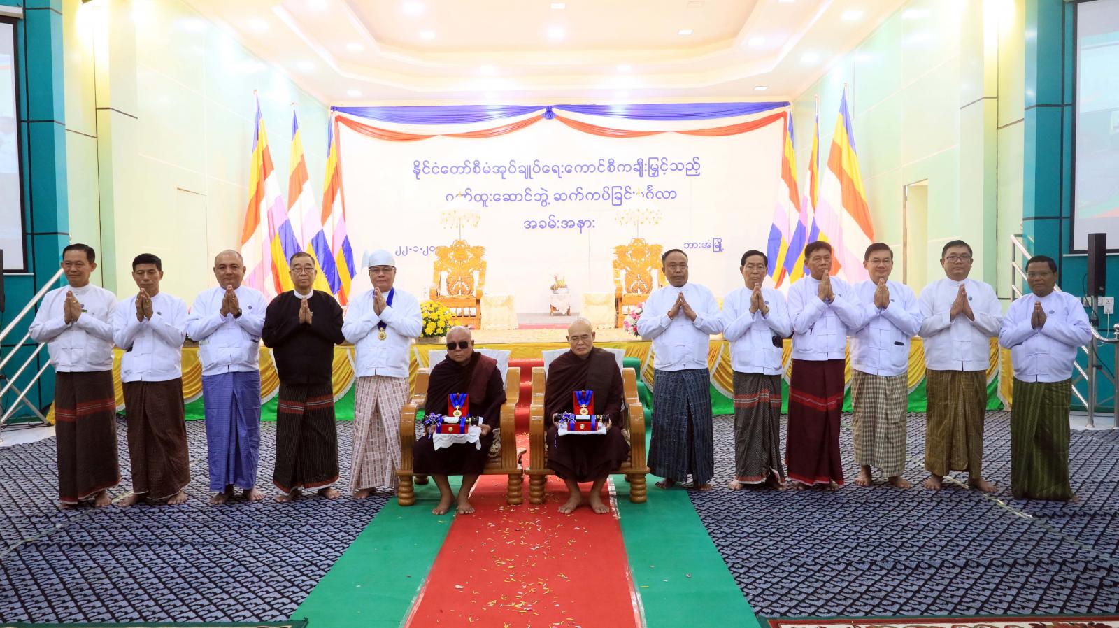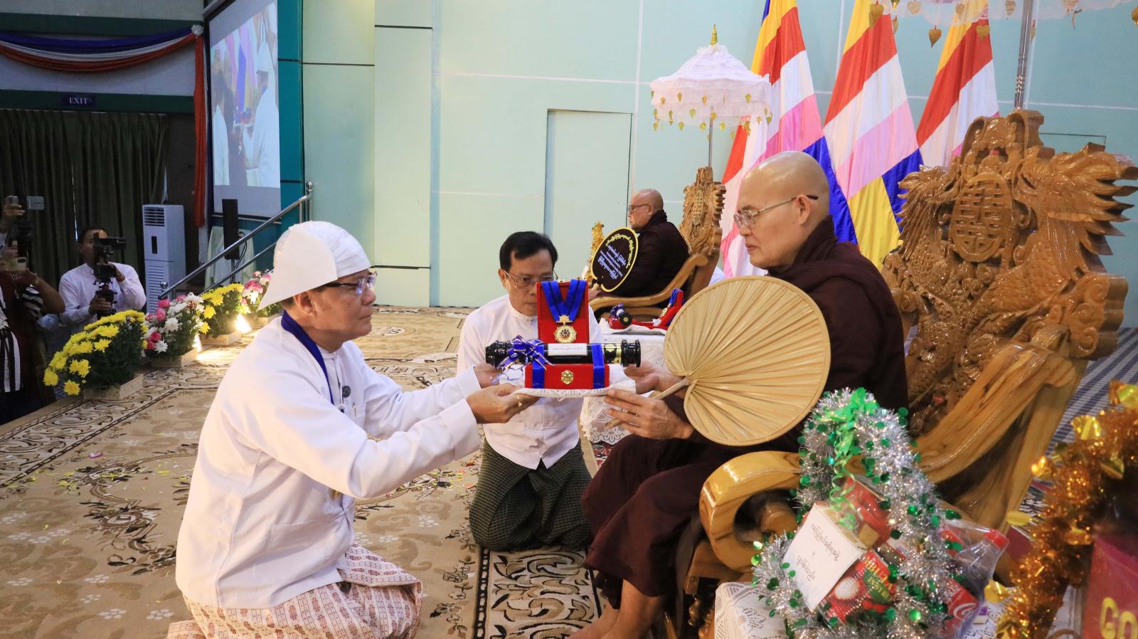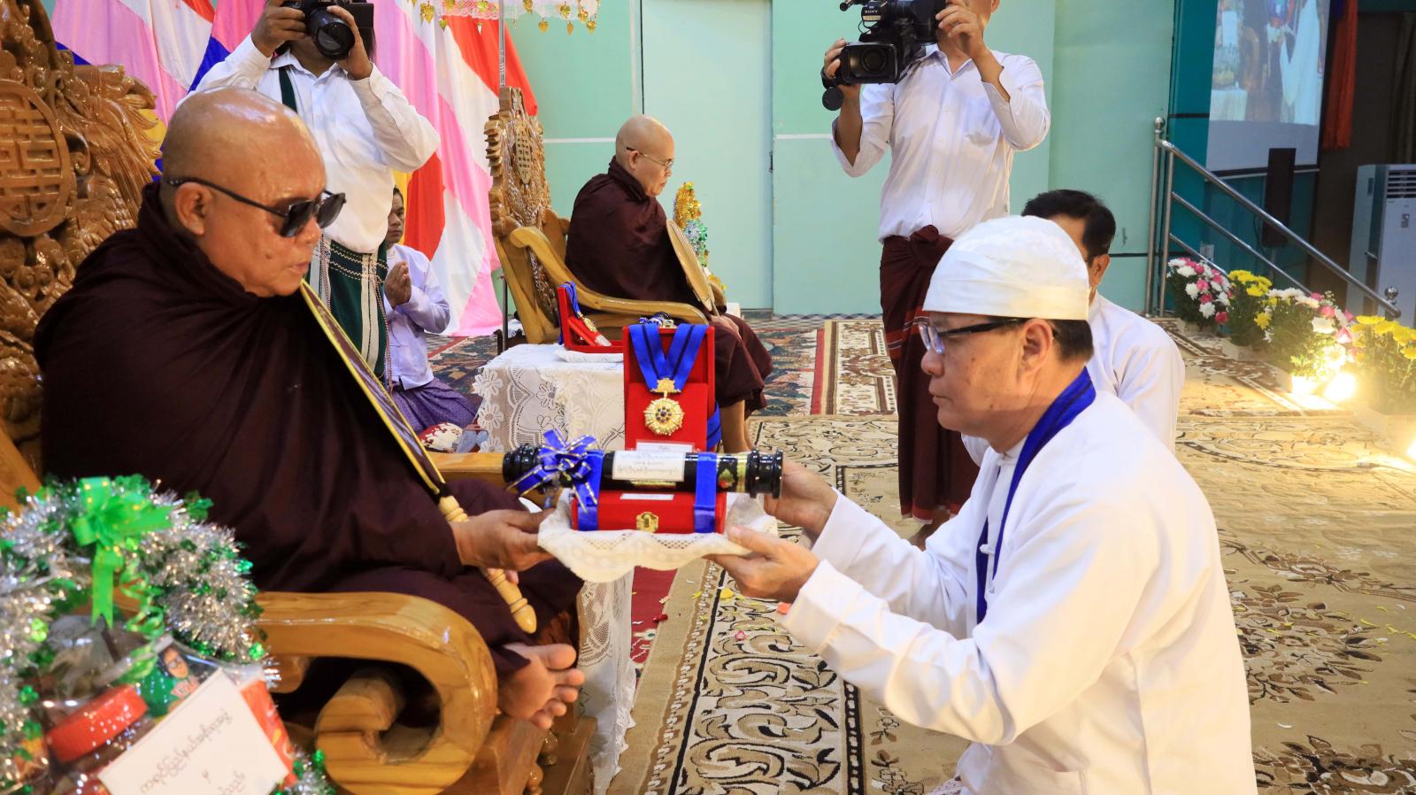 ထို့နောက် ပြည်နယ်ဝန်ကြီးချုပ်က သာသနာရေးဆိုင်ရာများ လျှောက်ထားတင်ပြပြီး နိုင်ငံတော်ဖွံ့ဖြိုးတိုးတက်ရေးနှင့် ငြိမ်းချမ်းသာယာဝပြောရေး စွမ်းစွမ်းတမံ ပူးပေါင်းဆောင်ရွက်တော်မူခဲ့သည့် အတွက် နိုင်ငံတော်စီမံအုပ်ချုပ်ရေးကောင်စီဥက္ကဋ္ဌ၊ နိုင်ငံတော်ဝန်ကြီးချုပ် ဗိုလ်ချုပ်မှူးကြီး သတိုးမဟာသရေစည်သူ၊ သတိုးသီရိသုဓမ္မမင်းအောင်လှိုင်မှ ချီးမြှင့်သည့် သီရိပျံချီဂုဏ်ထူးဆောင်ဘွဲ့ရရှိသော မြိုင်ကြီးငူနန်းဦးဘေးမဲ့ကျောင်းတိုက်ဦးစီးပဓာနနာယက ဒုတိယမြိုင်ကြီးငူဆရာတော်ဘဒ္ဒန္တဉာဏိကနှင့် လမင်းပရိယတ္တိစာသင်တိုက်ဆရာတော် ဘဒ္ဒန္တကေသရိန္ဒတို့အား ဂုဏ်ထူးဆောင်ဘွဲ့တံဆိပ်များ ဆက်ကပ်အပ်နှင်းသည်။