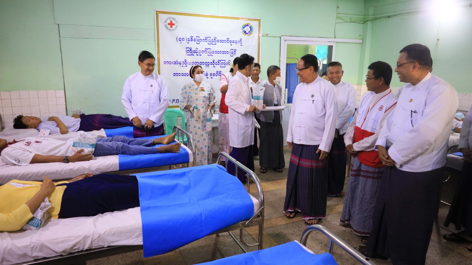 ဦးစွာ ပြည်နယ်ဝန်ကြီးချုပ်၊ ပြည်နယ်တရားလွှတ်တော်တရားသူကြီးချုပ်၊ ပြည်နယ်အစိုးရအဖွဲ့ဝင်များက ပြည်နယ်ပြည်သူ့ဆေးရုံကြီး (ဘားအံ) သွေးလှူဘဏ်ဌာနမှ ကျန်းမာရေး ဝန်ထမ်းများက စုပေါင်းသွေးလှူဒါန်းကြမည့် နည်းပညာတက္ကသိုလ်ကြက်ခြေနီအသင်းခွဲမှ အသင်းဝင်များအား လိုအပ်သည့်ကျန်းမာရေး စစ်ဆေးမှုဆောင်ရွက်ပေးနေမှုနှင့် သွေးလှူဒါန်းရန် ကျန်းမာရေးကိုက်ညီသူများက သွေးဖောက်ထုတ်လှူဒါန်းပေးနေမှု အခြေအနေများကို ကြည့်ရှုအားပေးပြီး သွေးလှူရှင်များအား အာဟာရဖြည့်စွက်အစားအစာများ ချီးမြှင့်ပေးအပ်ကာ သွေးလှူဘဏ်အတွင်း သွေးအမျိုးအစားအလိုက် ထိန်းသိမ်းထားရှိမှုအခြေအနေများကို လှည့်လည်ကြည့်ရှု အားပေးခဲ့ကြသည်။