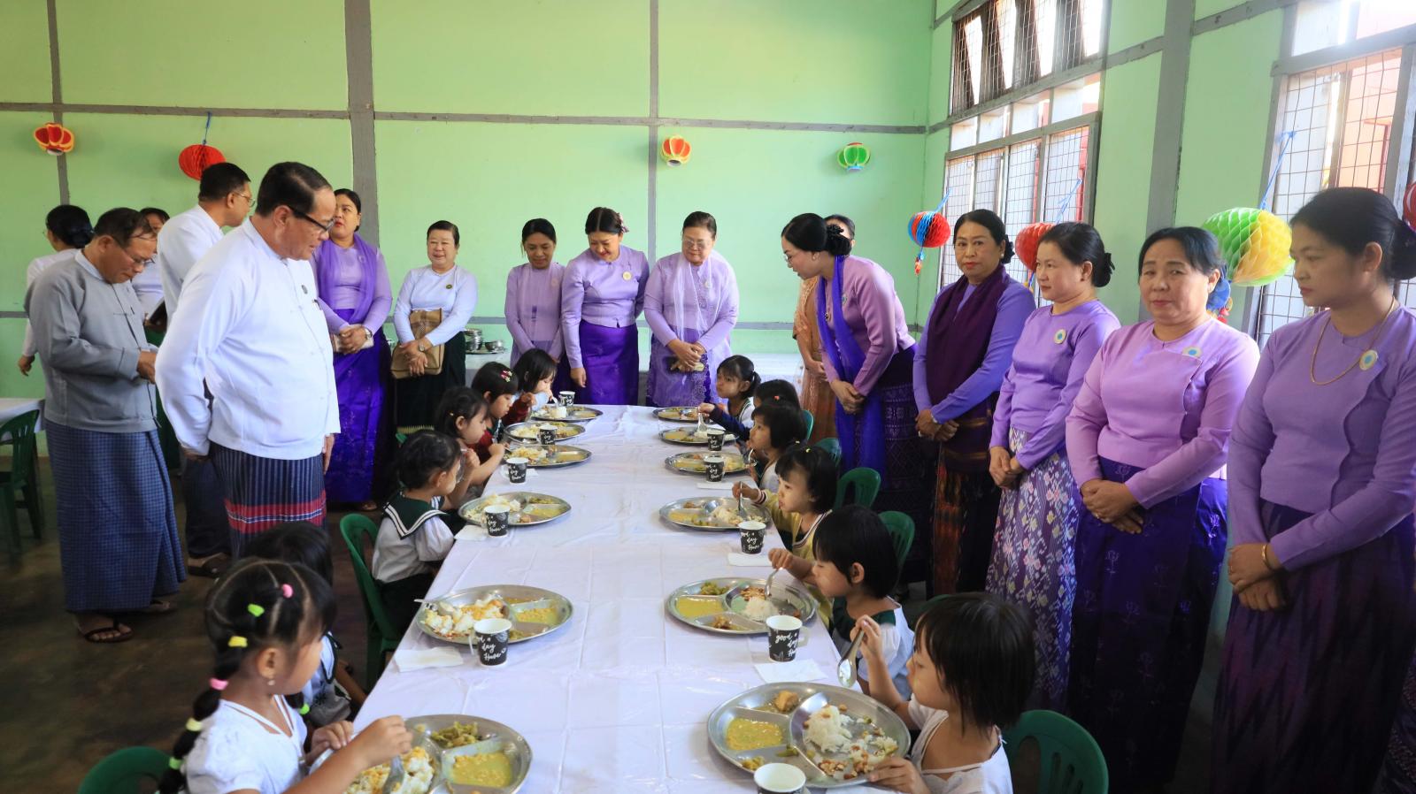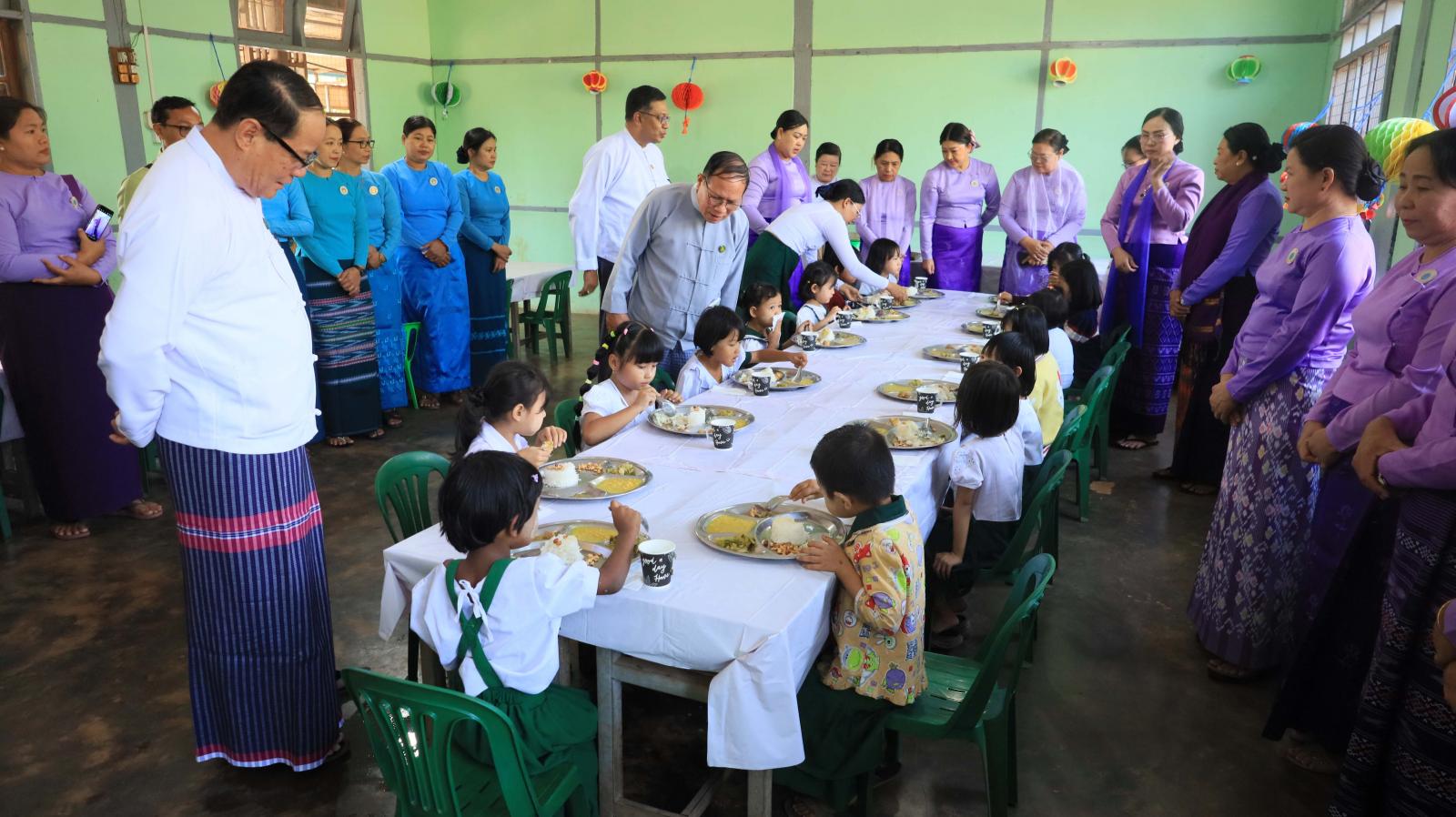 ထို့နောက် အခမ်းအနားသို့ တက်ရောက်လာသော ပြည်နယ်ဝန်ကြီးချုပ်၊ ပြည်နယ်တရားလွှတ်တော်တရားသူကြီးချုပ်၊ ပြည်နယ်အစိုးရ အဖွဲ့ဝင်များ၊ ပြည်နယ်မိခင်နှင့်ကလေးစောင့်ရှောက်မှု ကြီးကြပ်ရေးအဖွဲ့နှင့် ပြည်နယ်အမျိုးသမီးရေးရာ အဖွဲ့နာယကနှင့်အဖွဲ့ဝင်များ၊ ဌာနဆိုင်ရာ တာဝန်ရှိသူများက စုပေါင်းမှတ်တမ်းဓာတ်ပုံများရိုက်ကူးကြပြီး အမှတ် (၄) အခြေခံပညာ အထက်တန်းကျောင်းရှိ KG ကျောင်း သား၊ ကျောင်းသူများ၏ စွမ်းအင်နှင့်အသားဓာတ် လိုအပ်ချက်၊ ခန္ဓာကိုယ်ကြီးထွားဖွံ့ဖြိုးစေသောအုပ်စု၊ အင်အားဖြစ်ထွန်းစေသောအုပ်စုနှင့် ရောဂါအမျိုးမျိုးမှ ကာကွယ်ပေးသောအုပ်စုတို့ ပါဝင်သည့် အာဟာရအစားအစာများ ကျွေးမွေးနေမှုအား လှည့်လည်ကြည့်ရှုအားပေးကာ တာဝန်ရှိသူများအား လိုအပ်သည်များ မှာကြားခဲ့ကြောင်း သိရသည်။