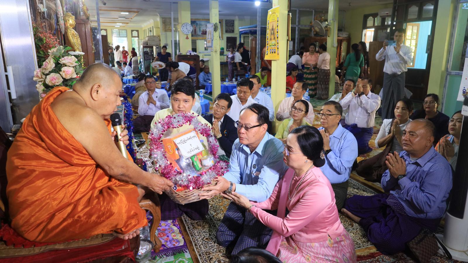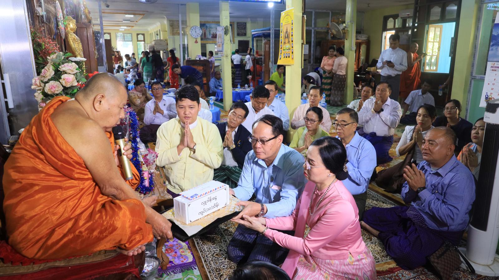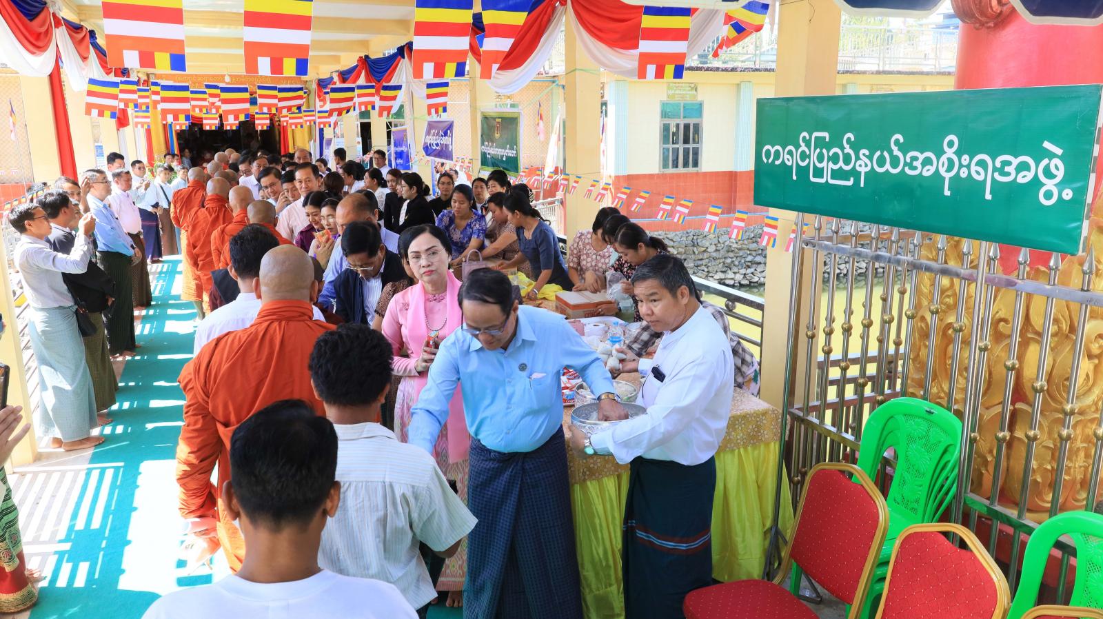 ဦးစွာ ပြည်နယ်ဝန်ကြီးချုပ်ဦးစောမြင့်ဦး၊ ပြည်နယ်တရားလွှတ်တော်တရားသူကြီးချုပ်ဦးညွန့်လင်း၊ ပြည်နယ်အစိုးရအဖွဲ့ဝင်များ၊ ပြည်နယ်အမျိုးသမီးရေးရာအဖွဲ့နာယကနှင့်အဖွဲ့ဝင်များနှင့် ဧည့်ပရိသတ်အပေါင်းတို့က အမိတာရာမရဲကျောင်းတိုက်ဆရာတော် မဟာဂန္ထဝါစကပဏ္ဍိတဘဒ္ဒန္တ ဂုဏလင်္ကာရထံမှ ငါးပါး သီလခံယူဆောက်တည်ကြပြီး လူဖွယ်ဝတ္ထုပစ္စည်းများနှင့် နဝကမ္မ အလှူငွေများဆက်ကပ်လှူဒါန်းကြကာ လှူဒါန်းမှုအစုစုတို့အတွက် အနုမောဒနာတရားနာကြား၍ ရေစက်သွန်းချအမျှပေးဝေးကြသည်။