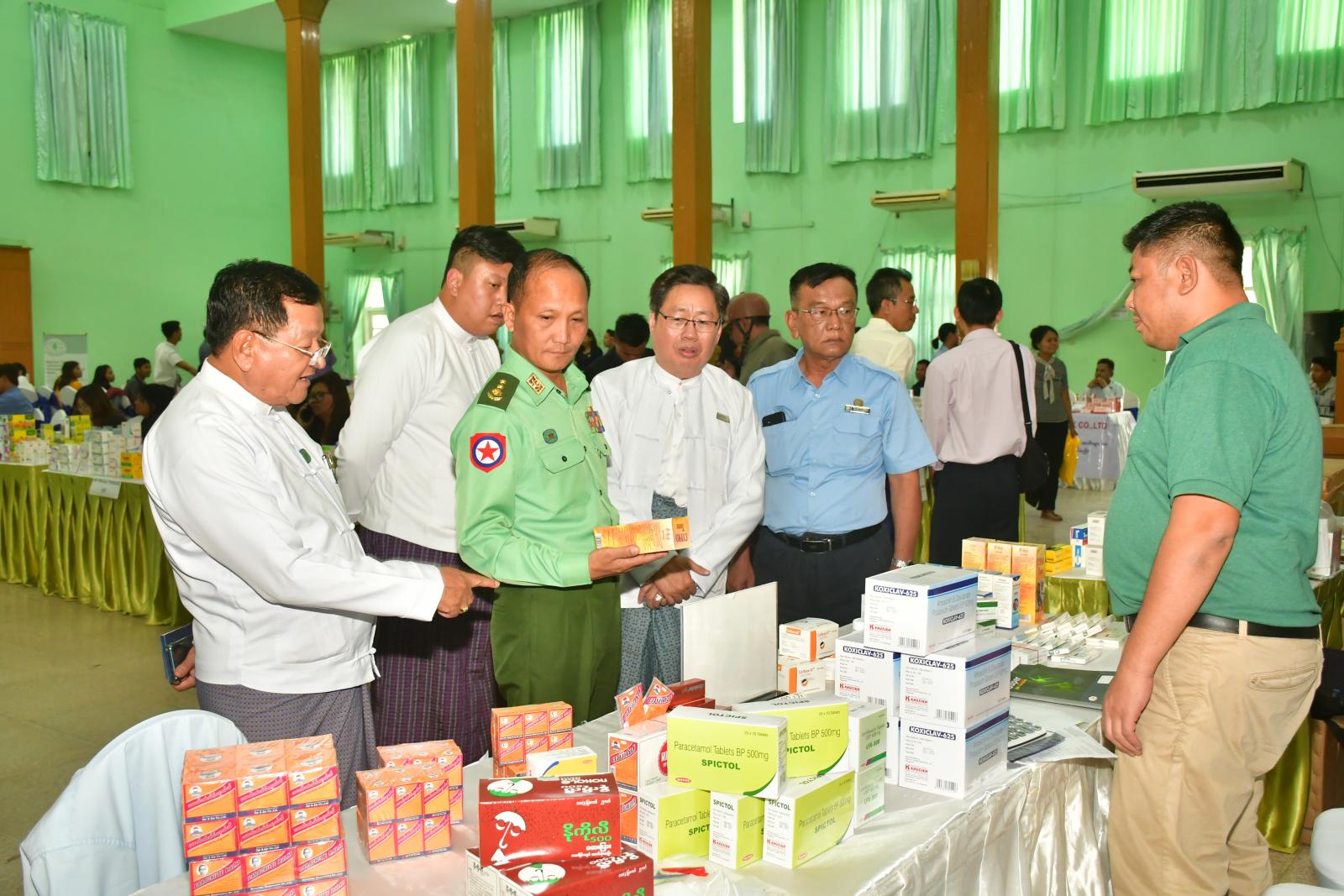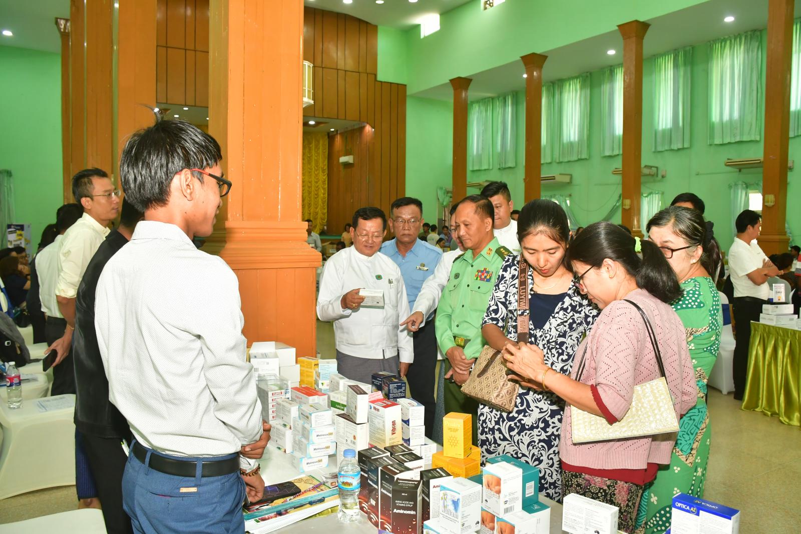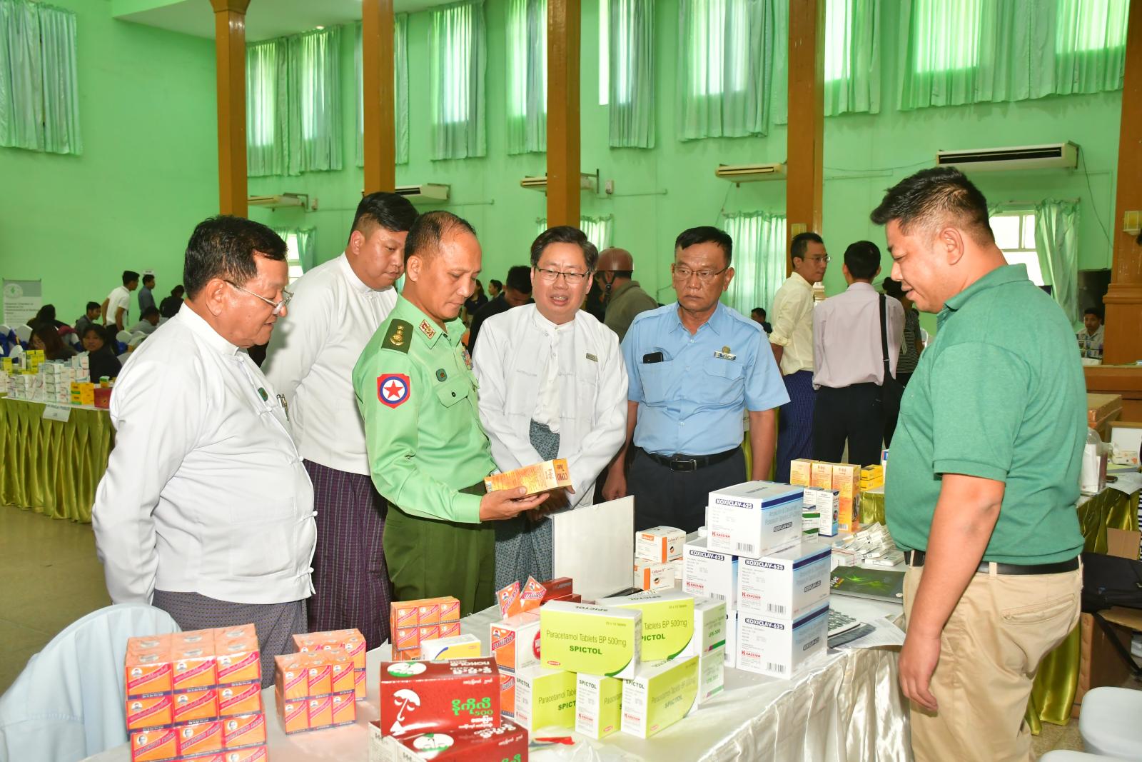 ဆေးဝါးဈေးနှုန်းတည်ငြိမ်စေရေးနှင့် ပြတ်လပ်မှုမရှိစေရန်ရည်ရွယ်၍ စီးပွားရေးနှင့်ကူးသန်းရောင်းဝယ်ရေးဝန်ကြီးဌာန၏လမ်းညွှန်မှု၊ နေပြည်တော်ကောင်စီ၏ပံ့ပိုးကူညီမှုဖြင့် မြန်မာနိုင်ငံဆေးနှင့် ဆေးပစ္စည်းလုပ်ငန်းရှင်များအသင်းမှ ဦးဆောင်ကာ ဒုတိယအကြိမ်မြောက် “ဆေးကုမ္ပဏီများမှ သုံးစွဲသူပြည်သူများအား ဆေးဝါးများတိုက်ရိုက်ရောင်းချပွဲ” ကို ပြည်ထောင်စုနယ်မြေ၊ နေပြည်တော် ပျဉ်းမနားမြို့နယ်၊ မင်္ဂလာကန်တော်ခန်းမတွင် ရောင်းချပေးနေမှုကို ယနေ့မွန်းလွဲပိုင်းတွင် နေပြည်တော်ကောင်စီဝင်များ ဖြစ်ကြသည့် ဗိုလ်မှူးကြီးရဲမိုး၊ ဦးမြင့်စိုးနှင့် တာဝန်ရှိသူများက သွားရောက် ကြည့်ရှုအားပေးသည်။