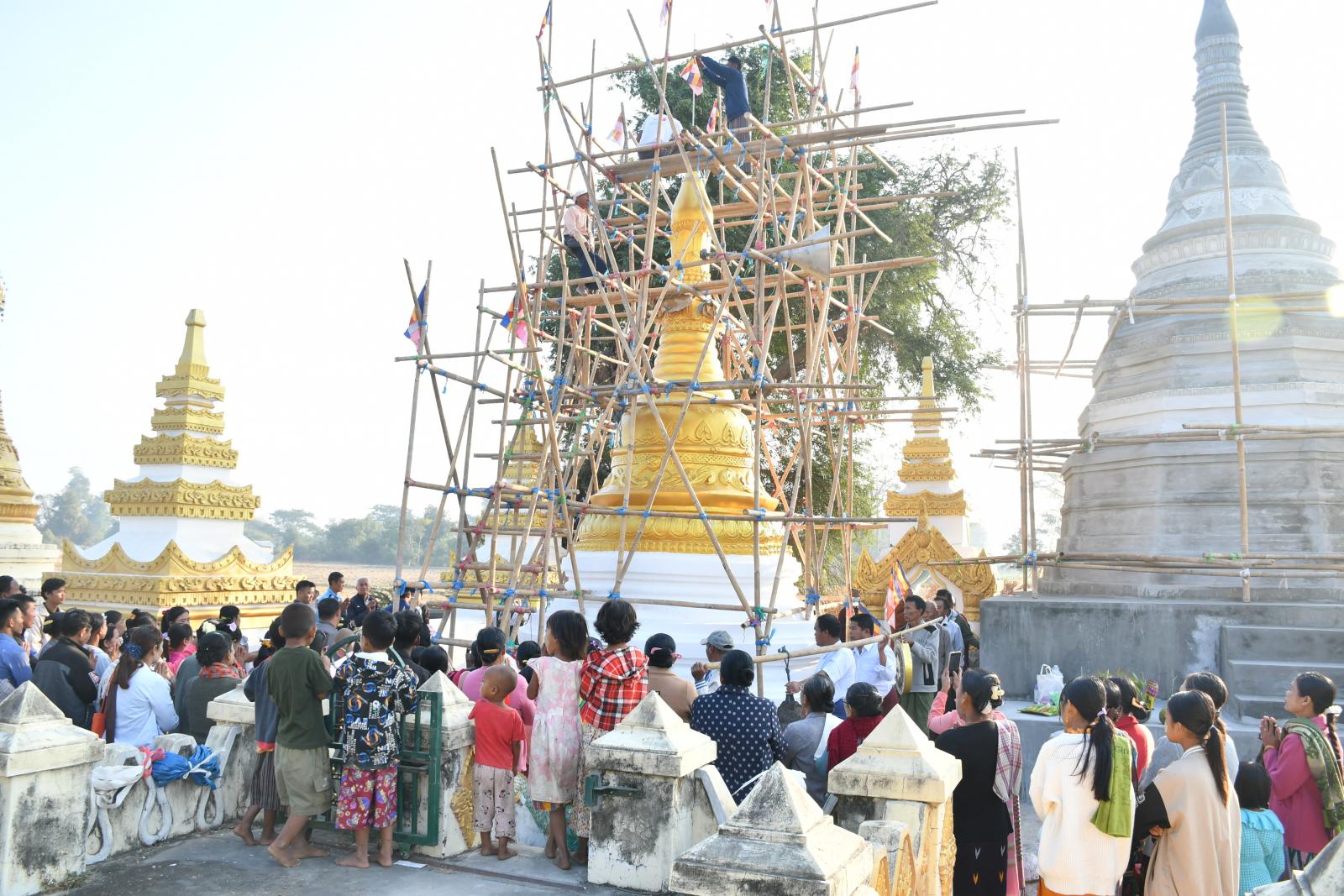 အဆိုပါစေတီ ထီးတော်တင်လှူပွဲသို့ အနော်ရထာရပ်ကွက်၊ မြို့ရှေ့စန္ဒာရုံကျောင်းတိုက်၊ ဘဒ္ဒန္တစန္ဒသီရိဆရာတော်မှူးပြု ဆရာတော်၊ သံဃာတော်များ ကြွရောက်တော်မူပြီး ထီးတော်ဒါယကာ၊ ဒါယိကာမများ၊ ရပ်နီးရပ်ဝေးမှ ပြည်သူများတက်ရောက်ပြီး စေတီတော်၏ ထီးတော်၊ ငှက်မြတ်နားတော်၊ စိန်ဖူးတော်များကို သတ်မှတ်အစီအစဉ်အတိုင်း တင်လှူပူဇော်ခဲ့သည်။