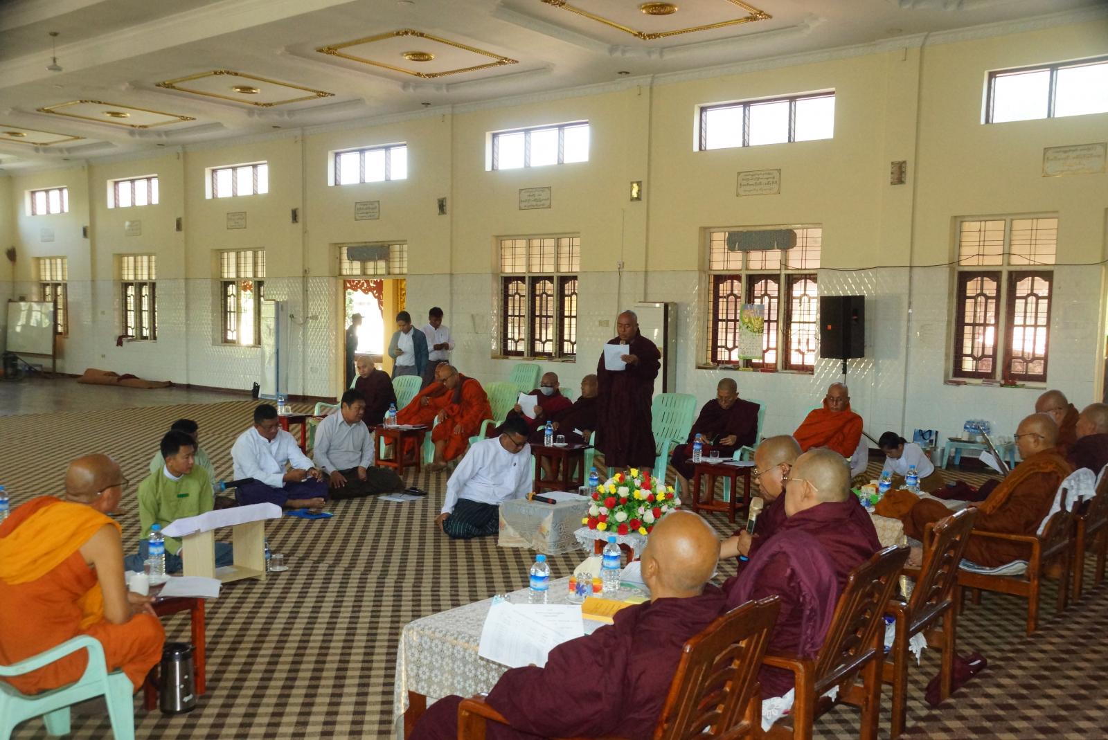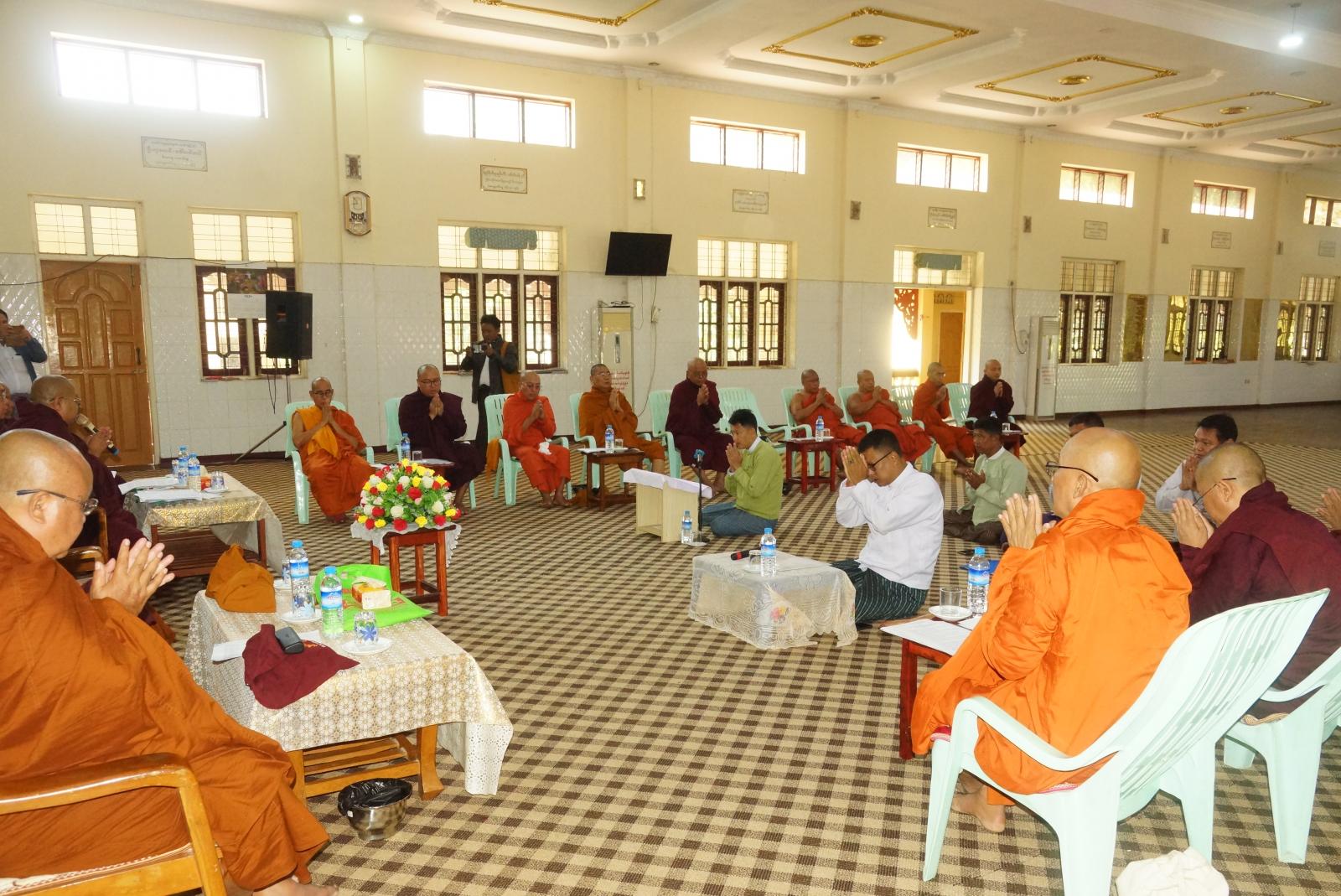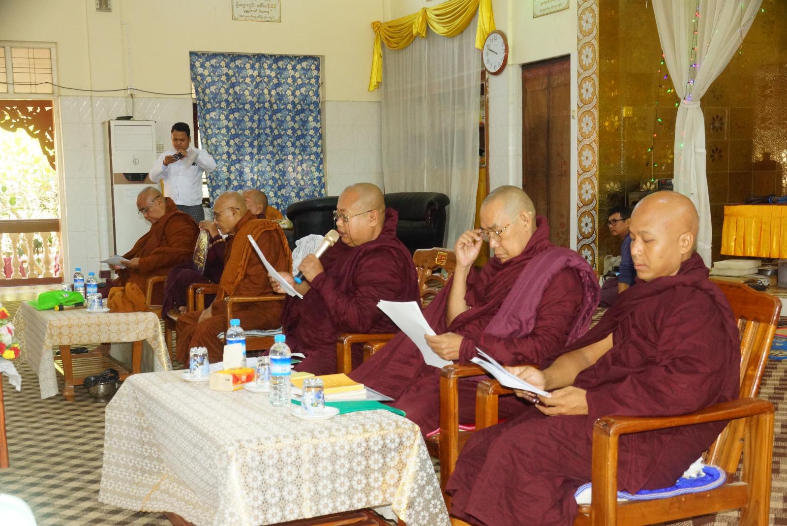 ရှေးဦးစွာ မြို့နယ်သံဃနာယကအဖွဲ့အနားယူခြင်းနှင့် ပြန်လည်ရွေးချယ်ခြင်းဆိုင်ရာ အစည်းအဝေးတွင်ကြီးကြပ်ရေးအဖွဲ့ အကျိုးတော်ဆောင် ဘဒ္ဒန္တဝါယမက အခမ်းအနားမှူး ဆရာတော်အဖြစ်ဆောင်ရွက်၍ ကြီးကြပ်ရေးအဖွဲ့ဥက္ကဋ္ဌ ဘဒ္ဒန္တဥက္ကံသက သဘာပတိအဖြစ် ဆောင်ရွက်ခဲ့ပြီး နမောတဿ သုံးကြိမ် ရွတ်ဆို ဘုရားကန်တော့ပြီး အစည်းအဝေး စတင်ကာ သဘာပတိဆရာတော်က ဩဝါဒကထာ မြွက်ကြားပြီးနောက် မြို့နယ်စီမံအုပ်ချုပ်ရေးအဖွဲ့ဥက္ကဋ္ဌ ဦးဇေနော်ဝင်းက သာသနာရေးဆိုင်ရာများ လျောက်ထားတင်ပြခဲ့သည်။ ထို့နောက် အခမ်းအနားမှူးဆရာတော်က အနားယူခြင်းဆိုင်ရာ လုပ်ငန်းစီမံချက်အရ အနားယူသော ဆရာတော်များ၏ ဘွဲ့အမည်စာရင်းကို ဖတ်ကြားကြေညာခဲ့သည်။
