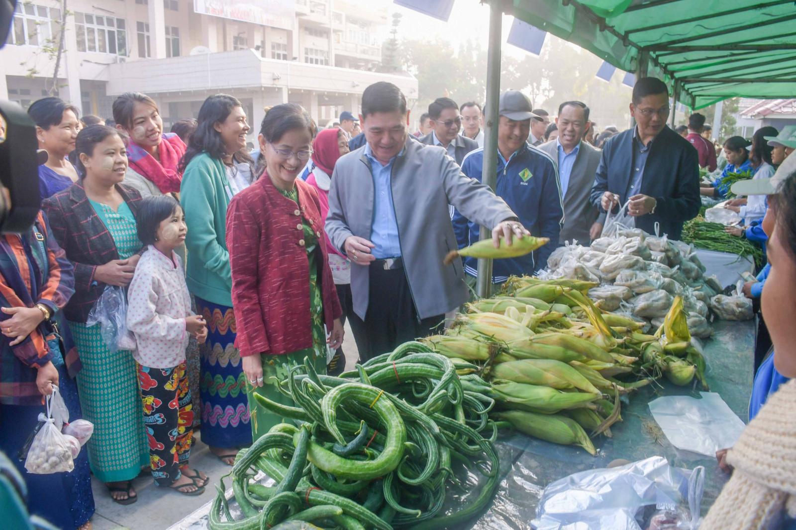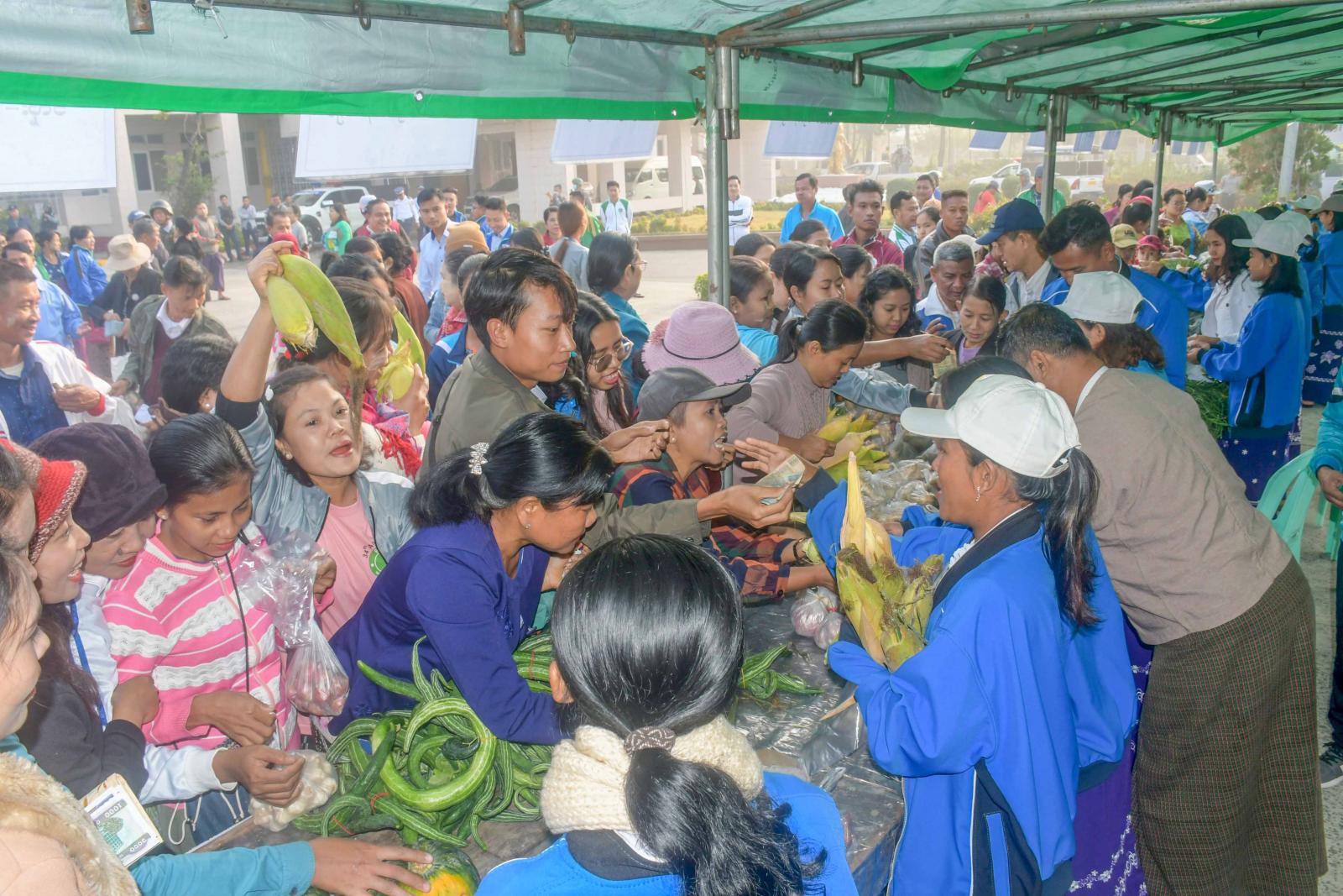 ဦးစွာ ပြည်နယ်ဝန်ကြီးချုပ် ဦးထိန်လင်းနှင့်အဖွဲ့သည် ဝန်ထမ်းများအား ရောင်းချပေးမည့် အခြေခံစားကုန်နှင့် သား၊ ငါး၊ ကြက်ဥ၊ ဟင်းသီးဟင်းရွက်များ ခင်းကျင်းထားရှိမှုကို လှည့်လည်ကြည့်ရှု အားပေးပြီး ဈေးဝယ်ရန် ရောက်ရှိလာကြသည့် ဝန်ထမ်းများအား ရင်းရင်းနှီးနှီး တွေ့ဆုံနှုတ်ဆက်ခဲ့သည်။ အလားတူ ပြည်နယ်ဝန်ကြီးချုပ်က အခြေခံစားသုံးကုန်များနှင့် သား၊ ငါးများ ပြတ်လပ်မှုမရှိစေရေးနှင့် ဈေးနှုန်းမြှင့်တင် ရောင်းချခြင်းမရှိစေရေးတို့ကို စိစစ်ကြပ်မတ်ဆောင်ရွက်သွားကြရန် တာဝန်ရှိသူများကို မှာကြားခဲ့သည်။