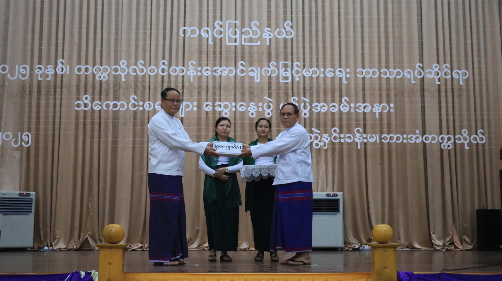 ထို့နောက် ပြည်နယ်ဝန်ကြီးချုပ်က အောင်ချက်မြင့်မားရေး ဘာသာရပ်ဆိုင်ရာ သိကောင်းစရာများဆွေးနွေးပွဲအတွက် ငွေကျပ် ၉၀၈၇၅၀ဝိ/- (ကိုးဆယ်သိန်းရှစ်သောင်းခုနှစ်ထောင်ငါးရာကျပ်) ကို ချီးမြှင့်ပေးအပ်ပြီး ဘားအံတက္ကသိုလ် ပါမောက္ခချုပ် ဒေါက်တာစိုးစိုးအေးနှင့် ပြည်နယ်ပညာရေးမှူးရုံး ညွှန်ကြားရေးမှူး ဦးစသိန်းကျော်တို့က ဆွေးနွေးပွဲအတွက် စီစဉ်ဆောင်ရွက်ထားရှိမှုနှင့် အောင်ချက်မြင့်မားရေး ဘာသာရပ်ဆိုင်ရာ သိကောင်းစရာများ ဆွေးနွေးပွဲအစီအစဉ်များကို ရှင်းလင်းတင်ပြကြသည်။