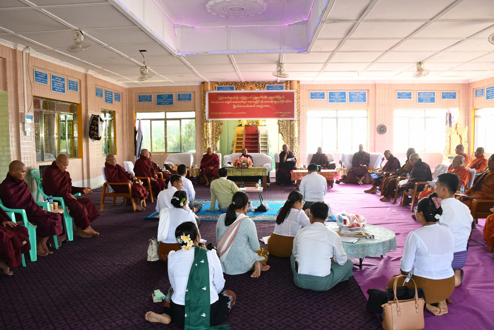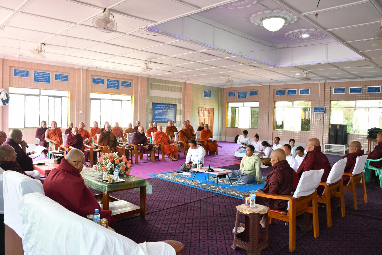ရှေးဦးစွာ မြို့နယ်သံဃနာယကအဖွဲ့ဝင် ဆရာတော်များ အနားယူခြင်းနှင့် အစားထိုးရွေးချယ်ခြင်းဆိုင်ရာ အစည်းအဝေးတွင် ကြီးကြပ်ရေးအဖွဲ့ အကျိုးတော်ဆောင် ဆရာတော်က အခမ်းအနားမှူး ဆရာတော်အဖြစ်ဆောင်ရွက်၍ ကြီးကြပ်ရေးအဖွဲ့ဥက္ကဋ္ဌက သဘာပတိအဖြစ် ဆောင်ရွက်ခဲ့ပြီး “နမောတဿ” သုံးကြိမ်ရွတ်ဆို ဘုရားကန်တော့ပြီး အစည်းအဝေးစတင်ကာ သဘာပတိဆရာတော်က ဩဝါဒကထာ မြွက်ကြားပြီးနောက် မြို့နယ်စီမံအုပ်ချုပ်ရေးအဖွဲ့ ဥက္ကဋ္ဌ ဦးရဲမြတ်သိန်းက သာသနာရေးဆိုင်ရာများ လျှောက်ထားတင်ပြခဲ့သည်။