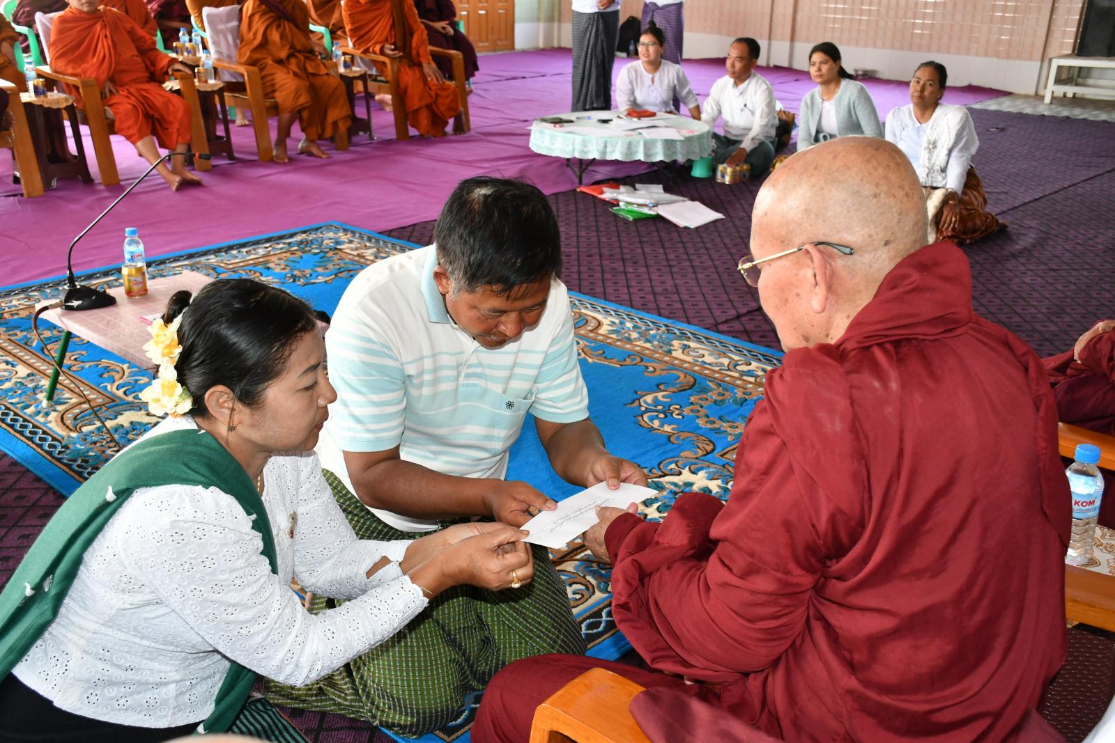 ဆက်လက်၍ နေပြည်တော် တိုင်းသံဃာ့ဝန်ဆောင်ဆရာတော်များအဖြစ် ဘဒ္ဒန္တကုဏ္ဍလ (အောင်သစ္စာ(လဲဝန်း)ကျောင်းတိုက်)နှင့် ဘဒ္ဒန္တတေဇောဘာသ (ရာဇဓာနီသာမဏေကျော် ကျောင်းတိုက်) ဆရာတော်တို့အား ရွေးချယ်၍ အခမ်းအနားကို “ဗုဒ္ဓသာသနံစိရံတိဋ္ဌတု” သုံးကြိမ် ရွတ်ဆို၍ ရုပ်သိမ်းခဲ့ပြီး အခမ်းအနားတက်ရောက်လာကြသည့် ဆရာတော်များအား မြို့နယ်စီမံအုပ်ချုပ်ရေးအဖွဲ့နှင့် အလှူရှင်များမှ နဝကမ္မအလှူတော်ငွေများ ဆက်ကပ်လှူဒါန်း ခဲ့ကြောင်း သိရသည်။