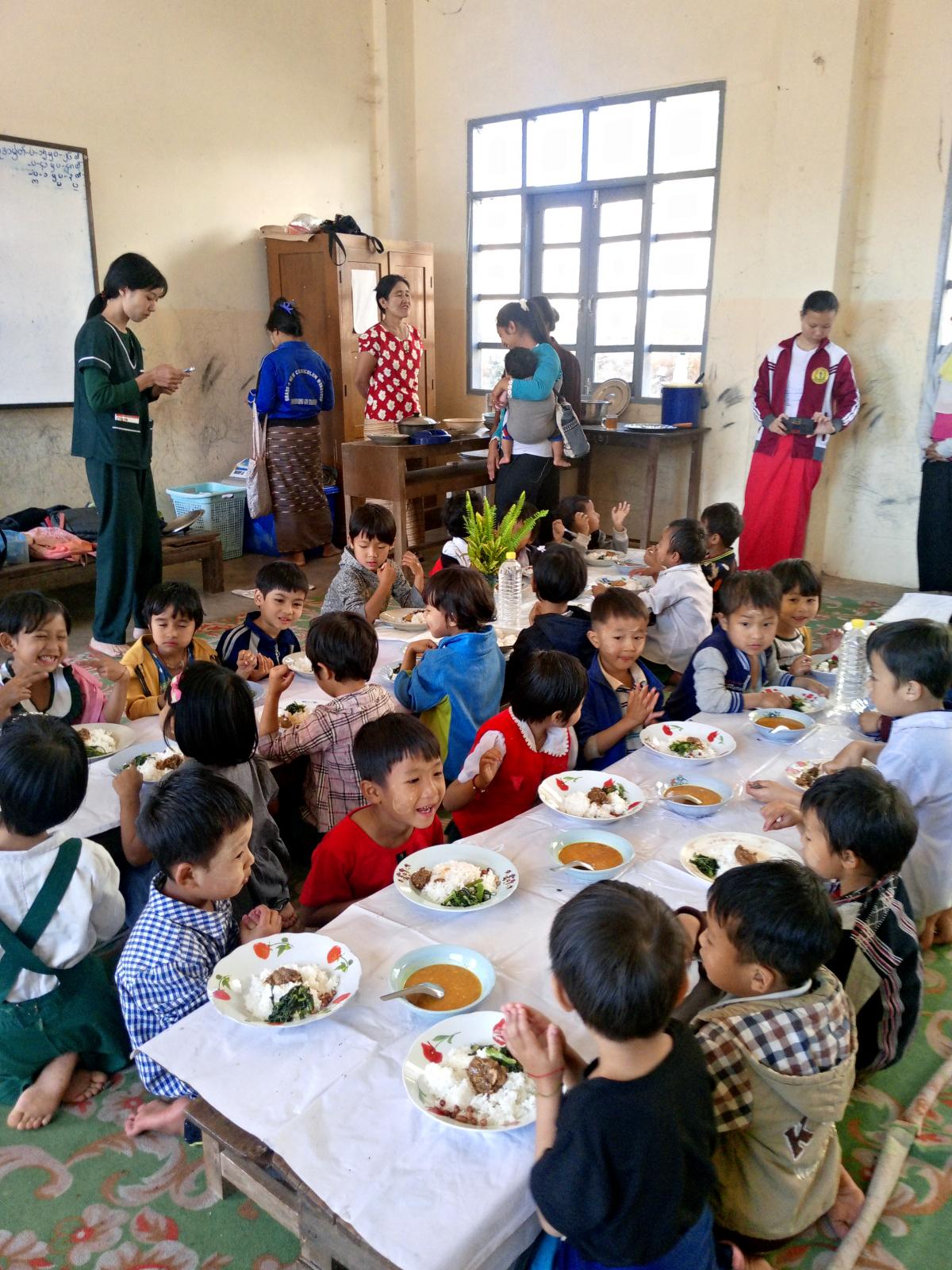 ထိုကဲ့သို့ အာဟာရကျွေးမွေးခြင်းကို ကျောင်းနေအရွယ်ကလေးများ အာဟာရဖွံ့ဖြိုးတိုးတက်ရေး အစီအစဉ်ဖြင့် KG တန်း ကျောင်းသား၊ ကျောင်းသူများကို ကျွေးမွေးခြင်းဖြစ်ပြီး ကျောင်းအုပ်ဆရာမကြီး ဒေါ်လိုအေးနှင့်ဆရာမများက ထမင်း၊ ကြက်ဉနှင့်အသီးအနှံများကို ပြင်ဆင်ချက်ပြုတ်ကျွေးမွေးခဲ့ကြောင်းနှင့် အဆိုပါ အာဟာရကျွေးမွေးခြင်းကို ယခုကဲ့သို့ဒုတိယအကြိမ် ကျွေးမွေးခြင်းဖြစ်ကြောင်း ကျောင်းအုပ်ဆရာမကြီးထံမှ သိရသည်။