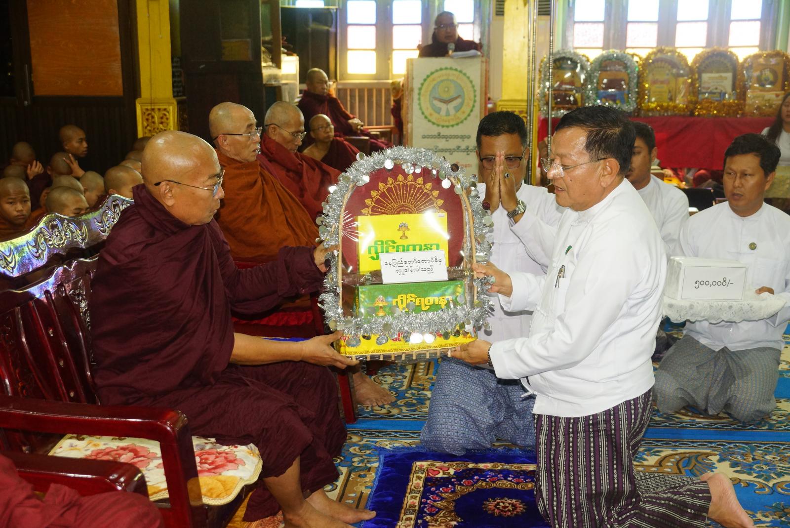 ထို့နောက် နေပြည်တော်ကောင်စီဝင် ဦးမြင့်စိုးက သာသနာရေးဆိုင်ရာများ လျှောက်ထားတင်ပြခဲ့သည်။ ဆက်လက်၍ နေပြည်တော်ကောင်စီဝင် ဦးမြင့်စိုးသည် နေပြည်တော် တိုင်းသံဃနာယကအဖွဲ့ဝင်၊ မဟာဝိသုတာရာမဈေးကုန်းကျောင်းတိုက်ကြီး၏ ပဓာန နာယကဆရာတော်၊ အဂ္ဂမဟာပဏ္ဍိတ၊ အဂ္ဂမဟာဂန္ထဝါစကပဏ္ဍိတ၊ ဘဒ္ဒန္တစန္ဒေါ ဘာသထံ လှူဖွယ်ဝတ္ထုပစ္စည်းများနှင့် နဝကမ္မအလှူတော်ငွေများ ဆက်ကပ်လှူဒါန်းသည်။