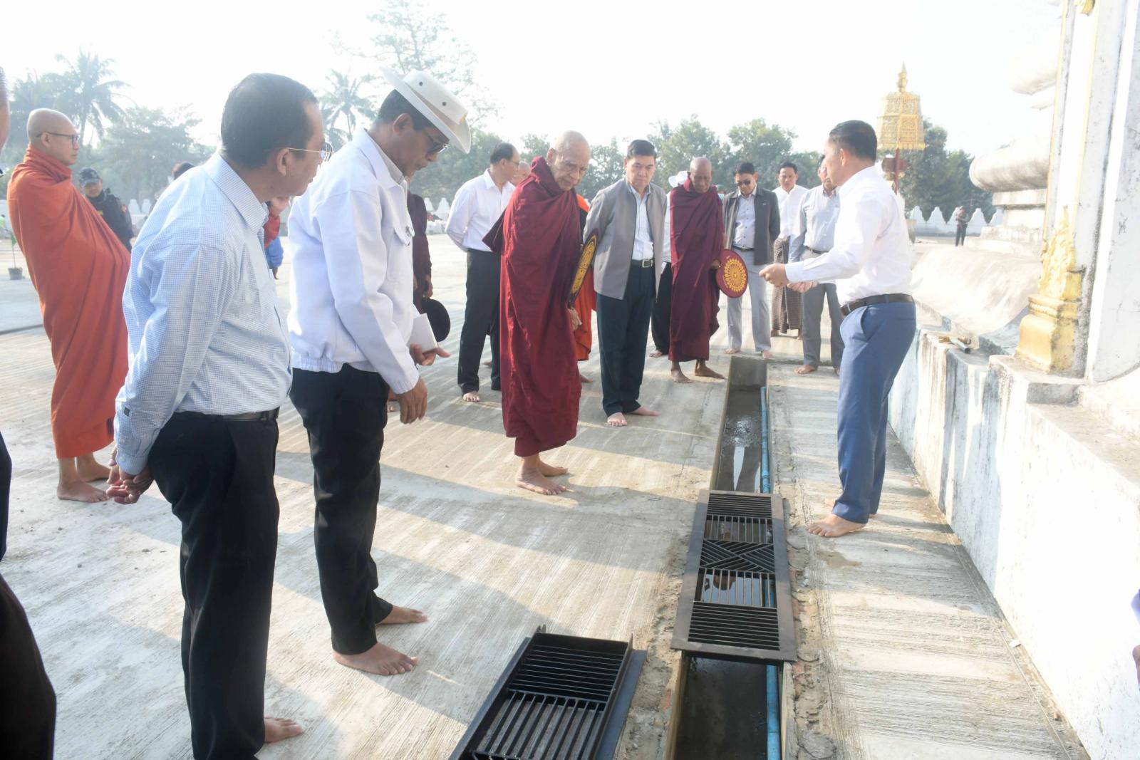 ထို့နောက် ပြည်နယ်လမ်းပန်းဆက်သွယ်ဝန်ကြီးက သံဃာတော်အရှင်သူမြတ်များနှင့် ပြည်နယ် ဝန်ကြီးချုပ်တို့အား လောကာနန္ဒာစေတီတော်မြတ်ကြီးရင်ပြင်တော်၌ ဆိုလာစနစ်ဖြင့် လျှပ်စစ်မီး ပူဇော်နိုင်ရန်စီစဉ်ဆောင်ရွက်နေမှု၊ နေပူခံကျောက်ပြားခင်းခြင်းလုပ်ငန်း ဆောင်ရွက်နိုင်ရန်အတွက် မြေကြီးပြုပြင်ခြင်းလုပ်ငန်း၊ ရေနှုတ်မြောင်းများပြုလုပ်ခြင်းလုပ်ငန်း၊ Compartment Wall ပြုလုပ်ခြင်းနှင့် သဲဖြည့်ရေလောင်းသိပ်သည်း အောင်ပြုလုပ်ခြင်းလုပ်ငန်းများ၊ အောက်ခံကွန်ကရစ်ခင်းခြင်း လုပ်ငန်းများ၊ ကျောက်ပြားကပ်ရန်ကြမ်းခင်းအမာခံ ပြုလုပ်ခြင်းလုပ်ငန်းများ၊ ကျောက်ပြားများဖြတ်ညှိခြင်းလုပ်ငန်းများ ဆောင်ရွက်ပြီးစီးကာ နေပူခံကျောက်ပြားခင်းခြင်းလုပ်ငန်းများ ဆောင်ရွက်နေမှုတို့ကို လိုက်လံရှင်းလင်း လျှောက်ထားတင်ပြသည်။