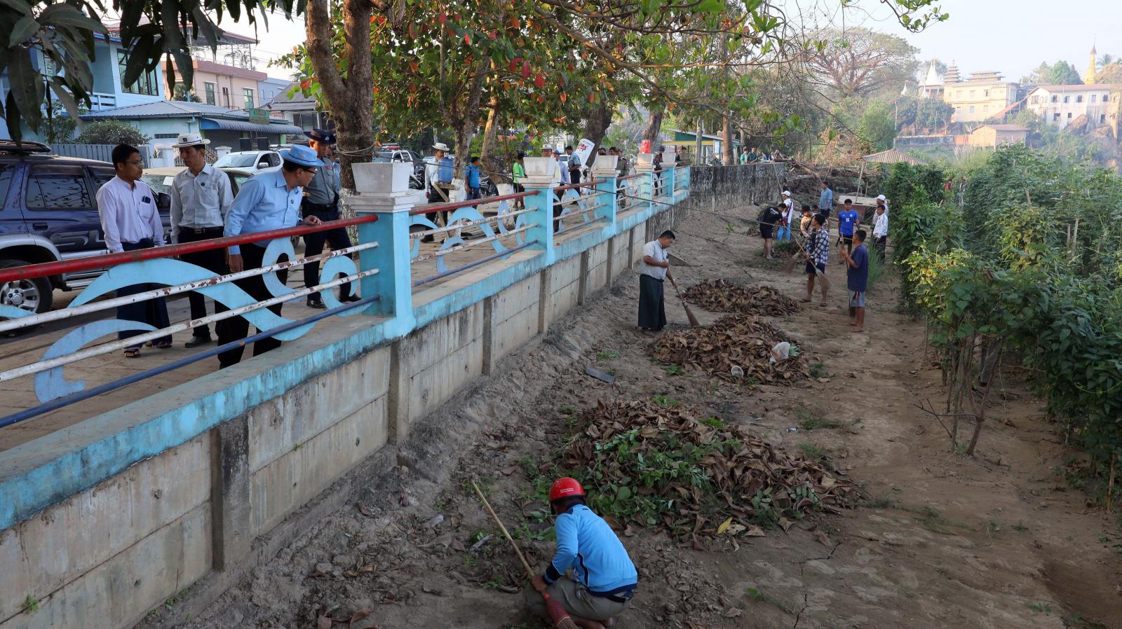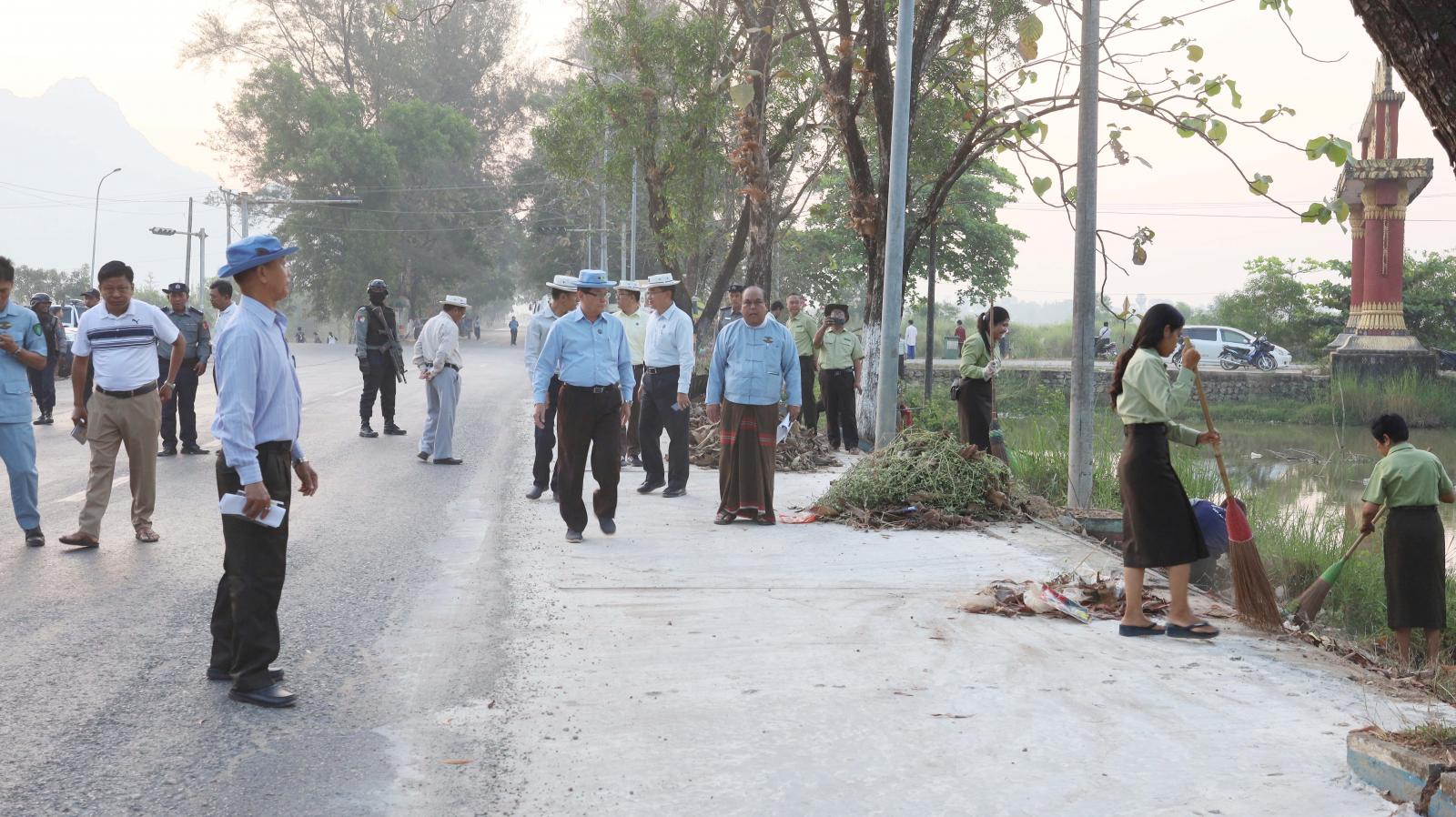 ကရင်ပြည်နယ်ဝန်ကြီးချုပ်ဦးစောမြင့်ဦး၊ ပြည်နယ်အစိုးရအဖွဲ့ဝင်များနှင့် ပြည်နယ်အဆင့်ဌာနဆိုင်ရာအကြီးအကဲများသည် ဘားအံမြို့အဝင် သံလွင်တံတားချည်းကပ်လမ်းထိပ်မှ ကမ်းနားလမ်းတစ်လျှောက်တွင် မြန်မာနိုင်ငံရဲတပ်ဖွဲ့၊ မီးသတ်တပ်ဖွဲ့၊ ဌာနဆိုင်ရာဝန်ထမ်းများနှင့် ရပ်ကွက်နေပြည်သူများ စုစုပေါင်းအင်အား ၁၁၅၅ ဦးခန့်ပူးပေါင်း၍ ပလတ်စတစ်နှင့်စွန့်ပစ်အမှိုက်များ ဖယ်ရှားရှင်းလင်းခြင်း၊ ချုံနွယ်ပိတ်ပေါင်းများ ခုတ်ထွင်ရှင်းလင်းခြင်း၊ သစ်ပင်ကြီးများ၏အကိုင်းအခက်များအား ရှင်းလင်းခြင်း၊ ရေနုတ်မြောင်းများရေစီးရေလာကောင်းမွန်စေရေးရှင်းလင်းခြင်း၊ မီးသတ်ကားဖြင့် ရေဆေးကြောသန့်စင်ခြင်းများကို အမှိုက်သိမ်းယာဉ်များ၊ မြက်ဖြတ်စက်များစသည်ဖြင့် ယာဉ်ယန္တရားများအသုံးပြု၍ စုပေါင်းသန့်ရှင်းရေးလုပ်ငန်းဆောင်ရွက်နေမှုများကို လှည့်လည်ကြည့်ရှုအားပေးပြီး တာဝန်ရှိသူများအား လိုအပ်သည်များမှာကြားခဲ့သည်။