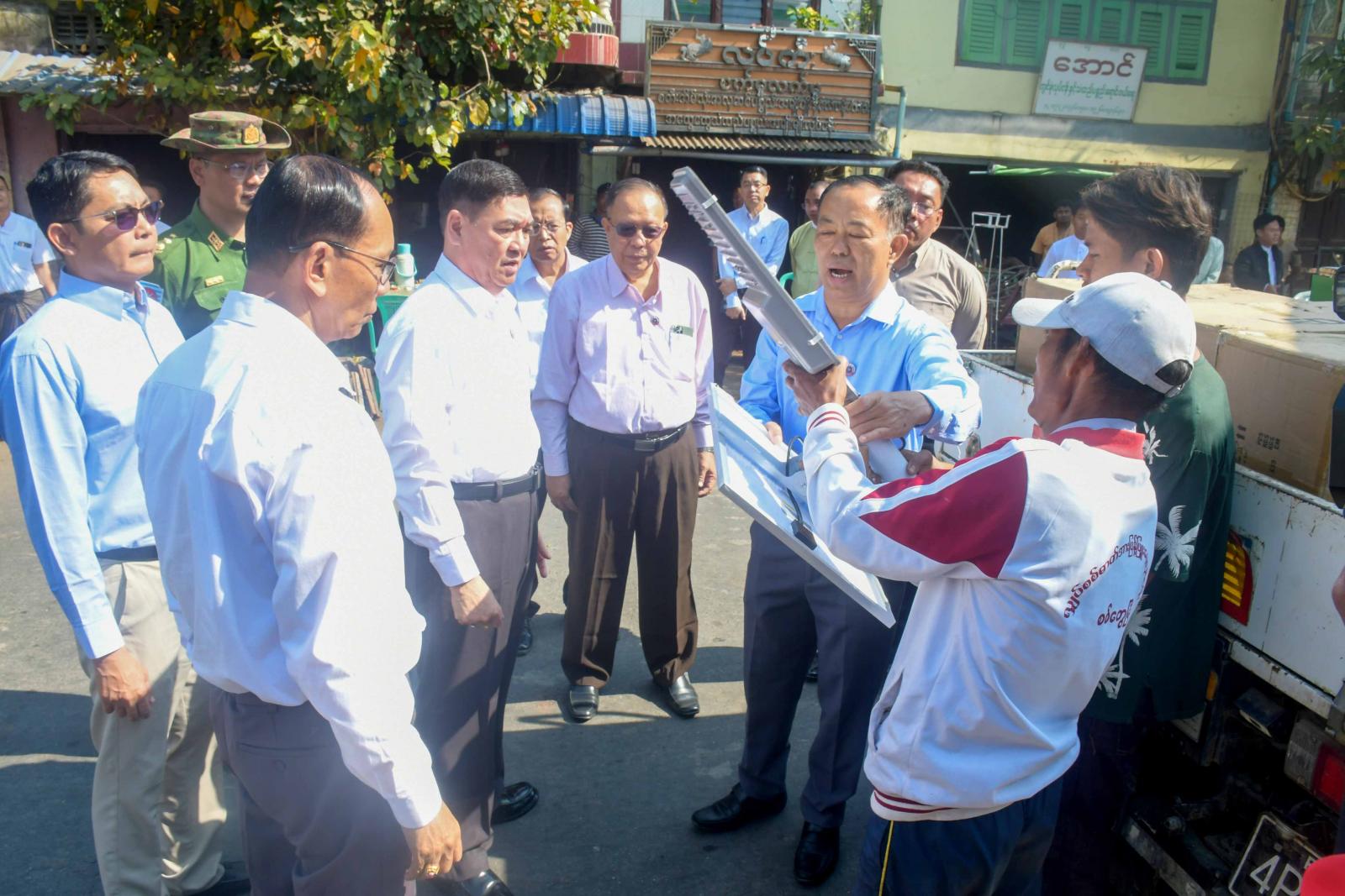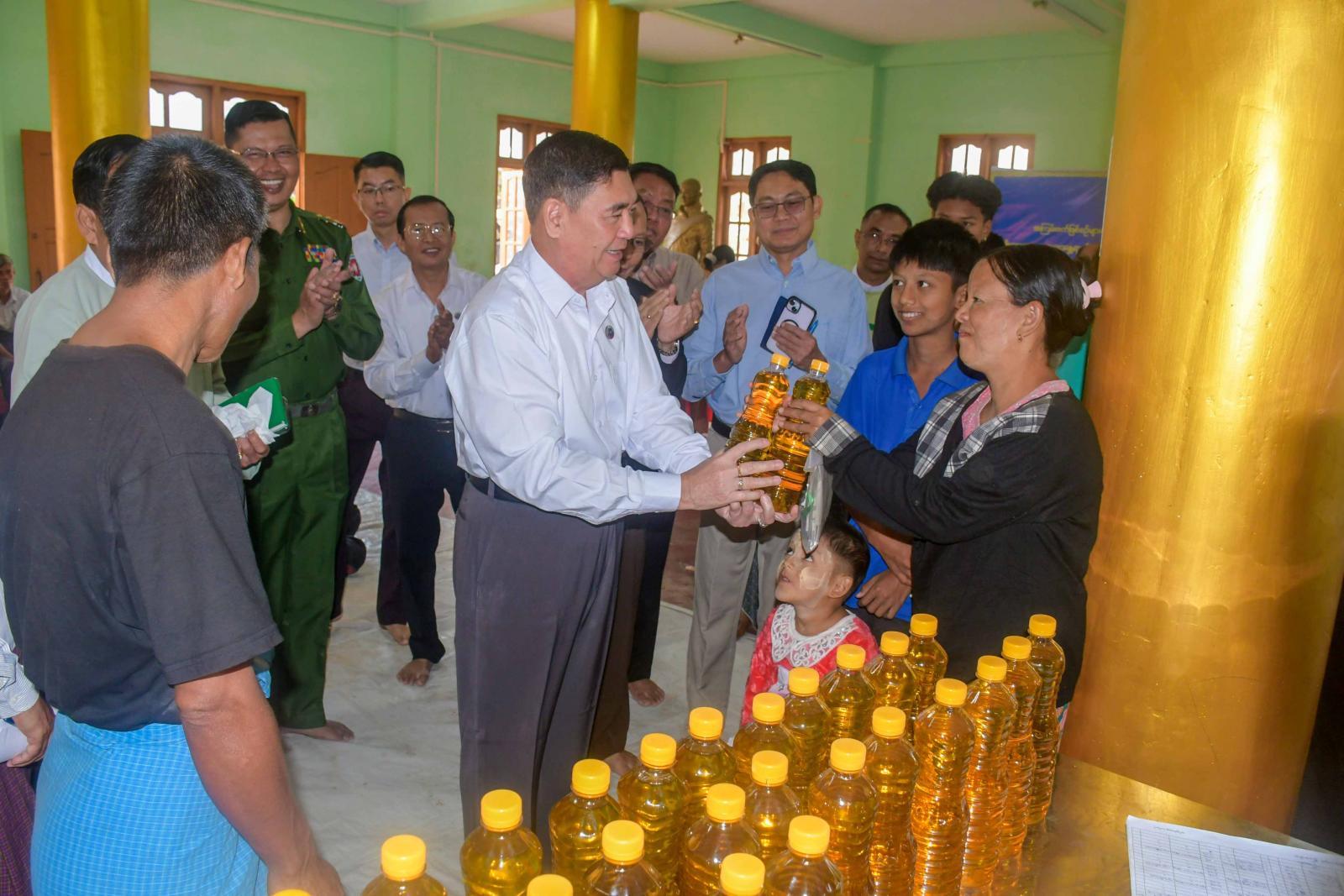 ယင်းနောက် ပြည်နယ်ဝန်ကြီးချုပ်နှင့်အဖွဲ့သည် ကျောင်းတိုက်အတွင်းရှိ ယာယီနေရပ်စွန့်ခွာပြည်သူများအား စခန်းတာဝန်ခံများက အမျိုးသားသဘာဝဘေးအန္တရာယ်စီမံခန့်ခွဲမှု ရန်ပုံငွေမှ တစ်ဦးလျှင် (၁)လ ငွေကျပ် (၂၀၀၀၀) နှုန်းဖြင့် ပေးအပ်သည့် ထောက်ပံ့ငွေများအား ပေးအပ်နေမှုကို ကြည့်ရှုအားပေးကြပြီး နယ်စပ်ရေးရာဝန်ကြီးဌာနမှ ပေးအပ်ချီးမြှင့်သည့် စားသုံးဆီများအား ဖြန့်ဝေပေးခဲ့ကြသည်။ ဆက်လက်၍ နိုင်ငံတော်မှပေးအပ်ချီးမြှင့်သည့် ဆန်ဖြန့်ဝေပေးနေမှုတို့ကို လှည့်လည်ကြည့်ရှုစစ်ဆေးကြပြီး ပြည်သူများအား ရင်းရင်းနှီးနှီးလိုက်လံနှုတ်ဆက် အားပေးစကားပြောကြားခဲ့သည်။