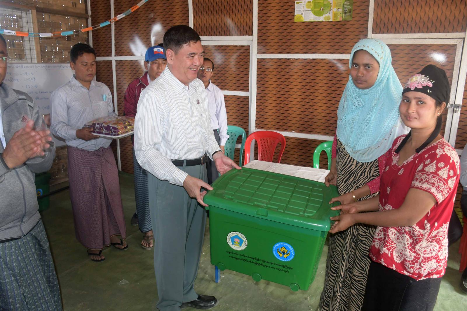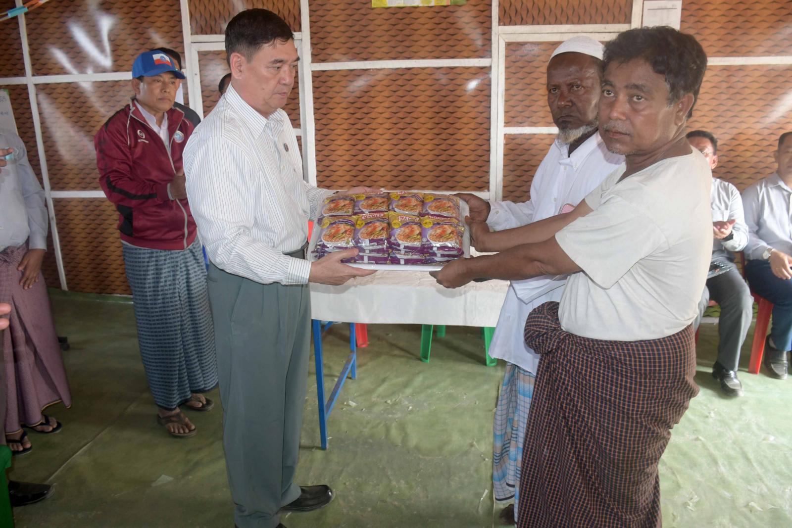 ဆက်လက်၍ ပြည်နယ်ဝန်ကြီးချုပ်နှင့် ပြည်နယ်အစိုးရအဖွဲ့ဝင်များ၊ ဌာနဆိုင်ရာတာဝန်ရှိသူများက ရခိုင်ပြည်နယ်အစိုးရအဖွဲ့နှင့် ဘေးအန္တရာယ်ဆိုင်ရာစီမံခန့်ခွဲမှုဦးစီးဌာနမှ ထောက်ပံ့ပေးအပ်သည့် မီးဘေးသင့်အိမ်ထောင်စုများအတွက် မိုးကာတဲများ၊ မိသားစုသုံးကယ်ဆယ်ရေးပစ္စည်း (၁၆) မျိုးပါ ပုံးများ၊ ရေဘူး၊ ဆန်ရိက္ခာ တစ်လစာအတွက် ငွေကျပ် ၁၈၀၀၀၀၀၀ တို့ကို ပေးအပ်ကြသည်။