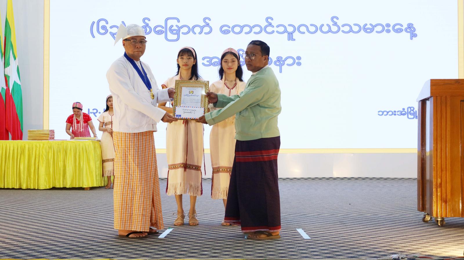 ဦးစွာ ပြည်ထောင်စုသမ္မတမြန်မာနိုင်ငံတော်၊ နိုင်ငံတော်စီမံအုပ်ချုပ်ရေးကောင်စီဥက္ကဋ္ဌ နိုင်ငံတော်ဝန်ကြီးချုပ် ဗိုလ်ချုပ်မှူးကြီးသတိုးမဟာသရေစည်သူ သတိုးသီရိသုဓမ္မမင်းအောင်လှိုင်ထံမှ တောင်သူလယ်သမားနေ့အခမ်းအနားသို့ ပေးပို့သည့်သဝဏ်လွှာကို ကရင်ပြည်နယ်ဝန်ကြီးချုပ် သီရိပျံချီဦးစောမြင့်ဦးက ဖတ်ကြားပြီး ပြည်နယ်ဝန်ကြီးချုပ်နှင့်တာဝန်ရှိသူများက ပြည်နယ်အတွင်း သီးနှံစိုက်စွမ်းအားထူးချွန်ဆု၊ မိုးစပါးသီးနှံ၊ အစေ့ထုတ်ပြောင်းသီးနှံ၊ မြေပဲ သီးနှံ၊ နှမ်းသီးနှံ၊ ပဲတီစိမ်းသီးနှံ၊ မတ်ပဲသီးနှံ၊ ပဲပုတ်သီးနှံ၊ ကြံသီးနှံနှင့် ဟင်းသီးဟင်းရွက်ထူးချွန်တောင်သူများ၊ နွားမွေးမြူရေး၊ ဥစားကြက်မွေးမြူရေး၊ အသားတိုးကြက်မွေးမြူရေး၊ အသားတိုးဝက်မွေးမြူရေး၊ ဆိတ်မွေးမြူရေး၊ ဘဲမွေးမြူရေးလုပ်ငန်းများတွင် မွေးမြူရေးထူးချွန်ဆုရရှိသူများ ဂုဏ်ပြုဆုများပေးအပ်ချီးမြှင့်ကြရာ စိုက်ပျိုးရေးထူးချွန်ဆုရရှိသူတစ်ဦးနှင့် မွေးမြူရေးထူးချွန်ဆုရရှိသူတစ်ဦးတို့က ကျေးဇူးတင်စကားပြန်လည်ပြောကြားသည်။